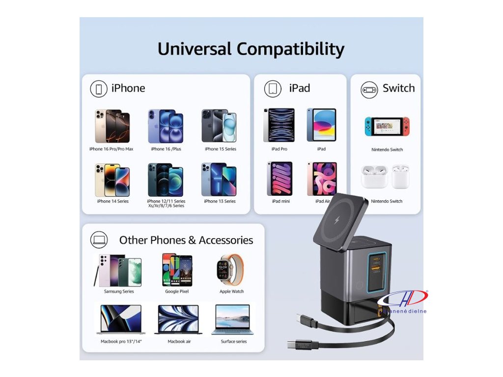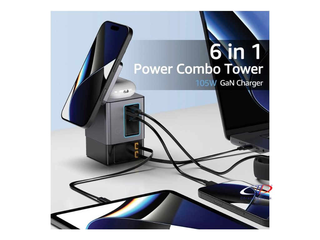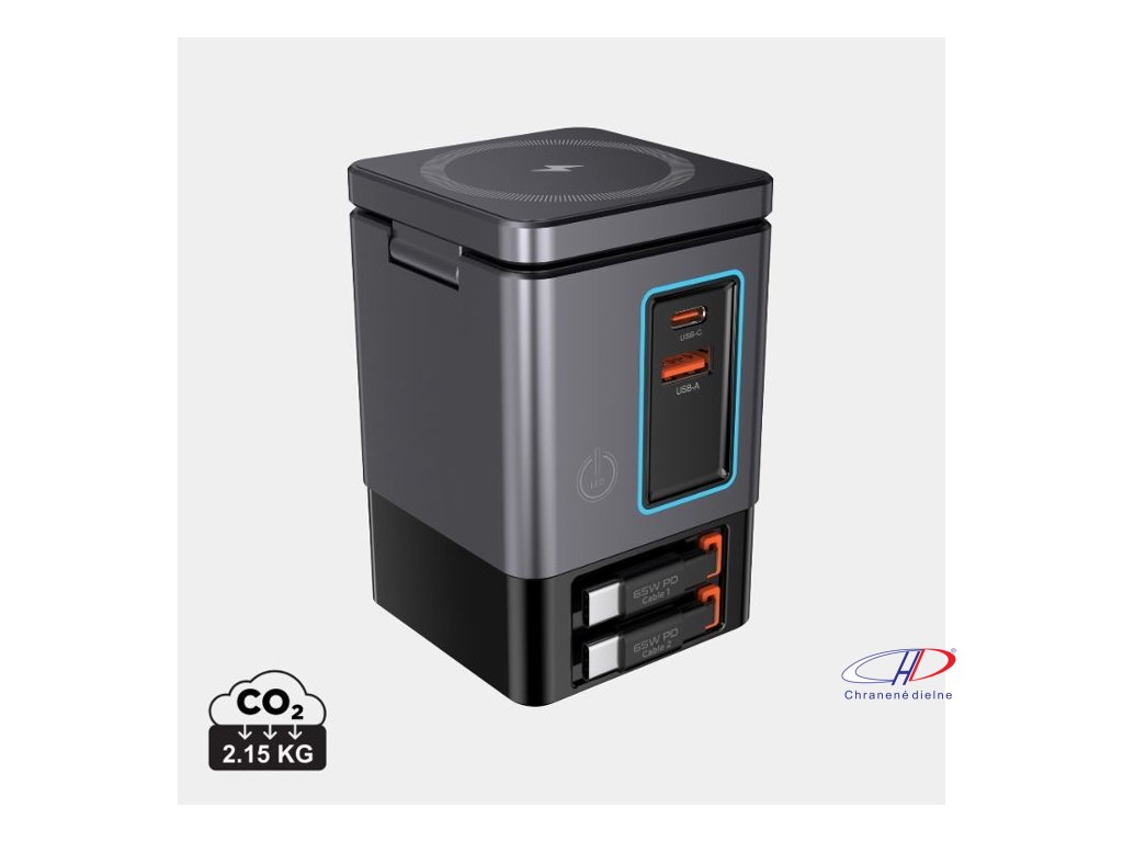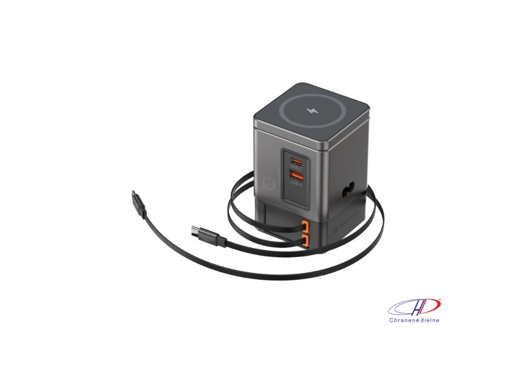 105W GaN nabíjacia stanica má dve integrované 65W USB-C navíjacie káble. USB-C a USB-A porty pre nabíjanie 4 zariadení súčasne. 15W magnetická nabíjačka na mobil, nabíjacia podložka 5W pre menšie predmety.Dodatočné parametre