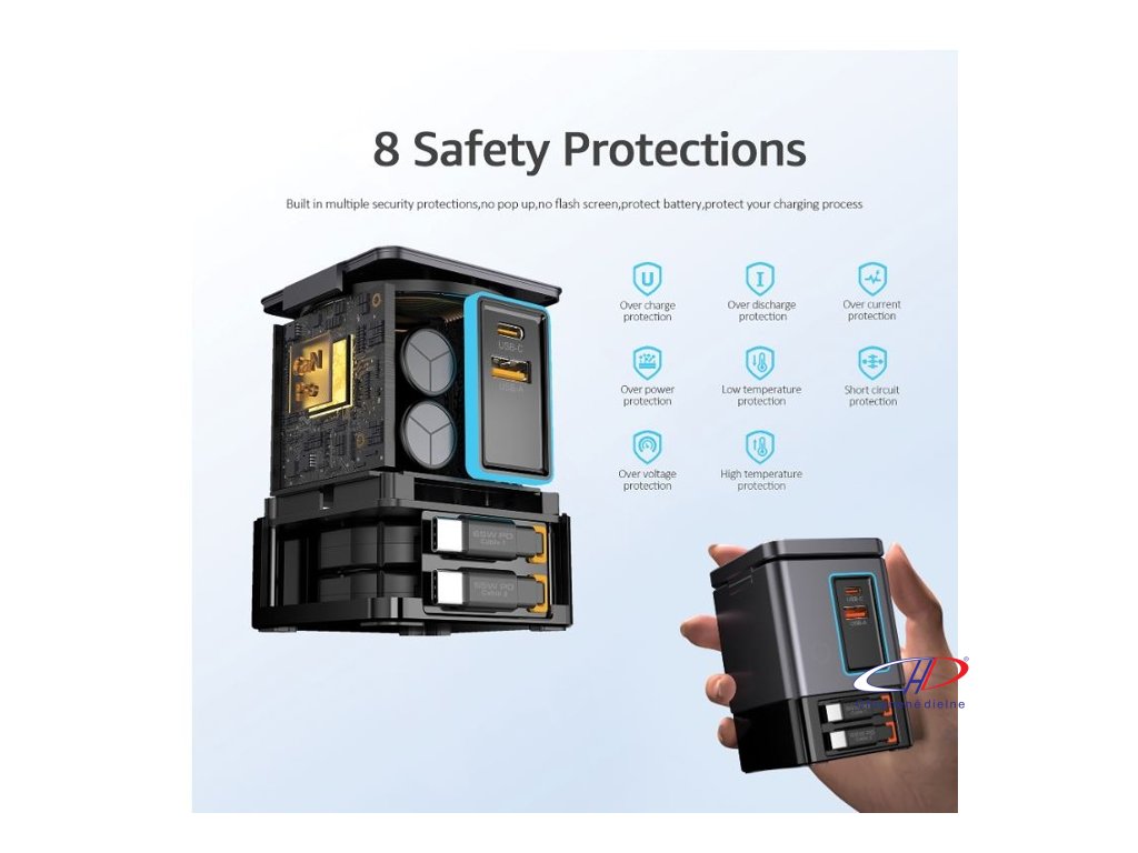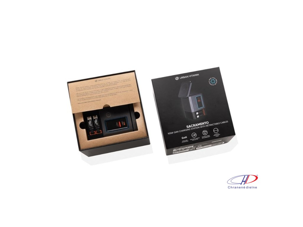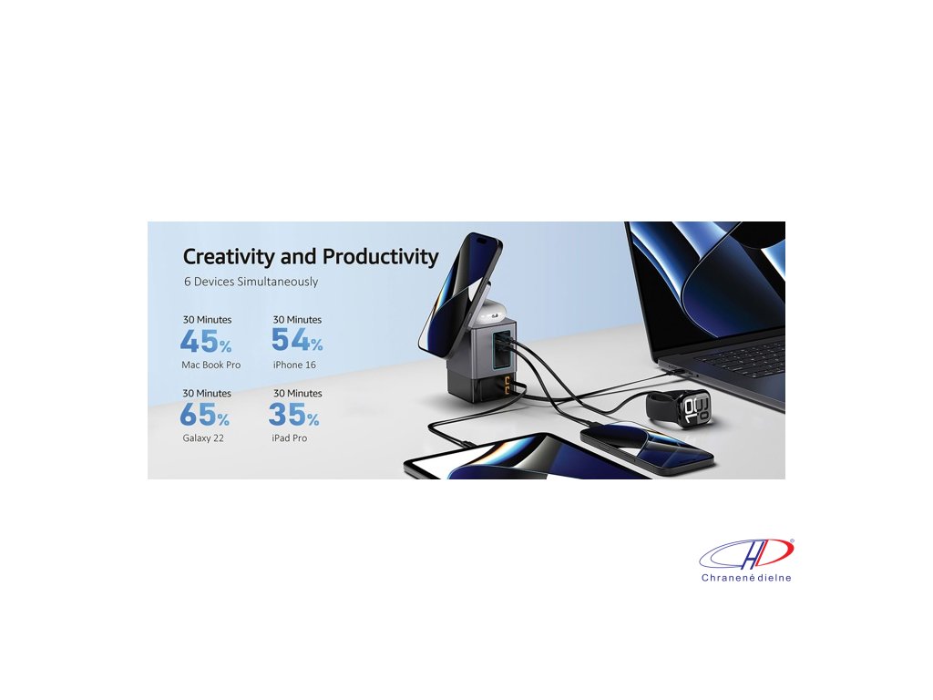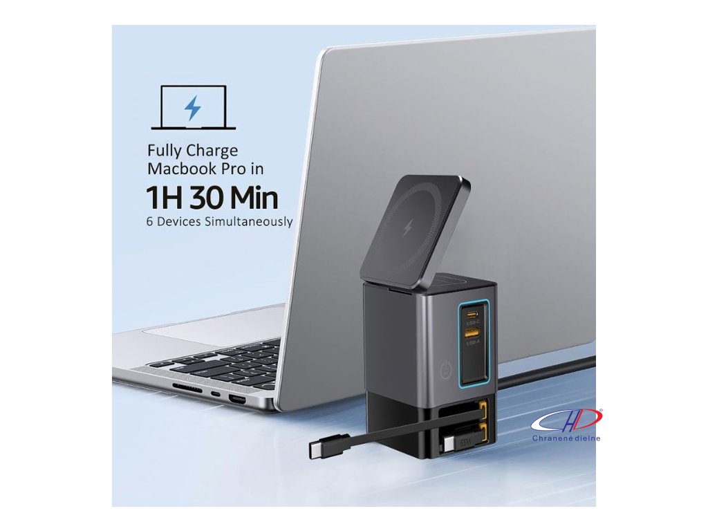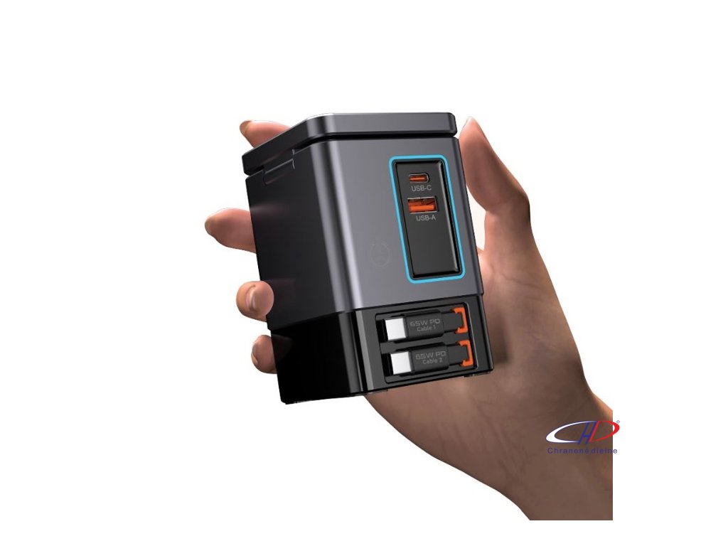 105W GaN nabíjacia stanica má dve integrované 65W USB-C navíjacie káble. USB-C a USB-A porty pre nabíjanie 4 zariadení súčasne. 15W magnetická nabíjačka na mobil, nabíjacia podložka 5W pre menšie predmety.Dodatočné parametre