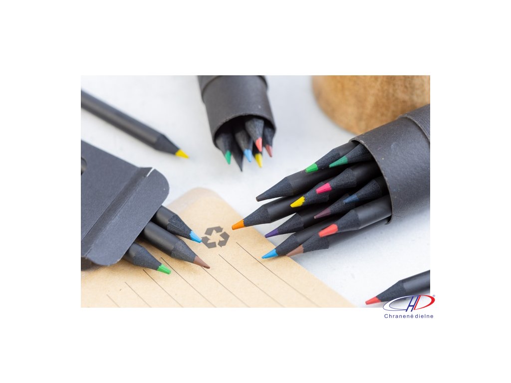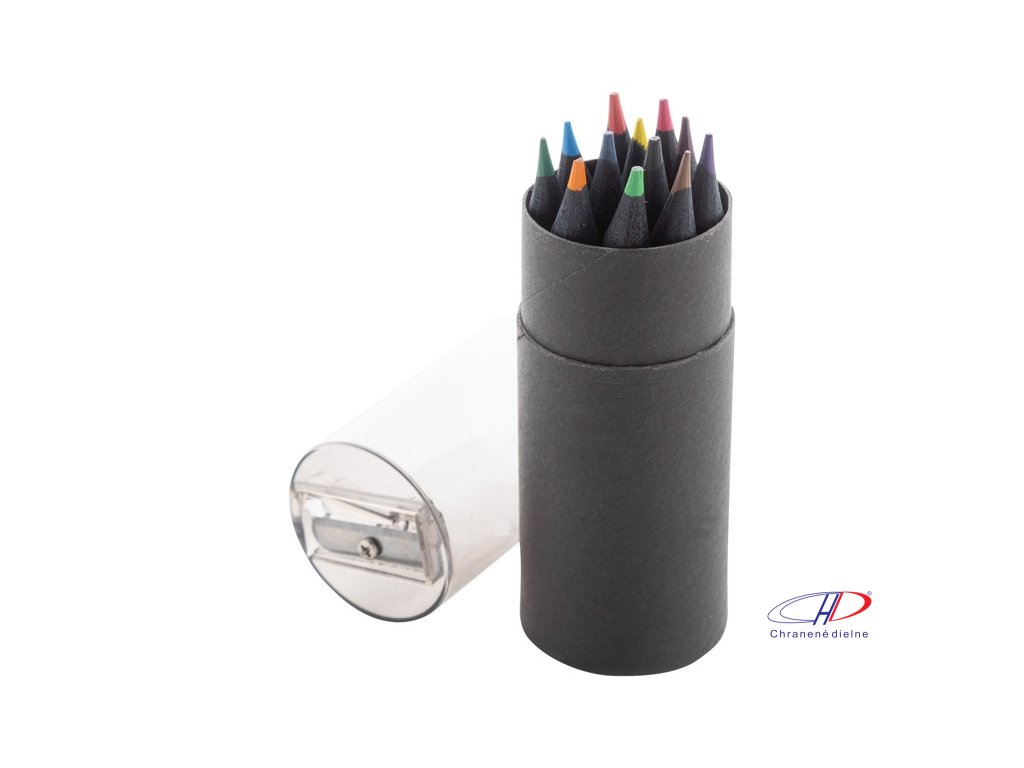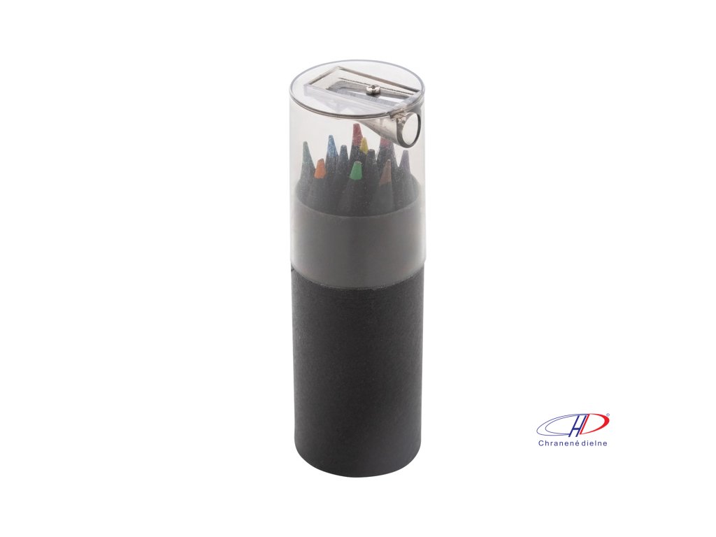 12dielna sada pasteliek z čierneho dreva v okrúhlom čiernom puzdre z kartónu s plastovým strúhadlom.Dodatočné parametre
