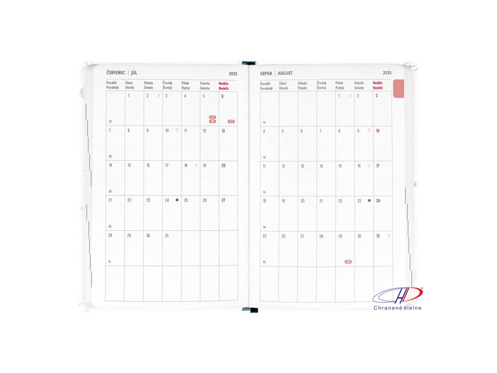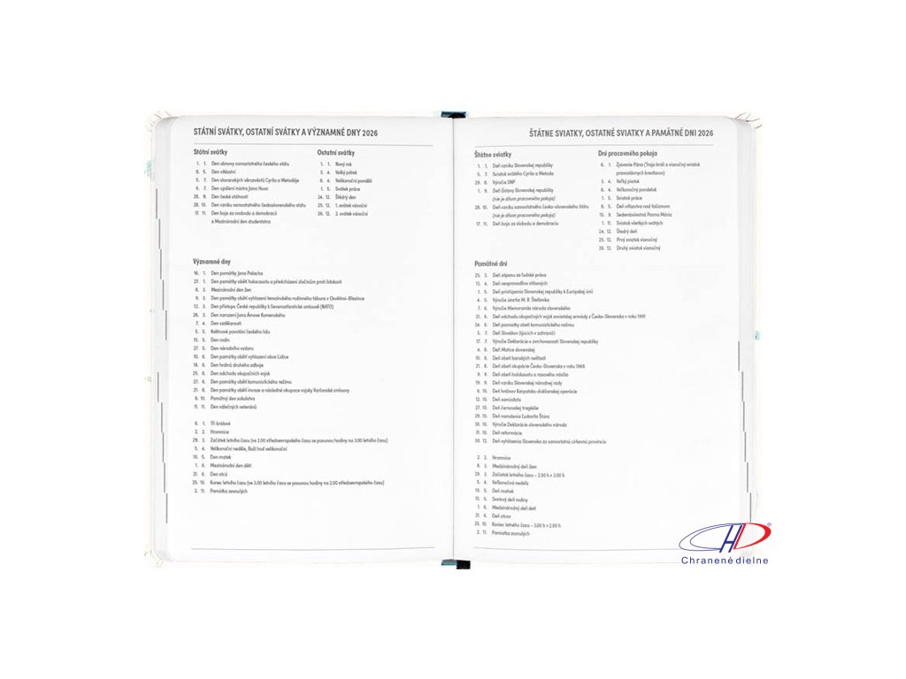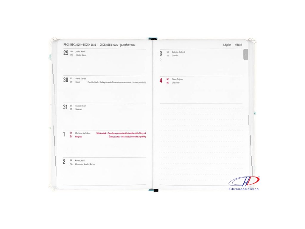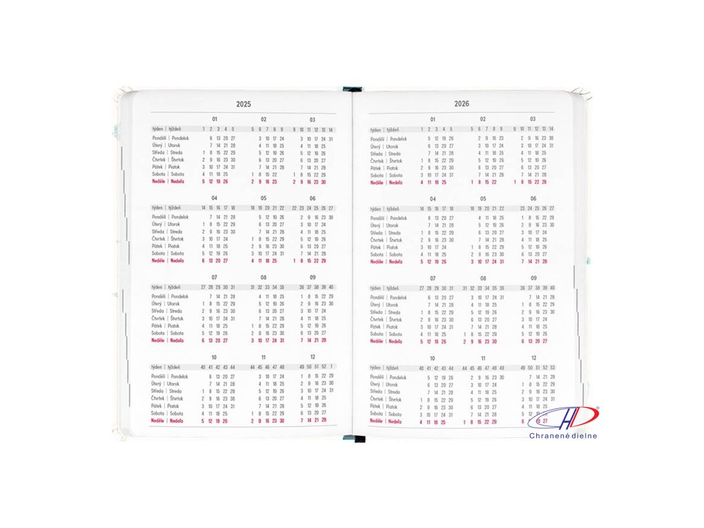 MINIMÁLNY ODBER 3 kusy. Väzba: tuhá knižná. Kalendárium: týždenné 18 mesačné 2 jazyčné (CZ, SK). 192 strán. 18-mesačný diár (jún 2025- december 2026) obsahuje prehľad na rok 2025 a 2026, zoznam mien, kalendárium s menami a sviatkami a priestor na poznámkyDodatočné parametre