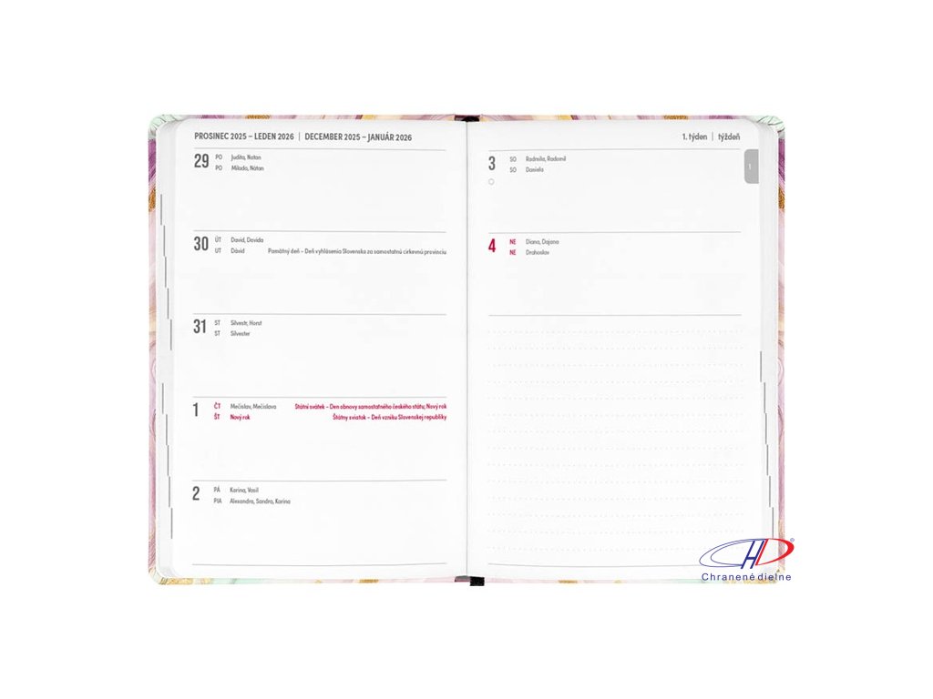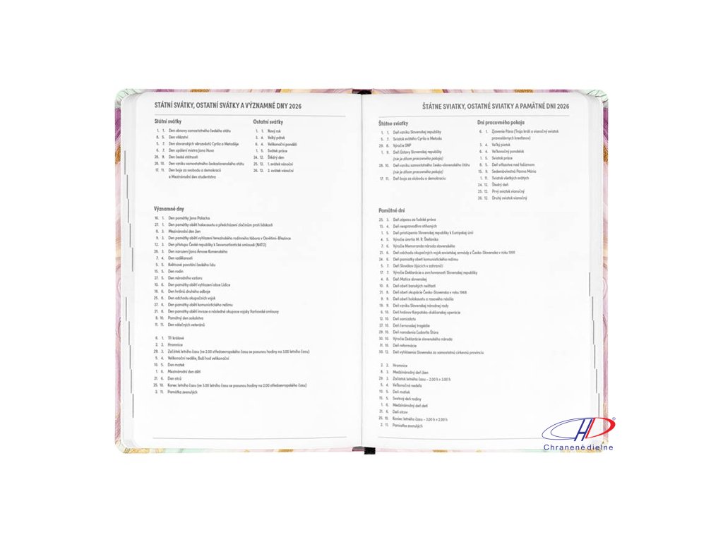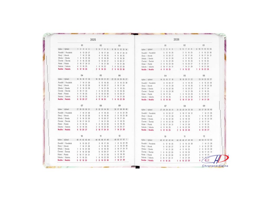 MINIMÁLNY ODBER 3 kusy. Väzba: tuhá knižná. Kalendárium: týždenné 18 mesačné 2 jazyčné (CZ, SK). 192 strán. 18-mesačný diár (jún 2025- december 2026) obsahuje prehľad na rok 2025 a 2026, zoznam mien, kalendárium s menami a sviatkami a priestor na poznámkyDodatočné parametre