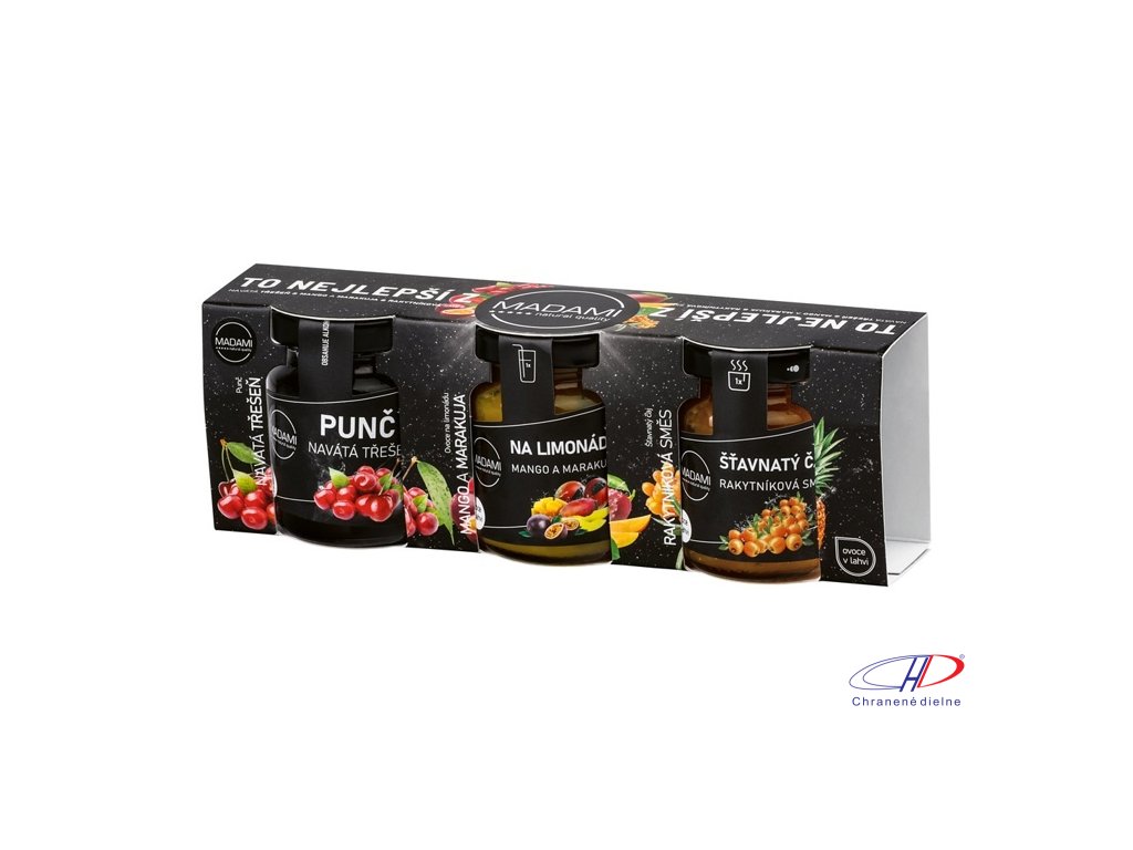 Darčeková sada 3 najobľúbenejších produktov. Obsahuje ovocie na limonádu, mango a marakuju (60 g), pečený čaj, rakytníkovú zmes (55 g) a mierne alkoholický punč "naviatá čerešňa" (60 g). V prípade záujmu o viac ako 10 kusov nás kontaktujte ohľadom cenovej ponuky.Dodatočné parametre