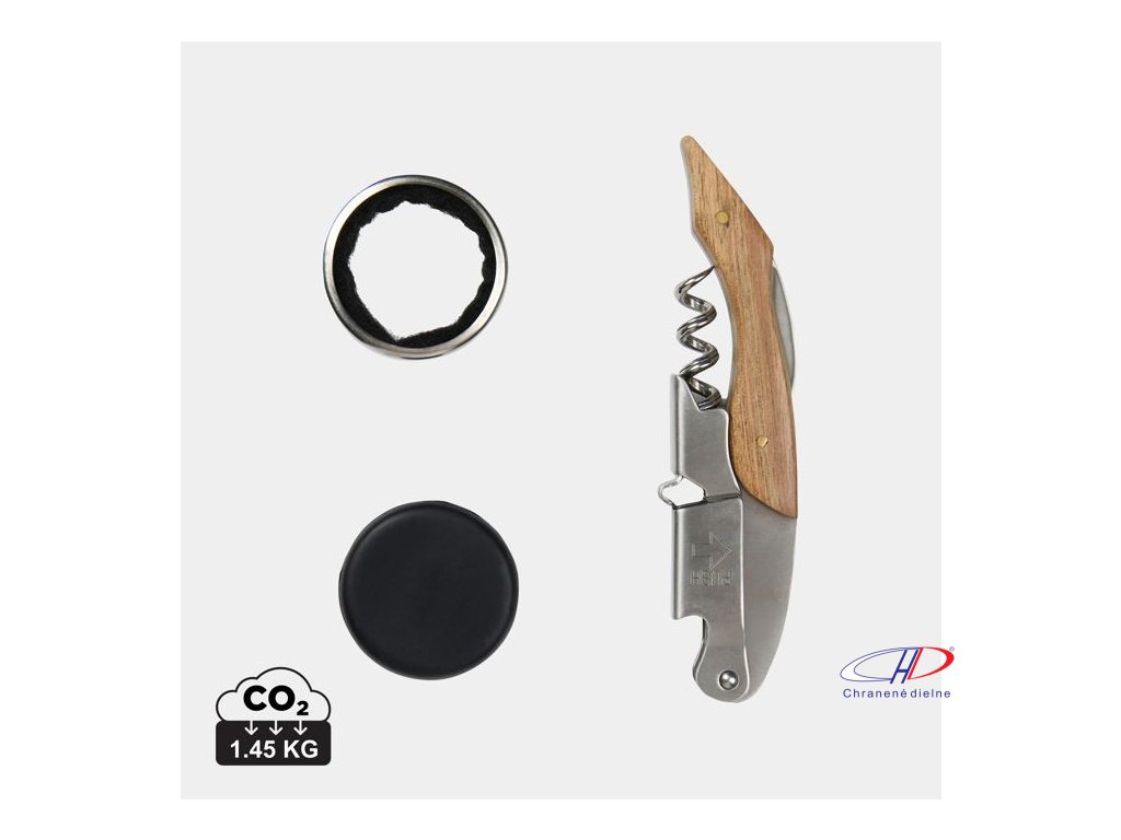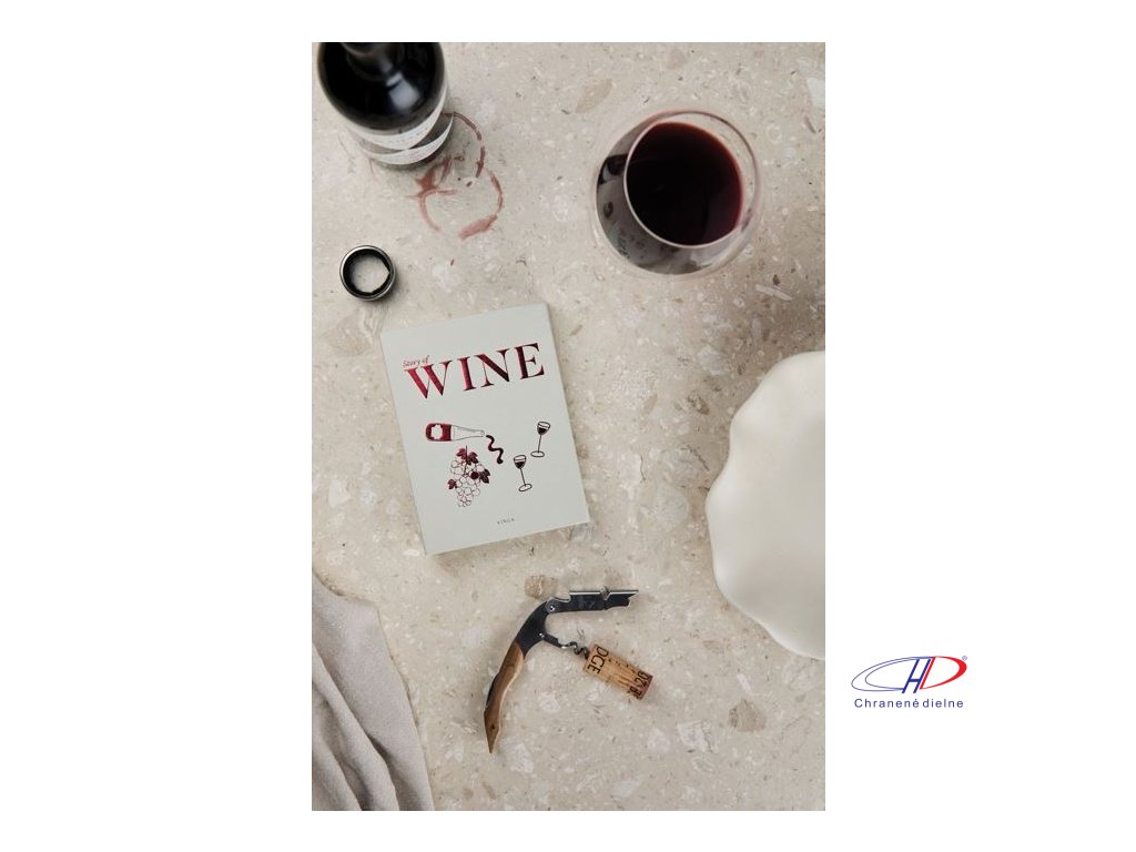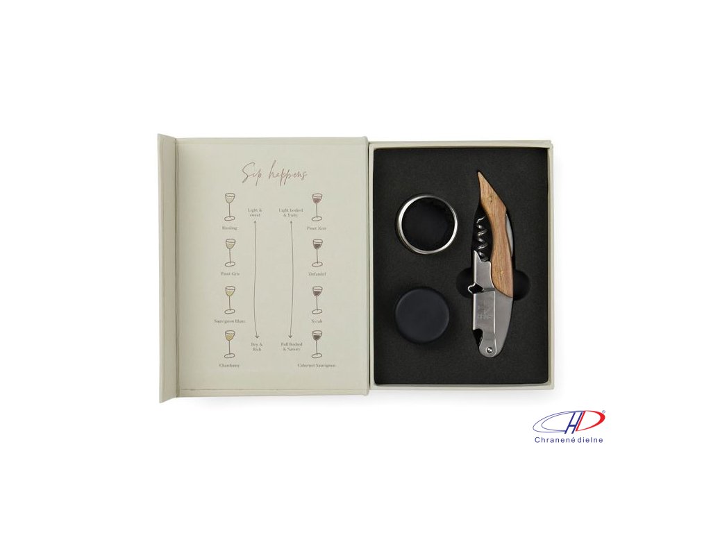 Sada "Story of wine" v darčekovej krabici pripomínajúcej knihu obsahuje čašnícku vývrtku, silikónovú zátku a nadstavec na fľašu na nalievanie bez kvapkania. Jedinečné balenie rozpráva pútavý príbeh o víne. Krabička z FSC® kraftového papiera.Dodatočné parametre