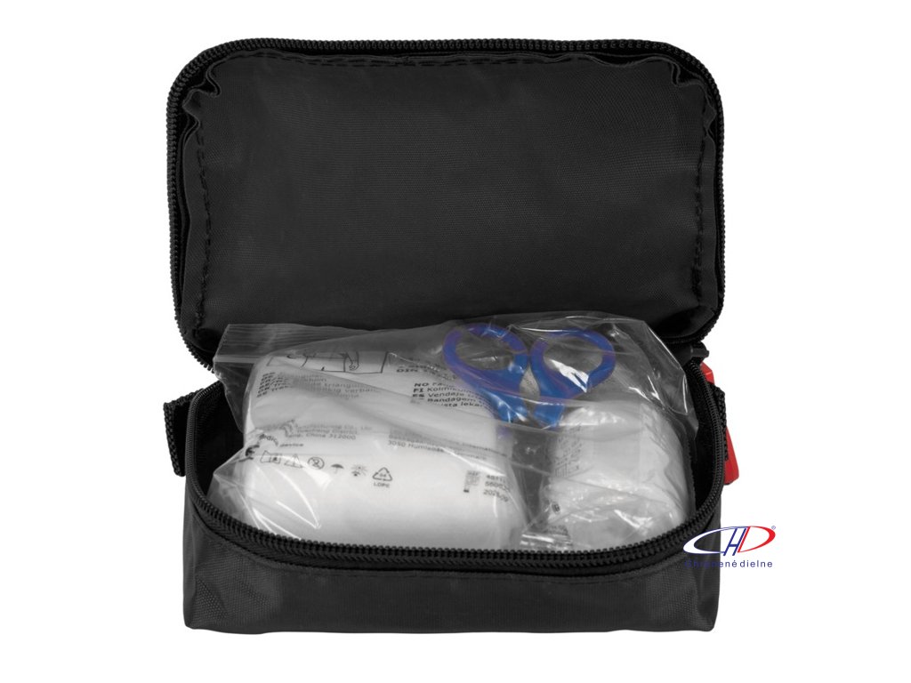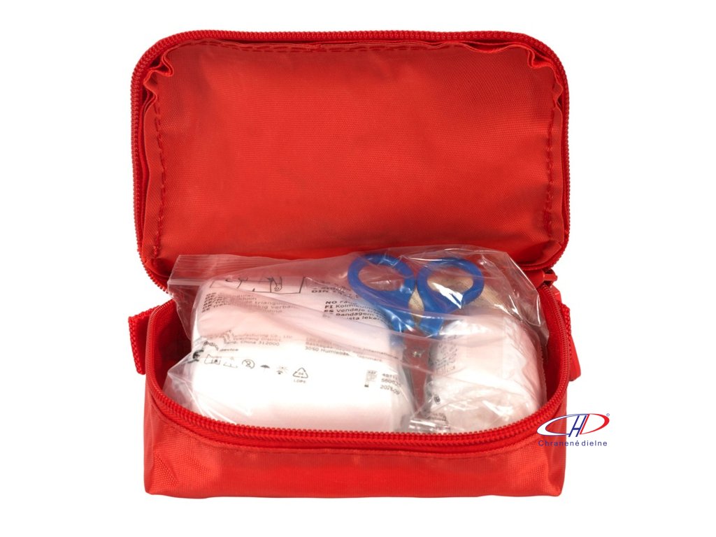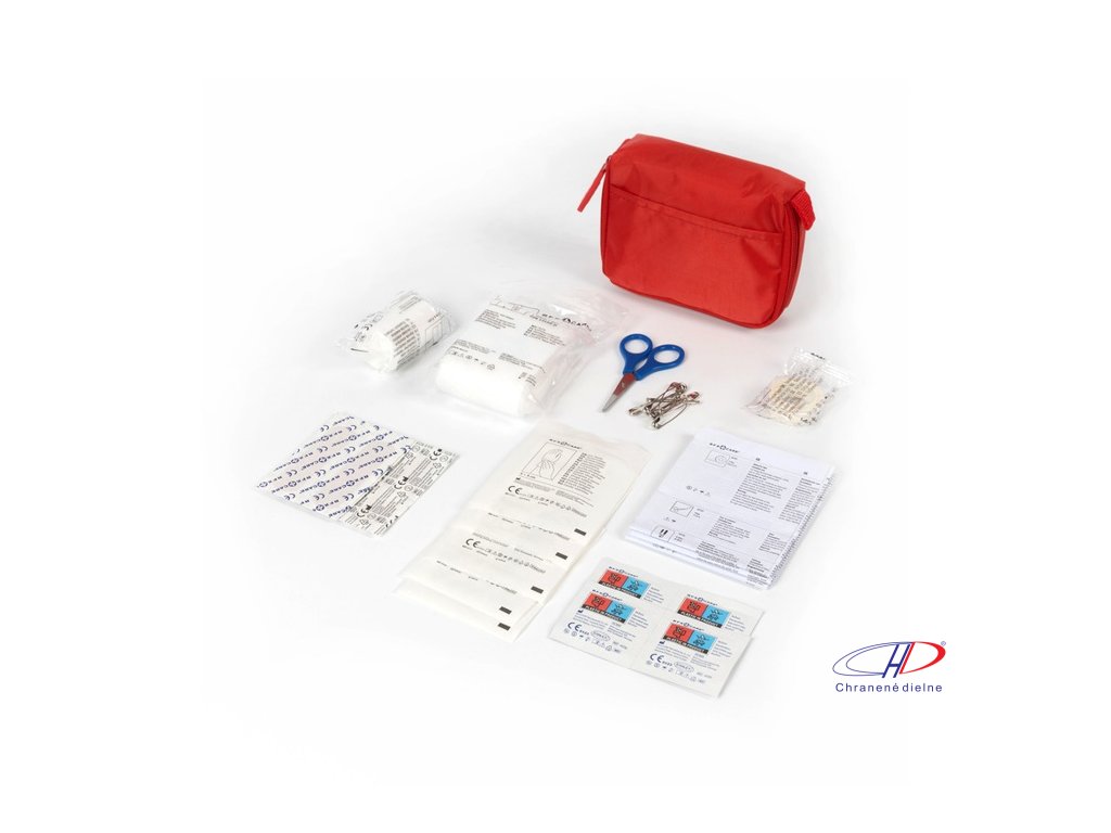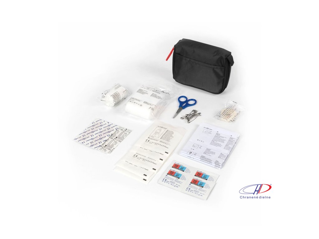 Lekárnička MDR triedy 2a. Nylónový obal, trvanlivosť 5 rokov. Obsah: 9 náplastí, 8 špendlíkov, 5 suchých tampónov, 4 tampóny na čistenie pokožky, 1 trojuholníkový obväz, 1 mini nožnice, 1 elastický obväz, 1 lekárska páska a 1 návod na použitie.Dodatočné parametre