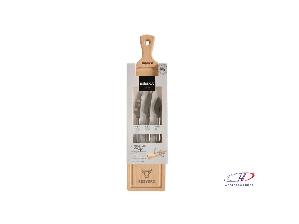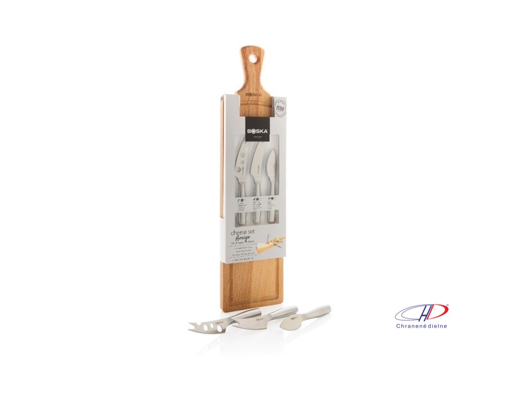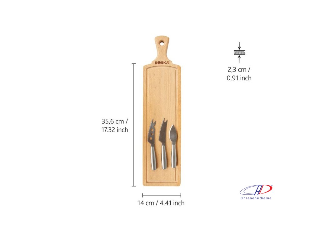 Sada na syr od BOSKA – spoločnosti s certifikátom B Corporation. Obsahuje servírovaciu dosku z bukového dreva a 3 nože Copenhagen. Nože sú ľahké, vhodné do umývačky, ideálne na akýkoľvek druh syra. Doska vhodná len na ručné umývanie. Záruka 10 rokov.Dodatočné parametre