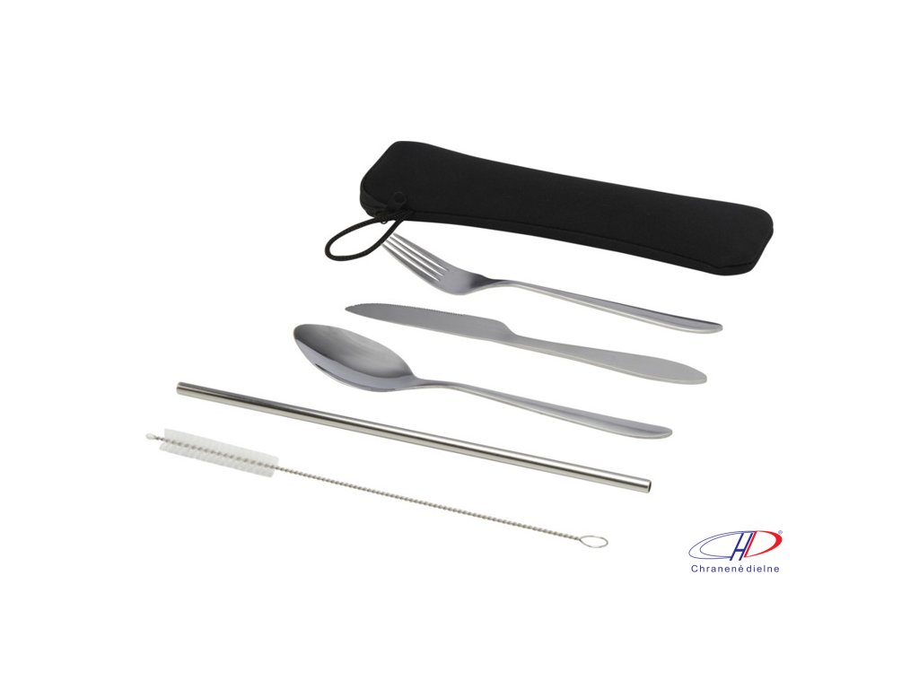 Súprava príborov obsahujúca vidličku, nôž, lyžicu, slamku a čistiacu kefu. Príbory sú vyrobené z nerezovej ocele, ktorá je odolná a ľahko sa čistí. Dodávané v polyesterovom vrecku na zips s praktickým pútkom na prenášanie.Dodatočné parametre