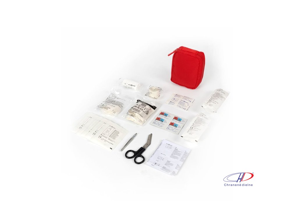 Lekárnička MDR triedy 2a. Trvanlivosť 5 rokov. 40 vodeodolných náplastí, 6 suchých tampónov, 4 tampóny na pokožku, 2 obväzy, 1 elastický obväz, 1 nožnice, 1 pinzeta, 1 odstraňovač popálenín, 1 pár jednorazových rukavíc, 1 lekárska páska a 1 návod.Dodatočné parametre