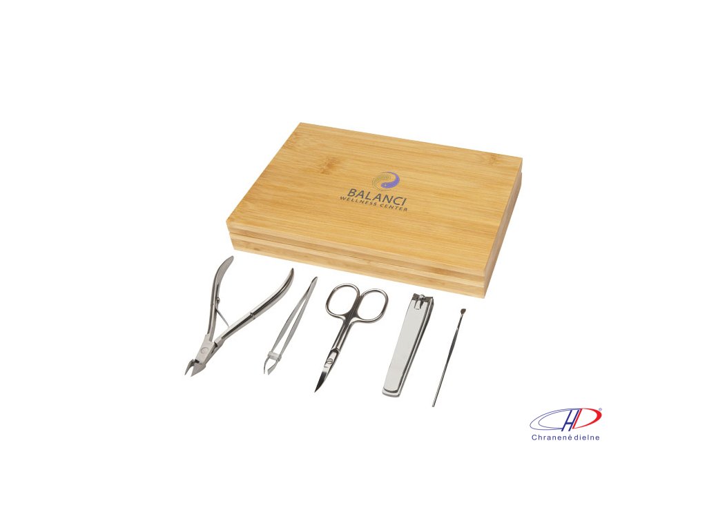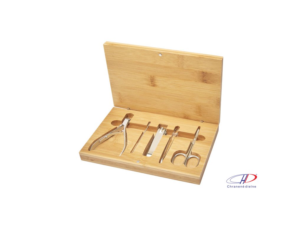 Kvalitná a krásne prevedená bambusová sada na manikúru s klieštičkami na kožičku (10,3 × 4,3 × 1 cm), klieštičkami do uší (8 cm), klieštičkami na nechty na rukách a nohách (8 × 1,5 × 1,5 cm), pinzetou (8,5 × 0,7 cm) a nožnice (9,5 × 4,2 cm).Dodatočné parametre