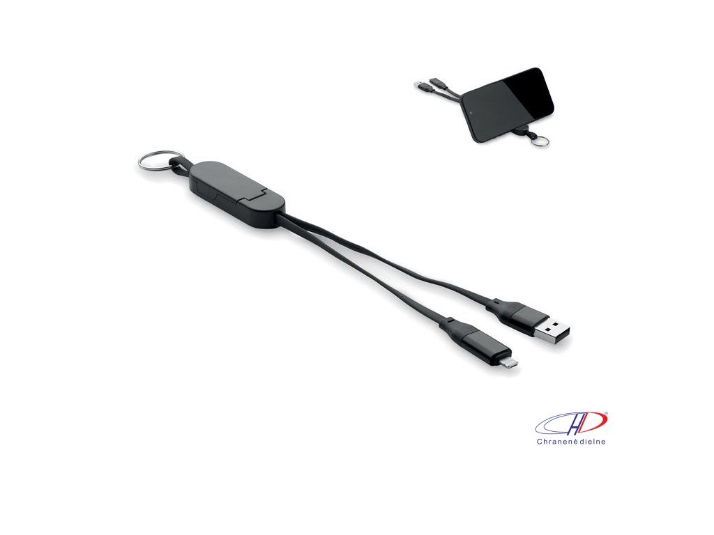 60W kábel v recyklovanom ABS obale s príveskom na kľúče a stojanom na telefón. Vstup: 2 v 1 typu C a typu A. Výstup: Type-C a micro-B (2v1 pin). Dĺžka kábla: 26 cm.
