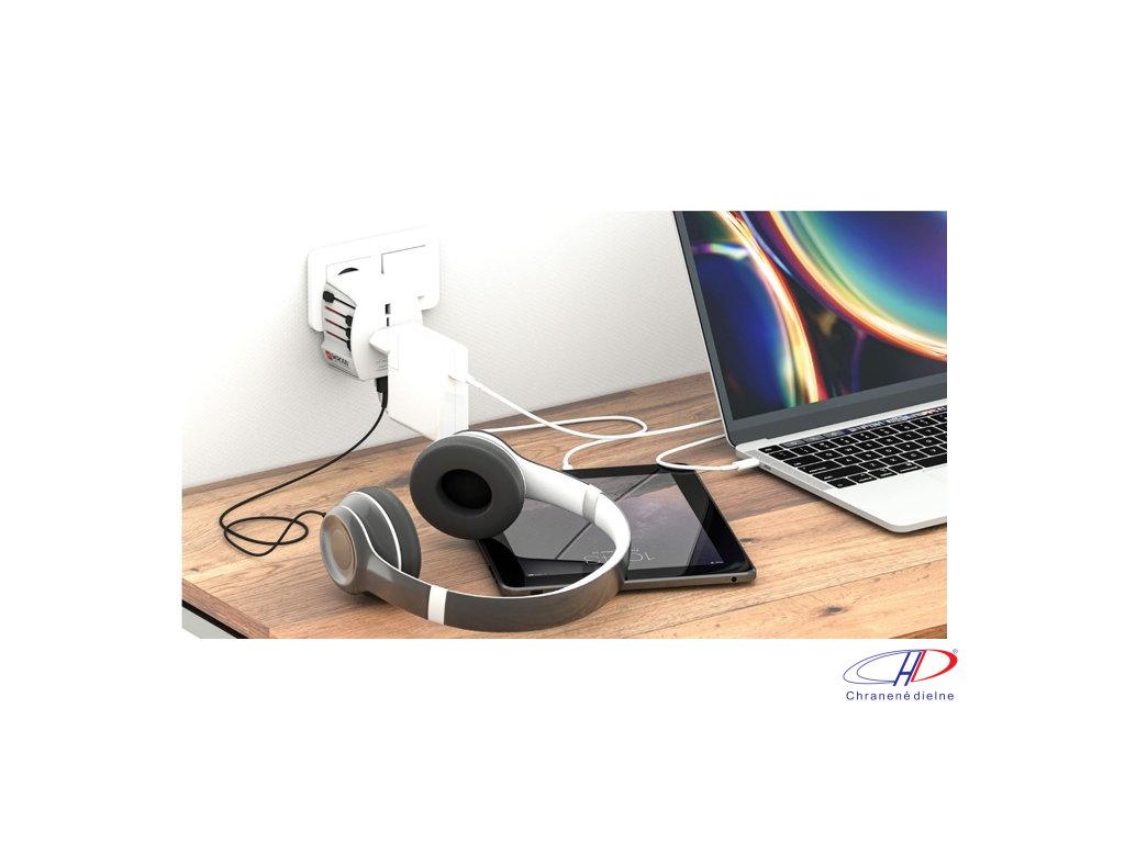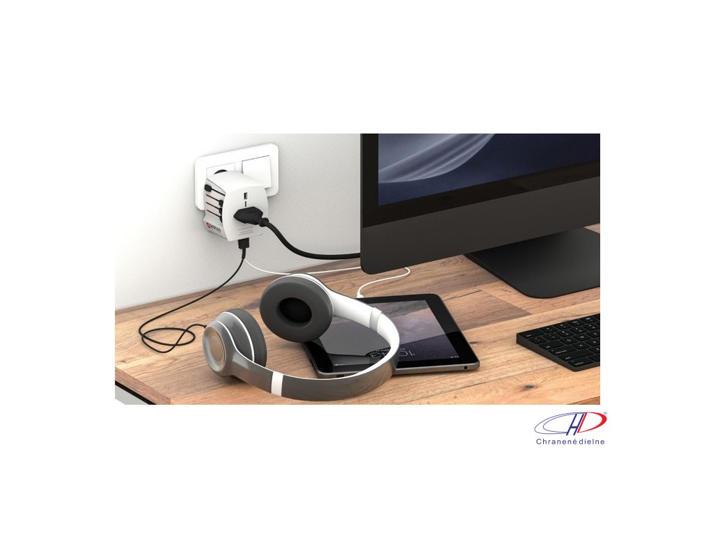 Dva USB porty (USB A a USB C) umožňujú nabíjať dve USB zariadenia súčasne, zatiaľ čo adaptér je možné používať s neuzemneným zariadením súčasne. Použiteľné po celom svete: USA, Japonsko, Austrália, Čína, vo väčšine európskych krajín.Dodatočné parametre