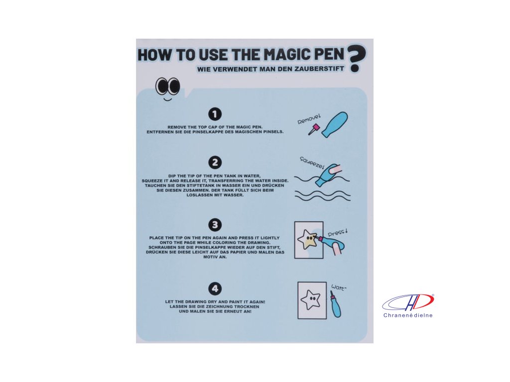 Magická aktivita pre deti, ktorá ich opakovane očarí len s trochou vody. Stačí naplniť štetec vodou a maľovať na jednu zo 4 strán s roztomilými motívmi. Farby sa objavia pri kontakte s vodou a po vyschnutí zmiznú, čo zaručuje nekonečnú zábavu.Dodatočné parametre