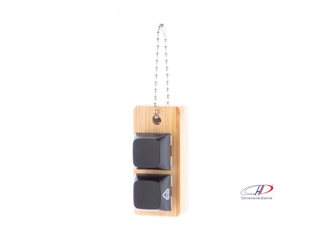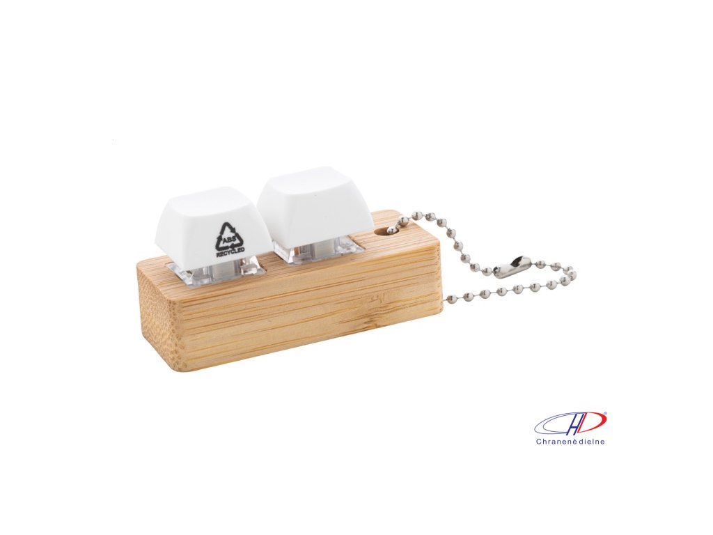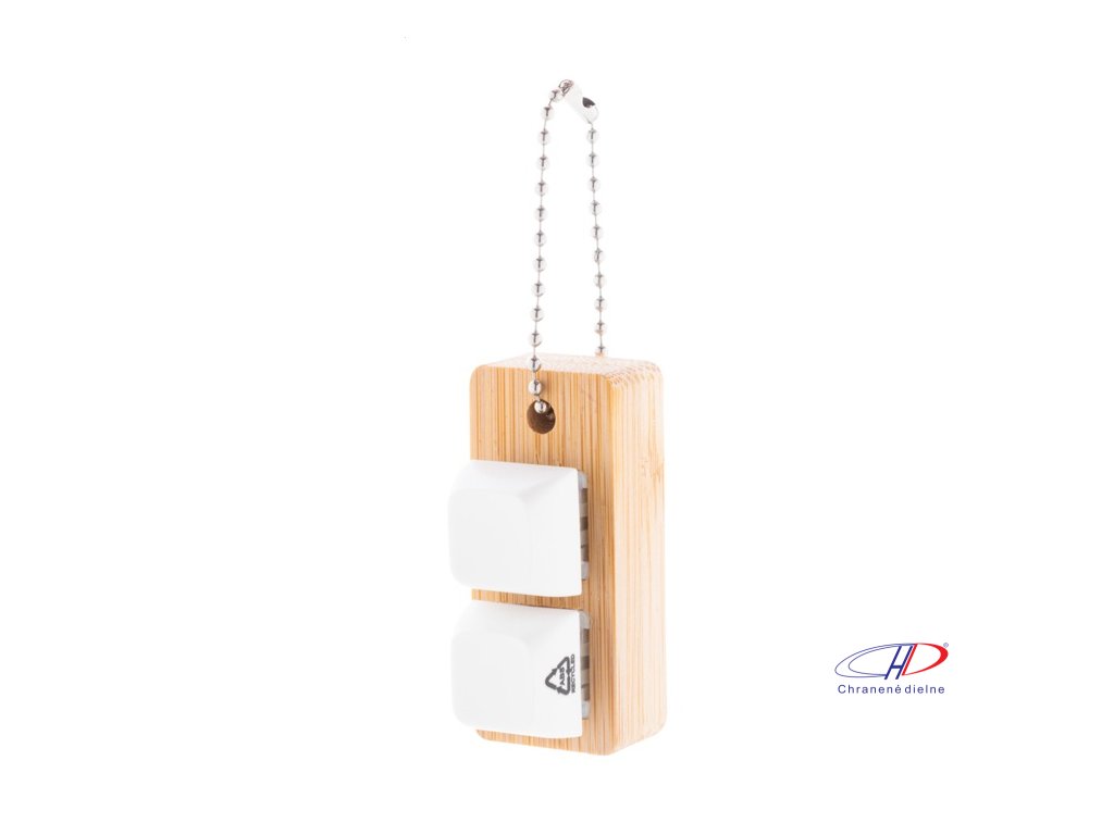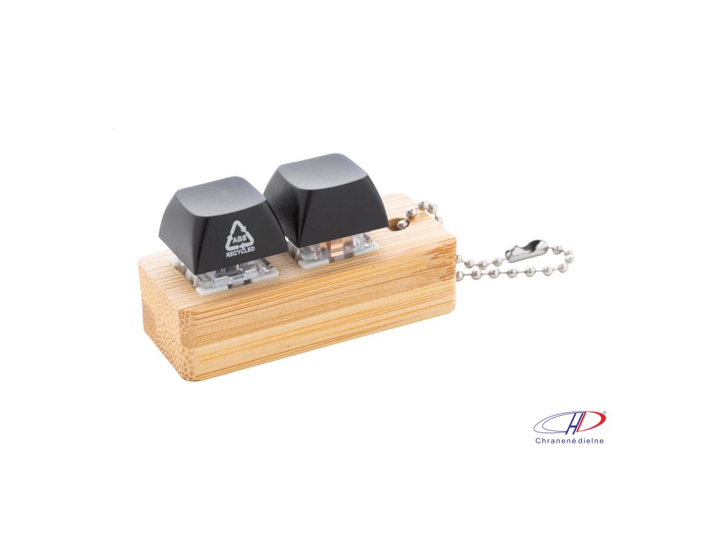 Bambusový prívesok na kľúče s kovovou retiazkou a 2 recyklovanými ABS antistresovými tlačidlami imitujúcimi mechanické tlačidlá klávesnice.Dodatočné parametre