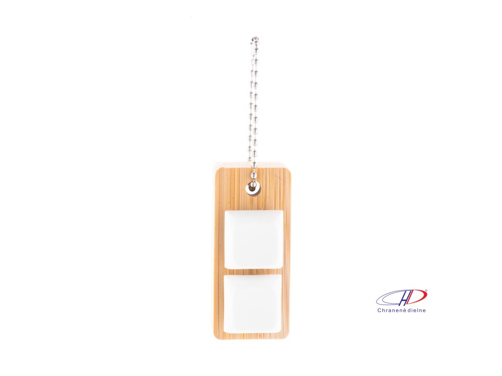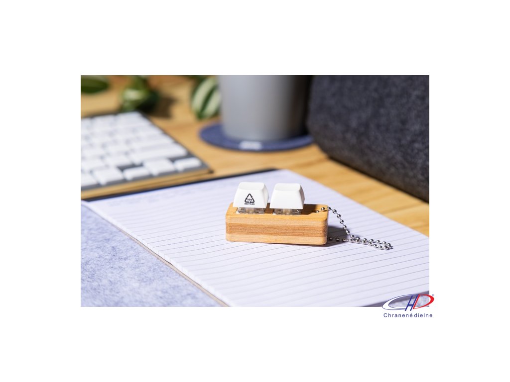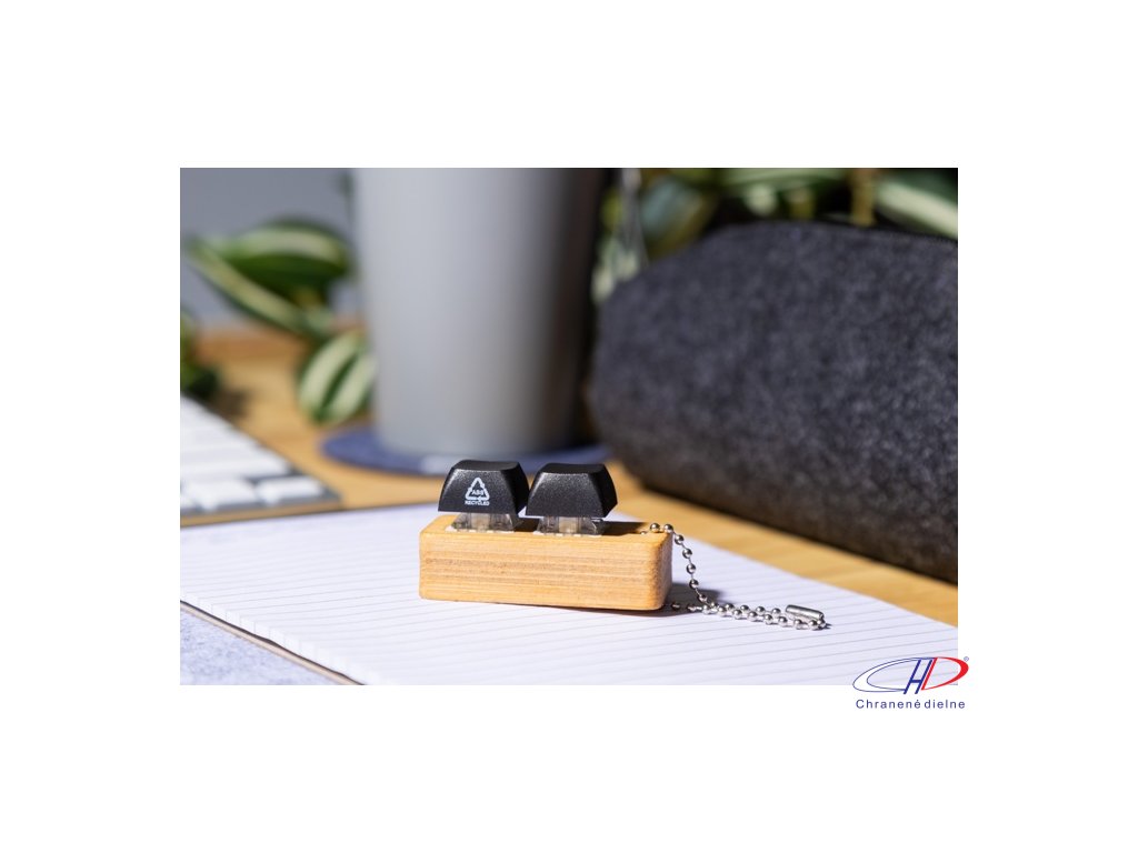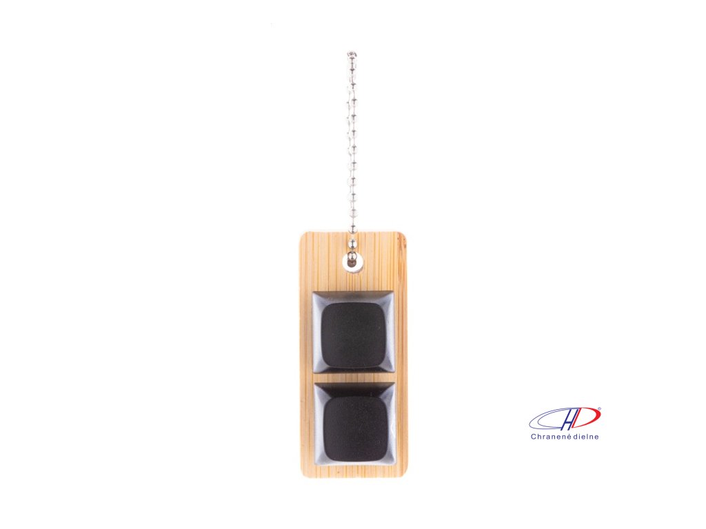 Bambusový prívesok na kľúče s kovovou retiazkou a 2 recyklovanými ABS antistresovými tlačidlami imitujúcimi mechanické tlačidlá klávesnice.Dodatočné parametre