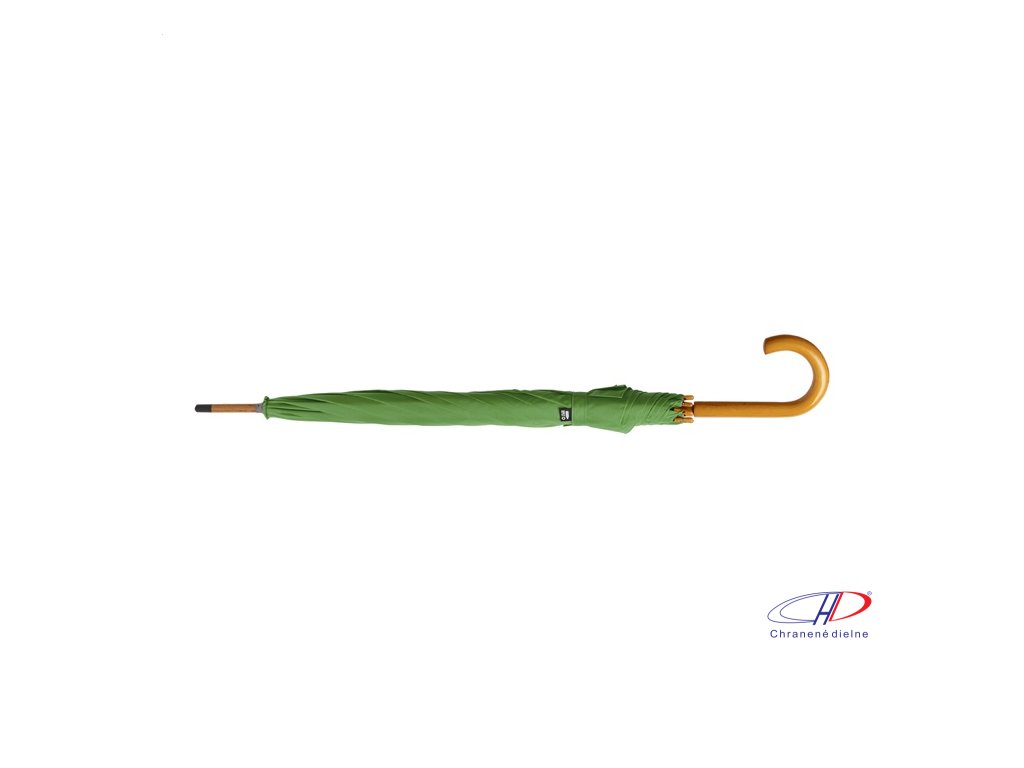 Automatický dáždnik s 8 panelmi, kovovým rámom, drevenou tyčou a rukoväťou.