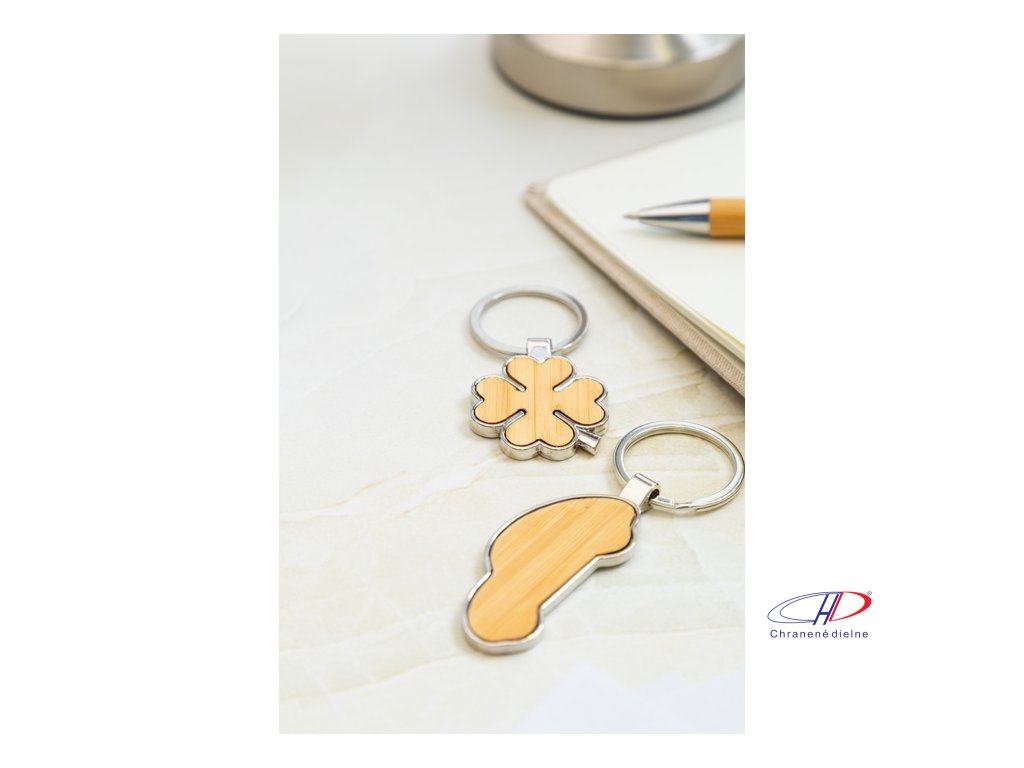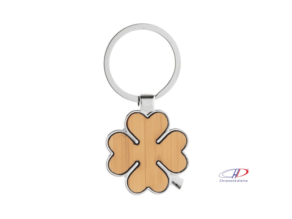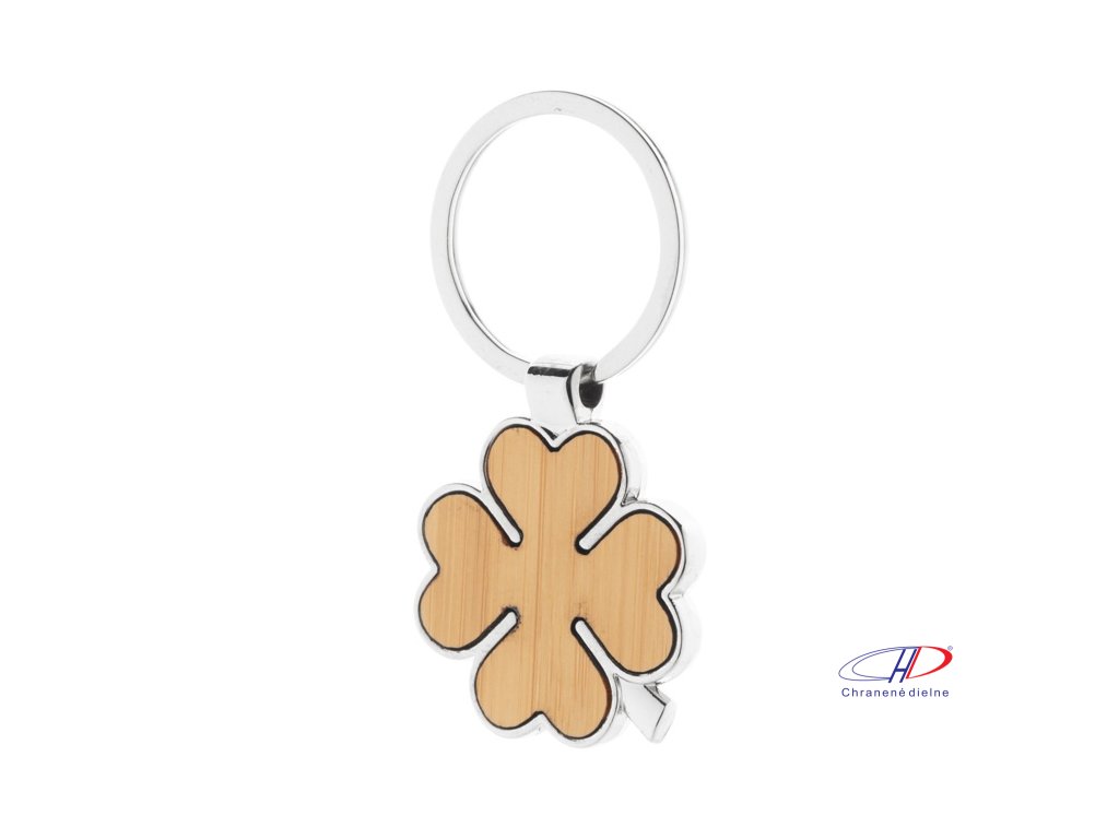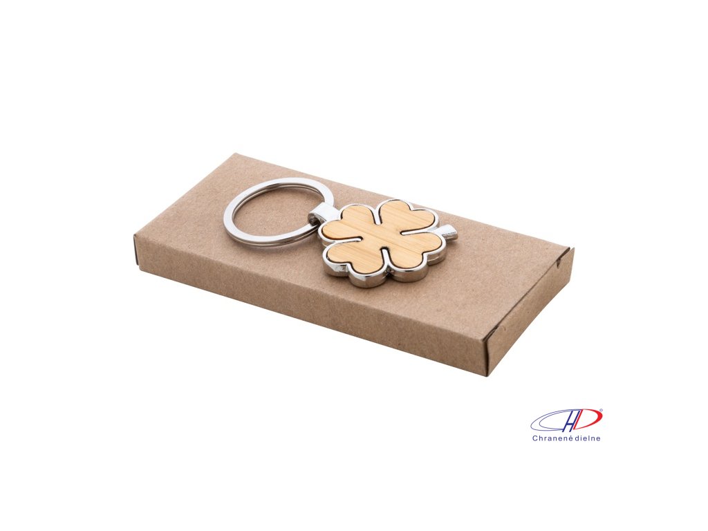 Kovový prívesok na kľúče v tvare štvorlístka s bambusovou vložkou. V kraftovej papierovej krabičke.Dodatočné parametre