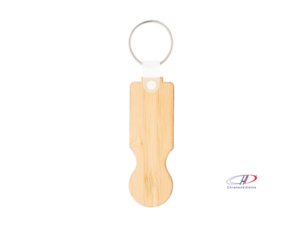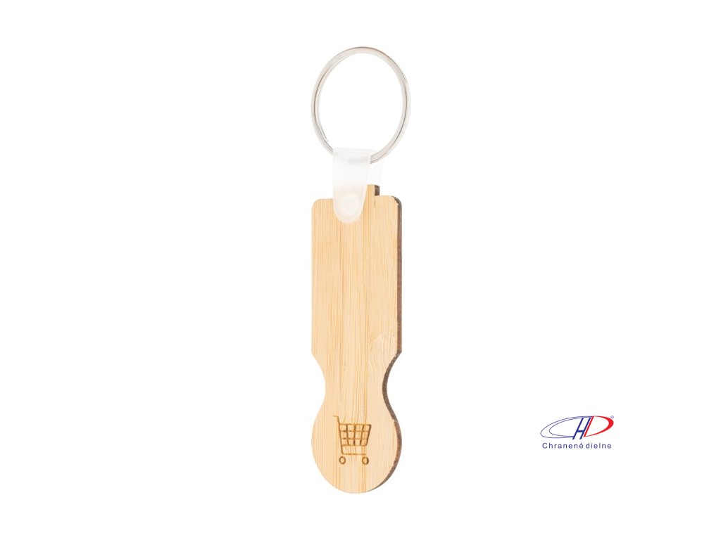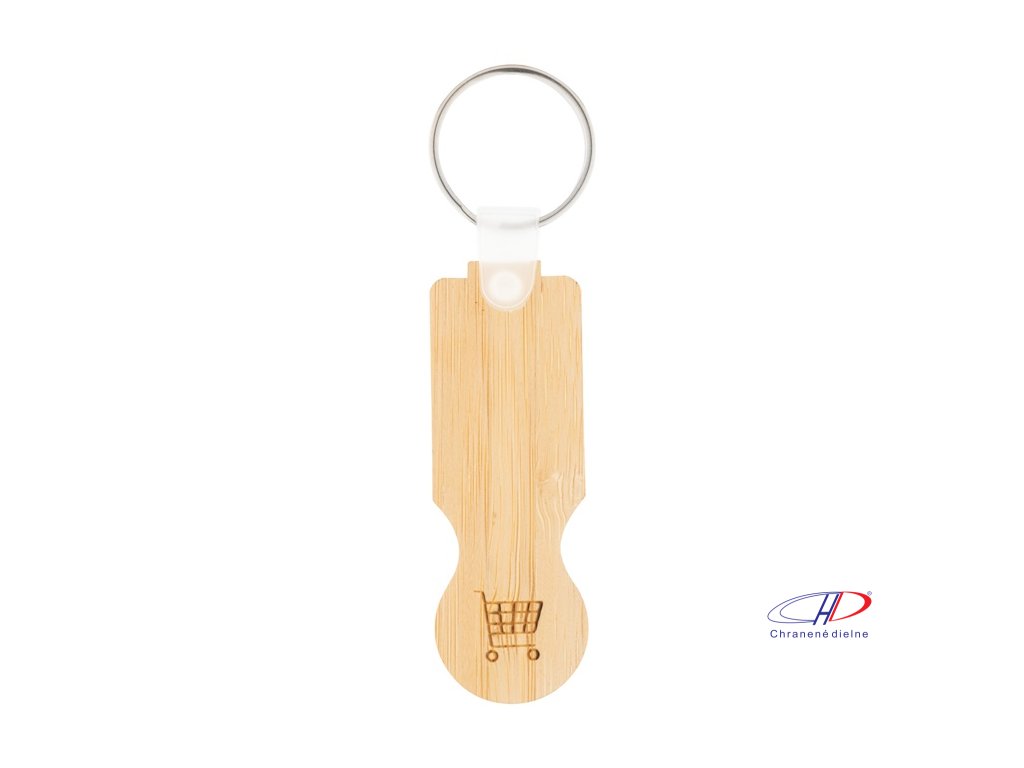 Prívesok na kľúče z bambusovej preglejky so žetónom do nákupného vozíka.Dodatočné parametre
