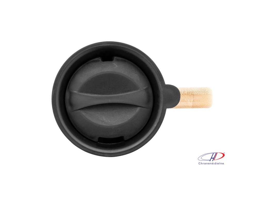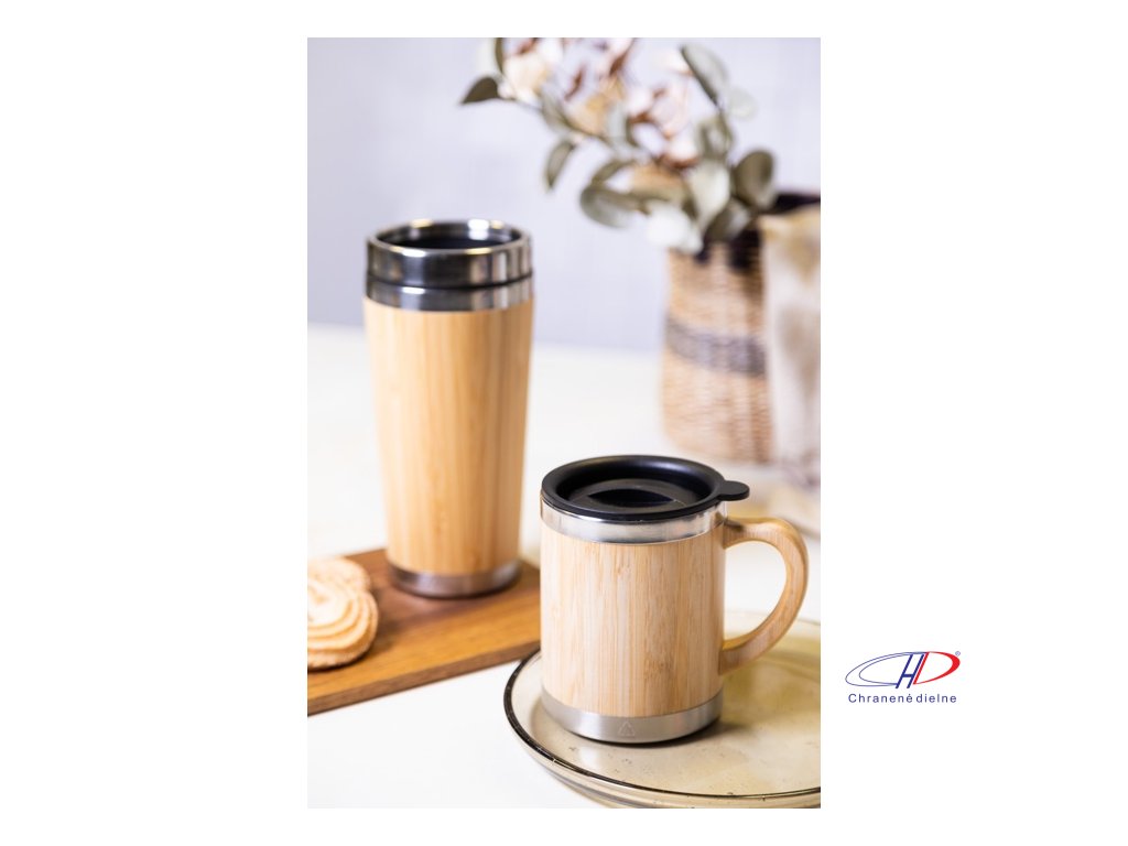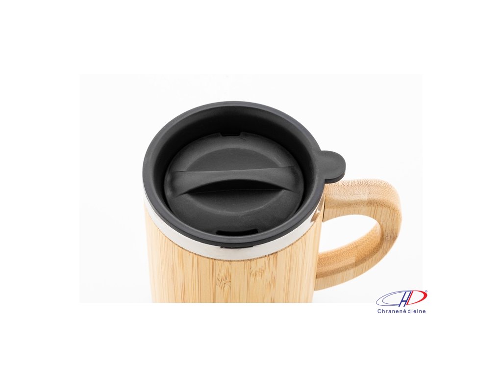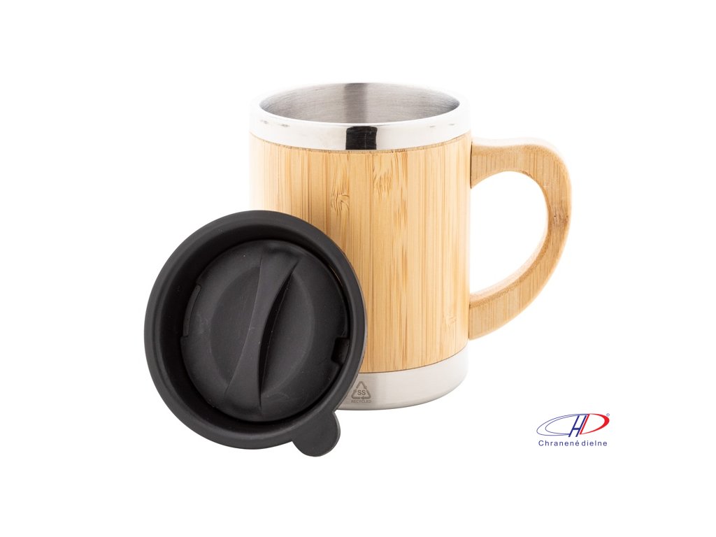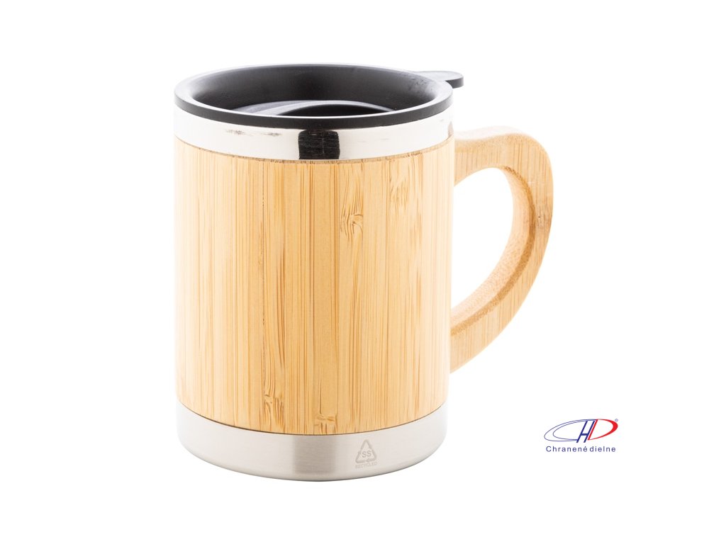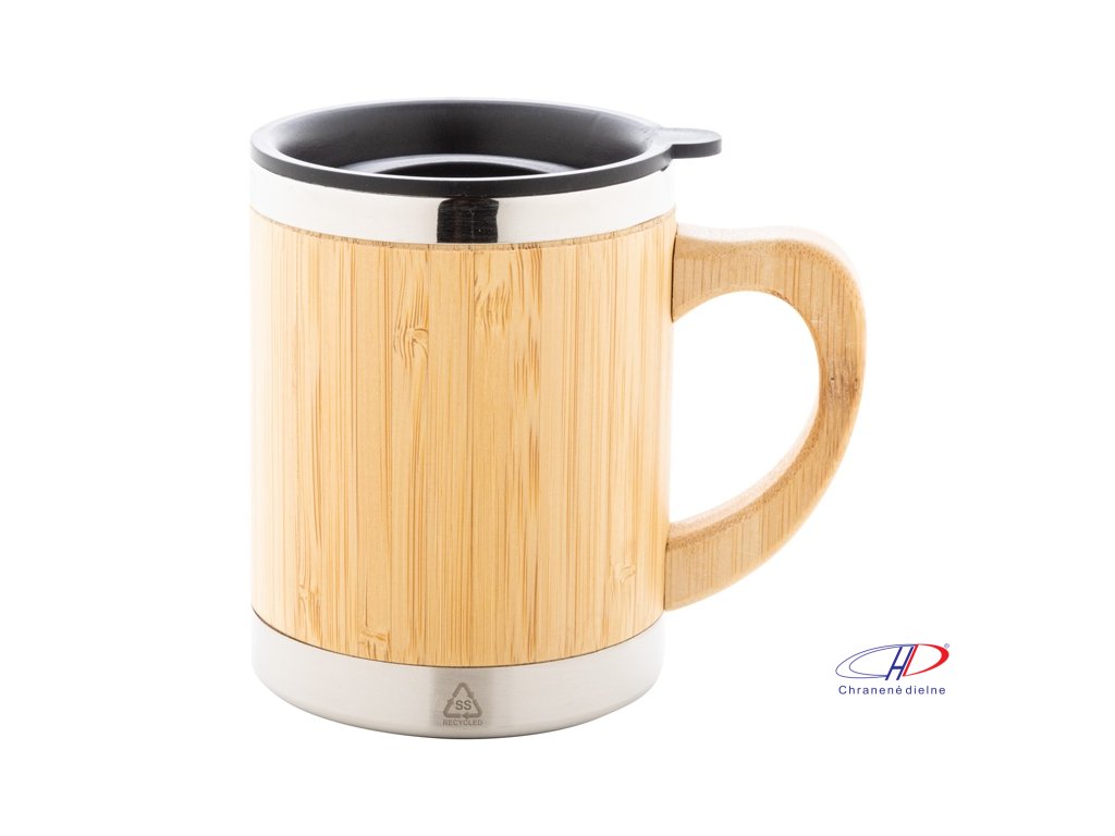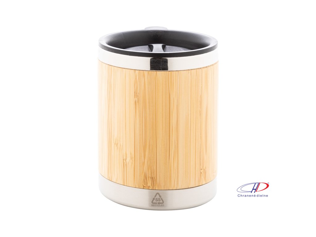 Bambusom potiahnutý, dvojstenný recyklovaný nerezový izolovaný termo hrnček s bambusovým uchom a PP viečkom na pitie, 300 ml.Dodatočné parametre