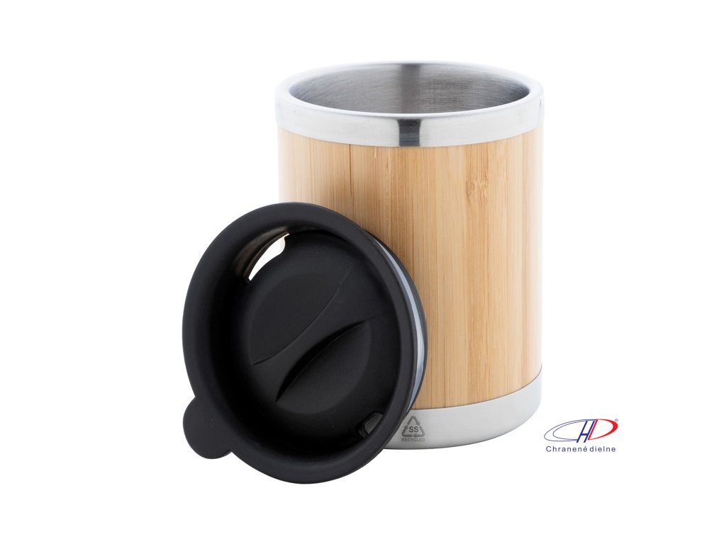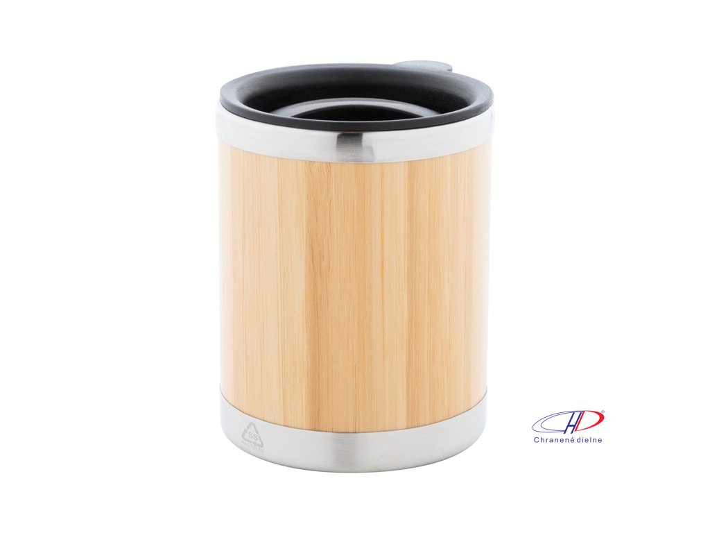 Bambusom pokrytý, dvojstenný recyklovaný nerezový izolovaný termo hrnček s PP viečkom na pitie, 300 ml.Dodatočné parametre