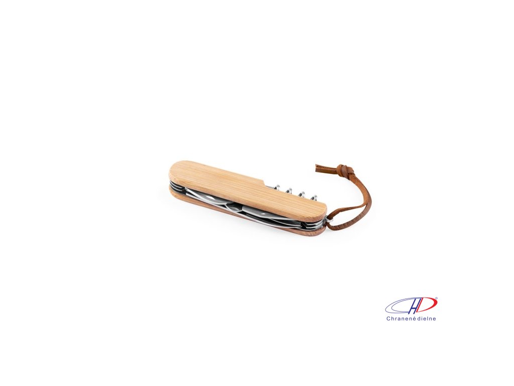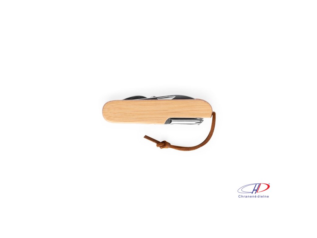 Multifunkčný vreckový nôž so šnúrkou. 7 funkcií: nôž, nožnice, vývrtka, skrutkovač, otvárač na konzervy a fľaše a pilník na nechty. Dodávané v darčekovej krabičke z kraftového papiera.Dodatočné parametre