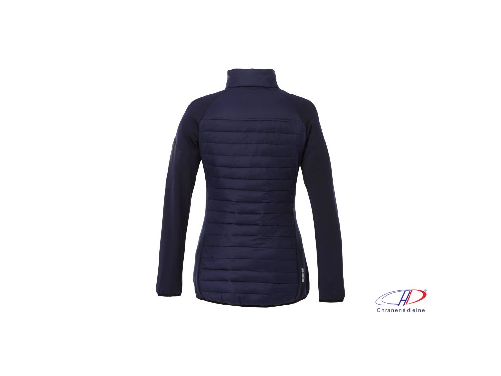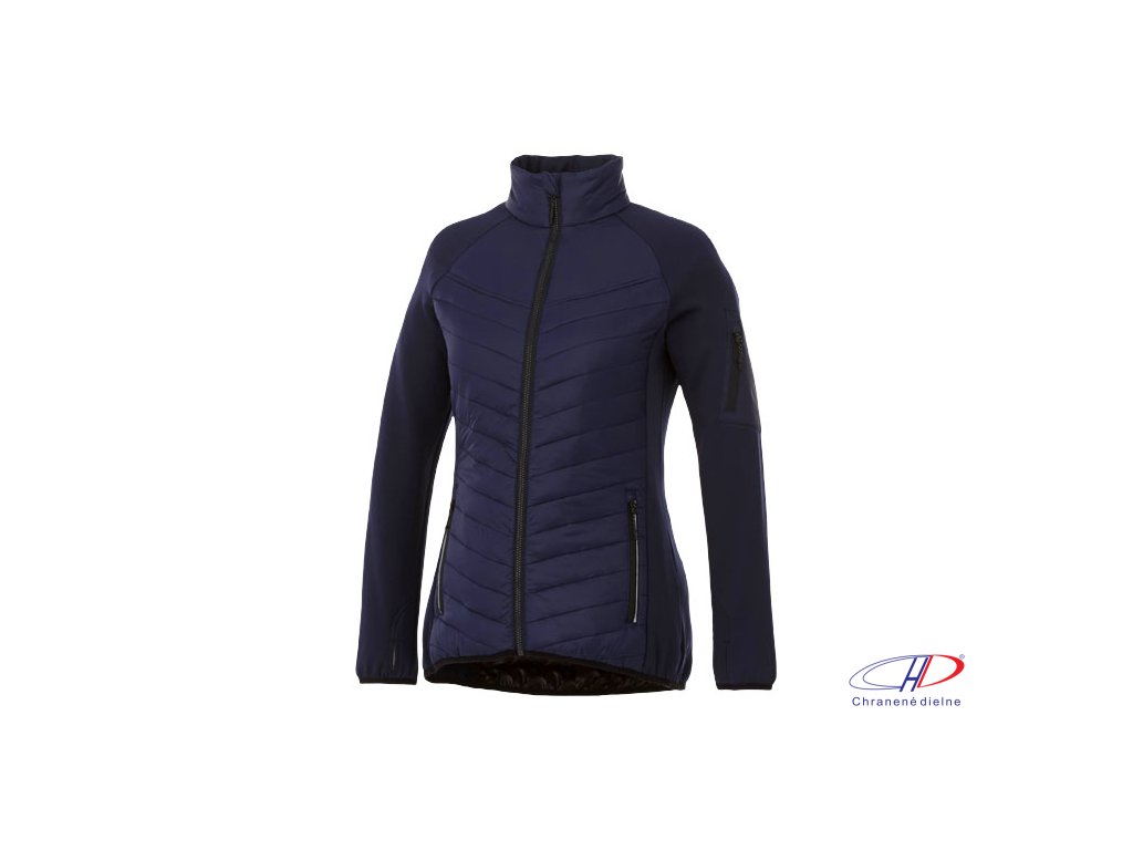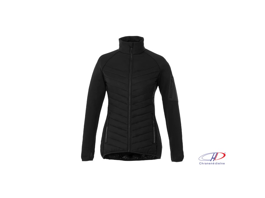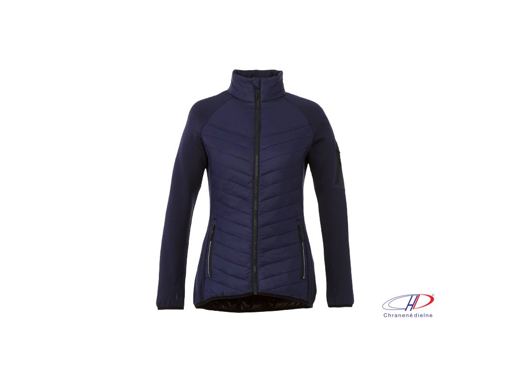Banff hybrid insulated ladies jacket. Inner stormflap with chinguard.Interior media exit port with cord guide.Dropped back hem.Shaped seams and tapered waist for flattering fit.Elasticated binding in contrast colour.Piping detail.Centre front contrast coi