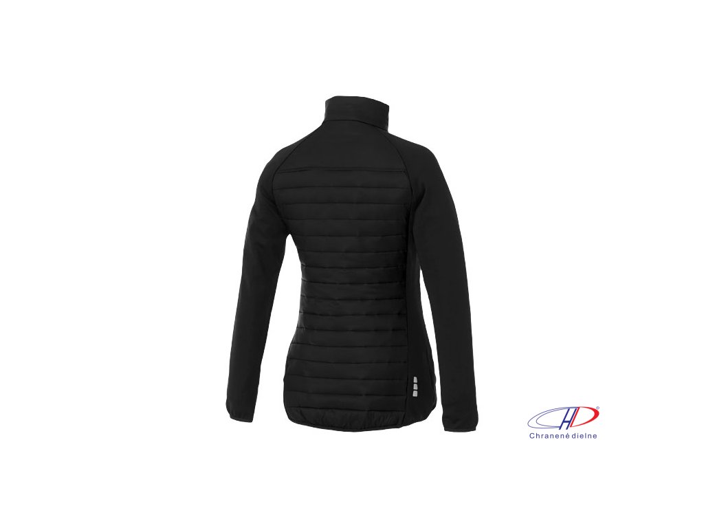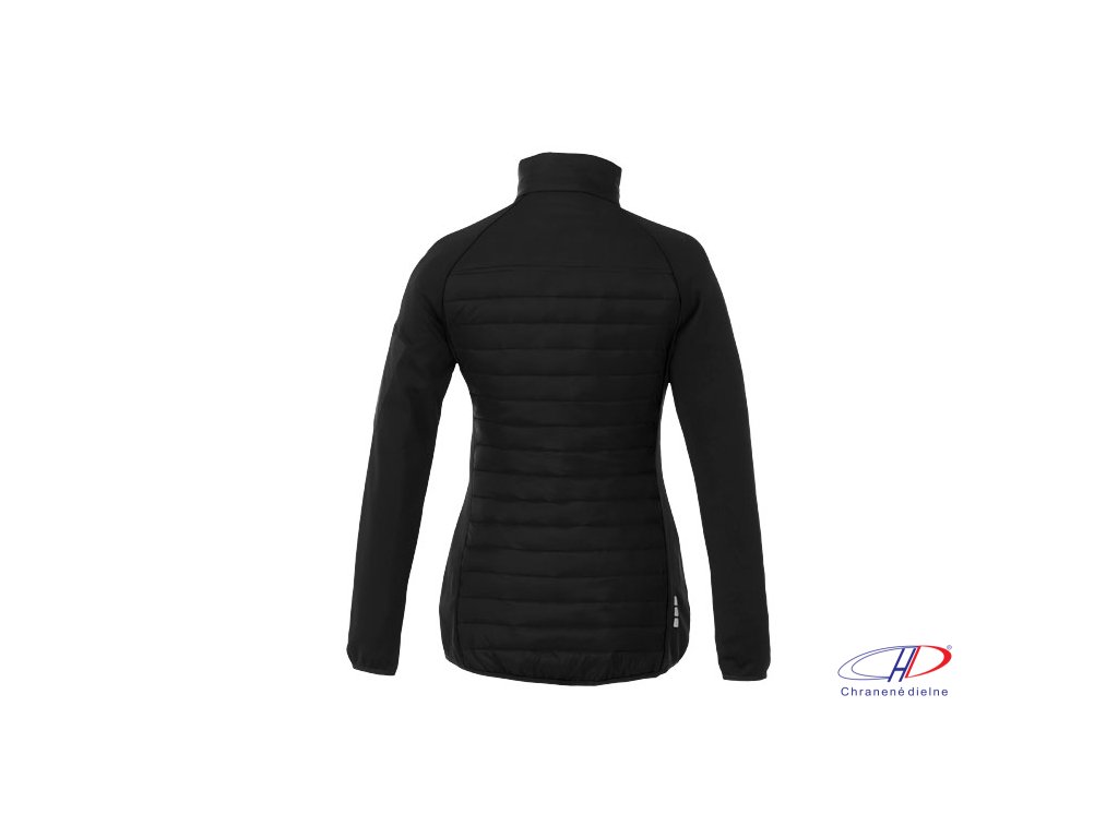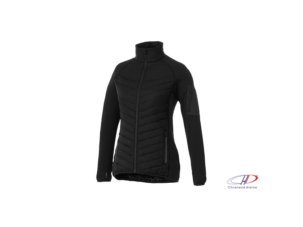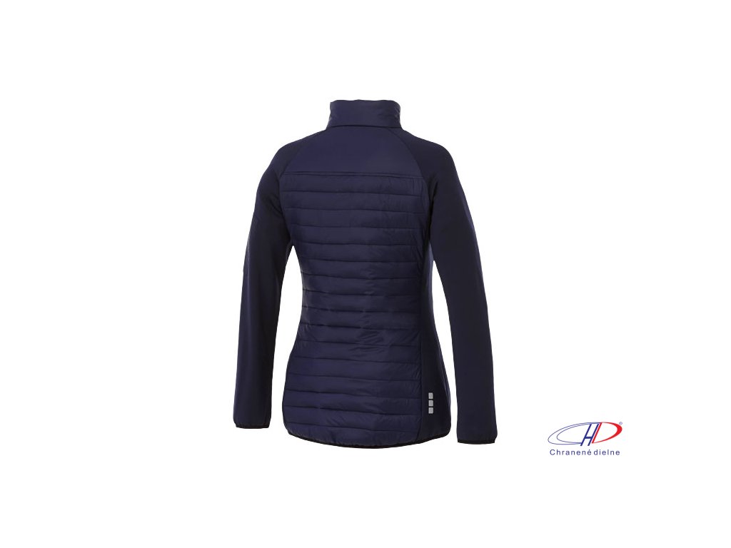 Banff hybrid insulated ladies jacket. Inner stormflap with chinguard.Interior media exit port with cord guide.Dropped back hem.Shaped seams and tapered waist for flattering fit.Elasticated binding in contrast colour.Piping detail.Centre front contrast coi