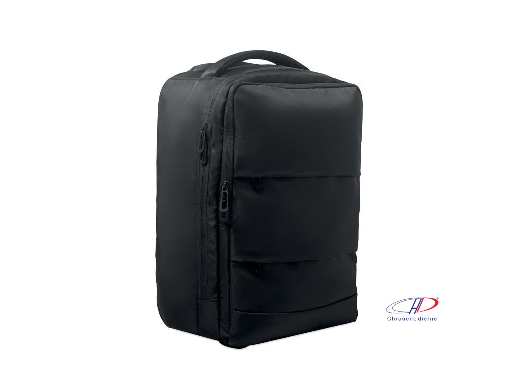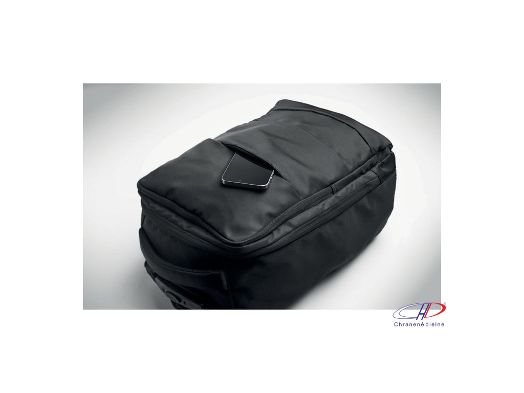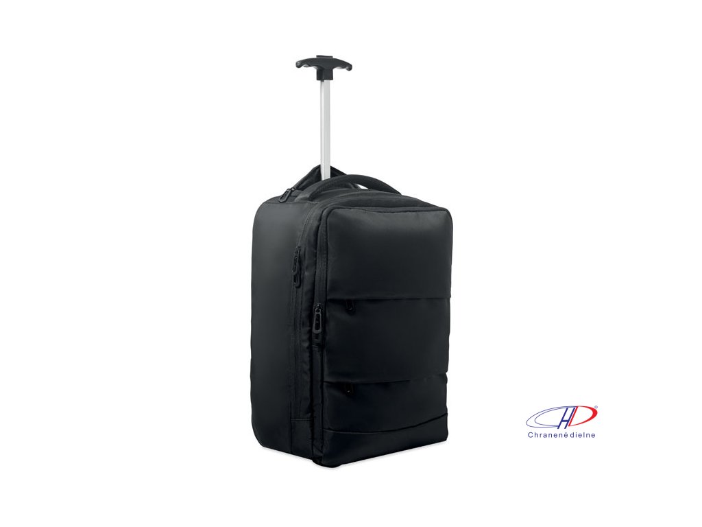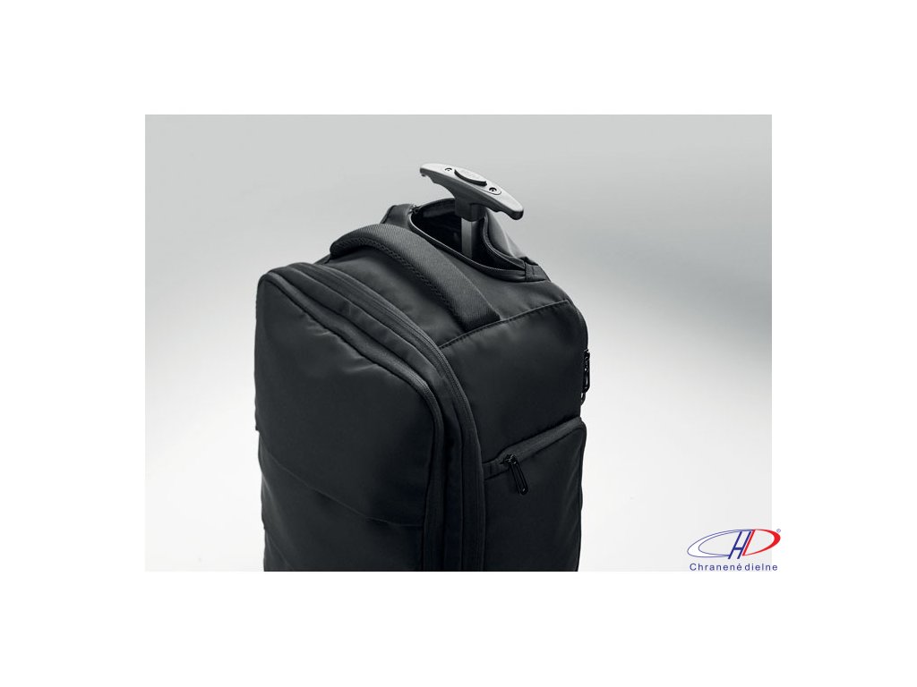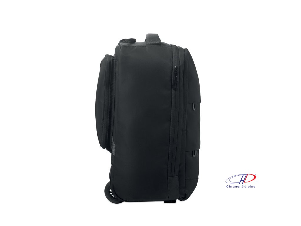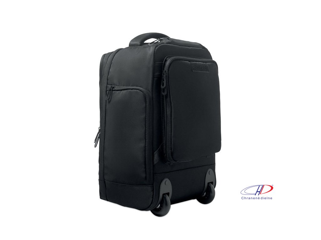 Batoh na kolieskach z polyesteru 290T RPET s tromi prednými vreckami na zips, polstrovanou priehradkou na 15' notebook a chladiacou časťou na zips. Má polstrovaný chrbát, popruhy a zadnú priehradku na zips.Dodatočné parametre