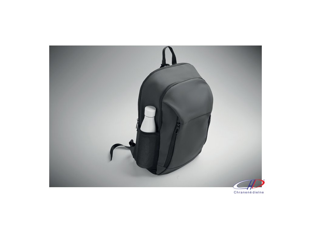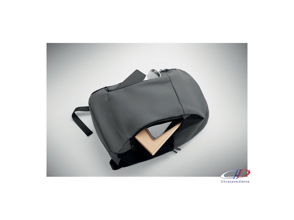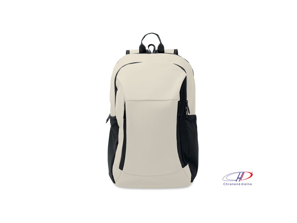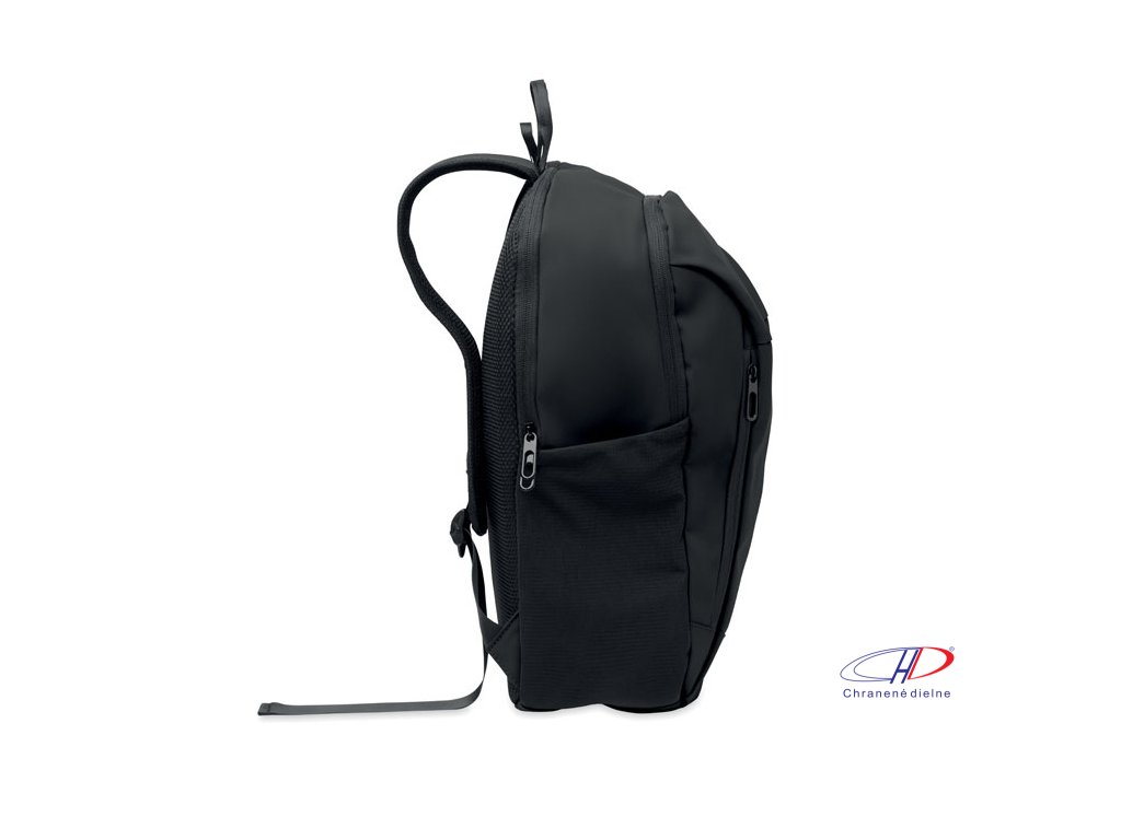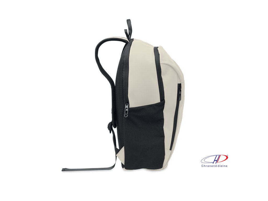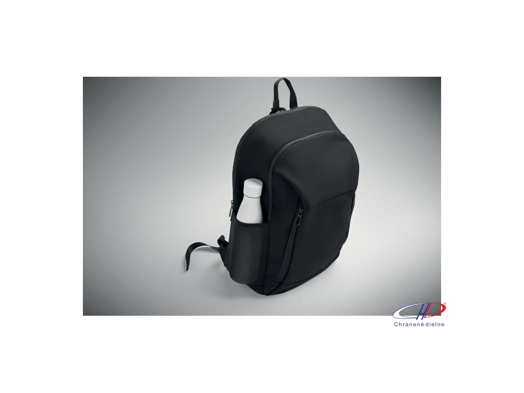 15-palcový batoh na notebook z mäkkej PU tkaniny s polstrovaným chrbtom a skrytým hlavným priestorom na zips. 1 predné vrecko na zips, 2 bočné vrecká na zips vpredu a 2 bočné vrecká z elastickej sieťoviny. S podšívkou z 210D RPET.Dodatočné parametre