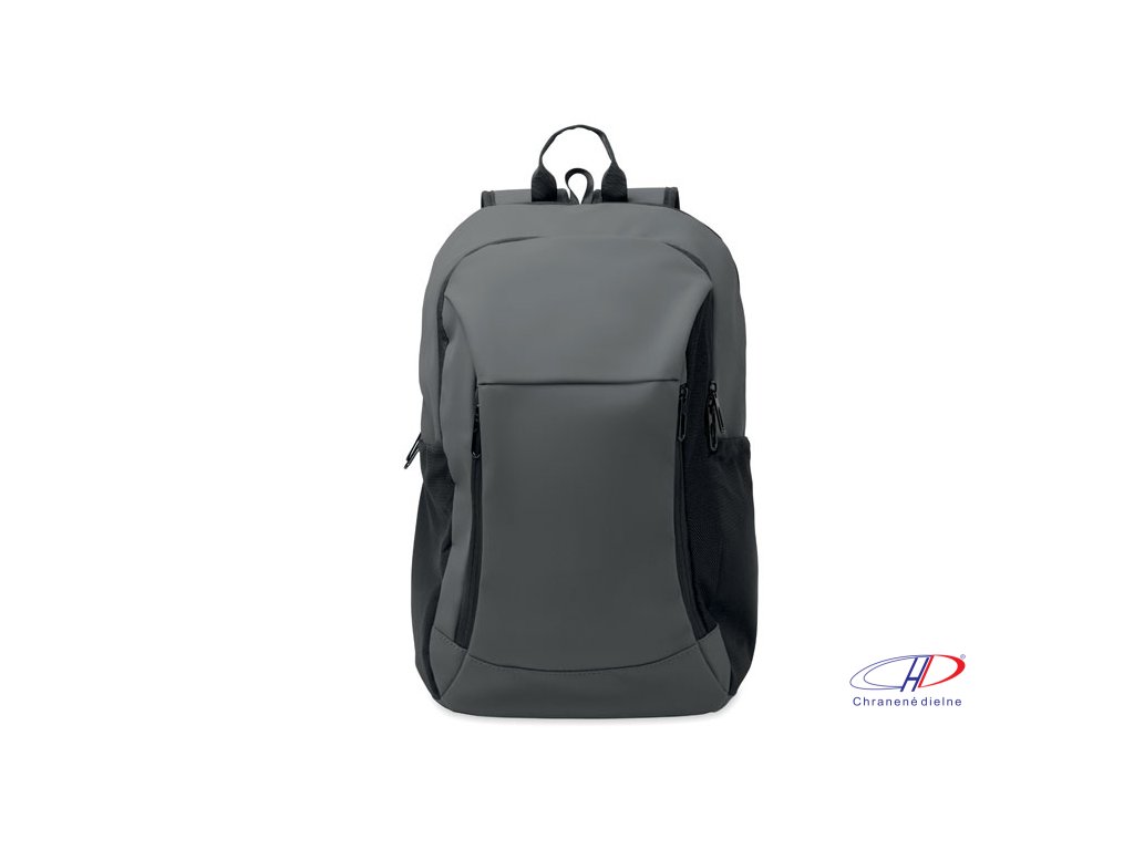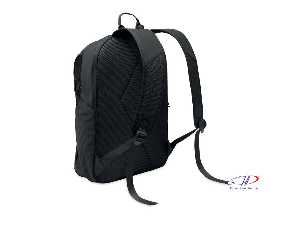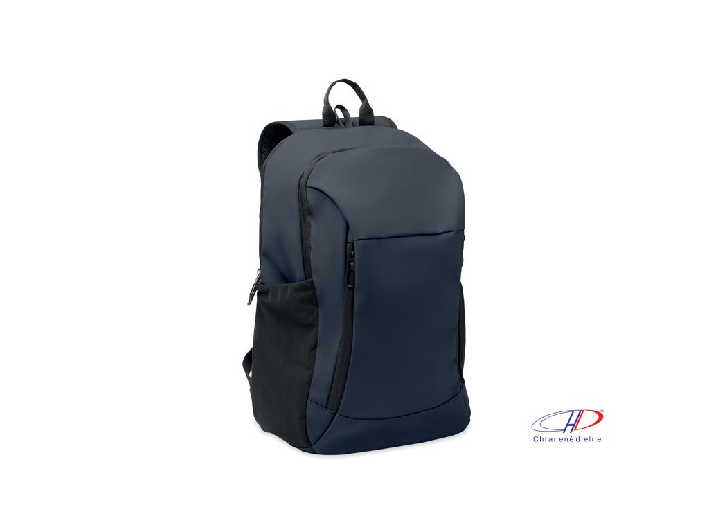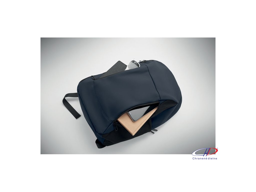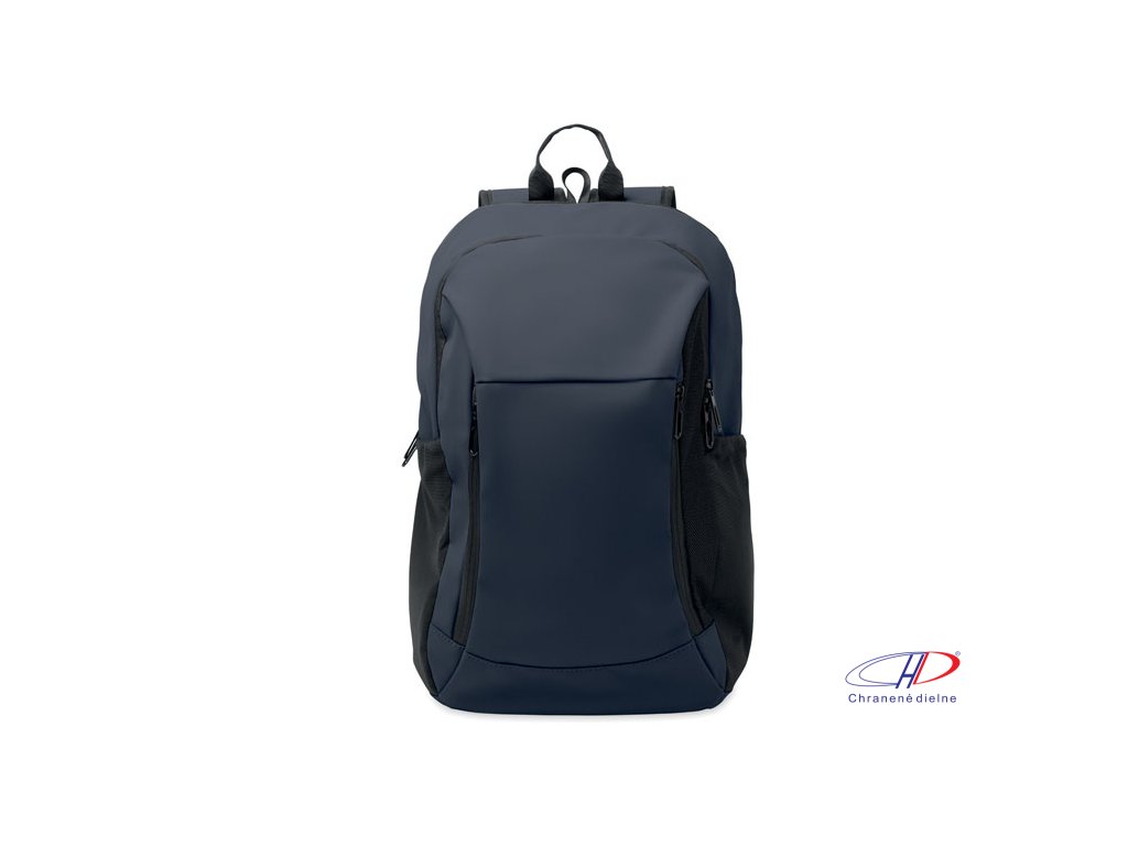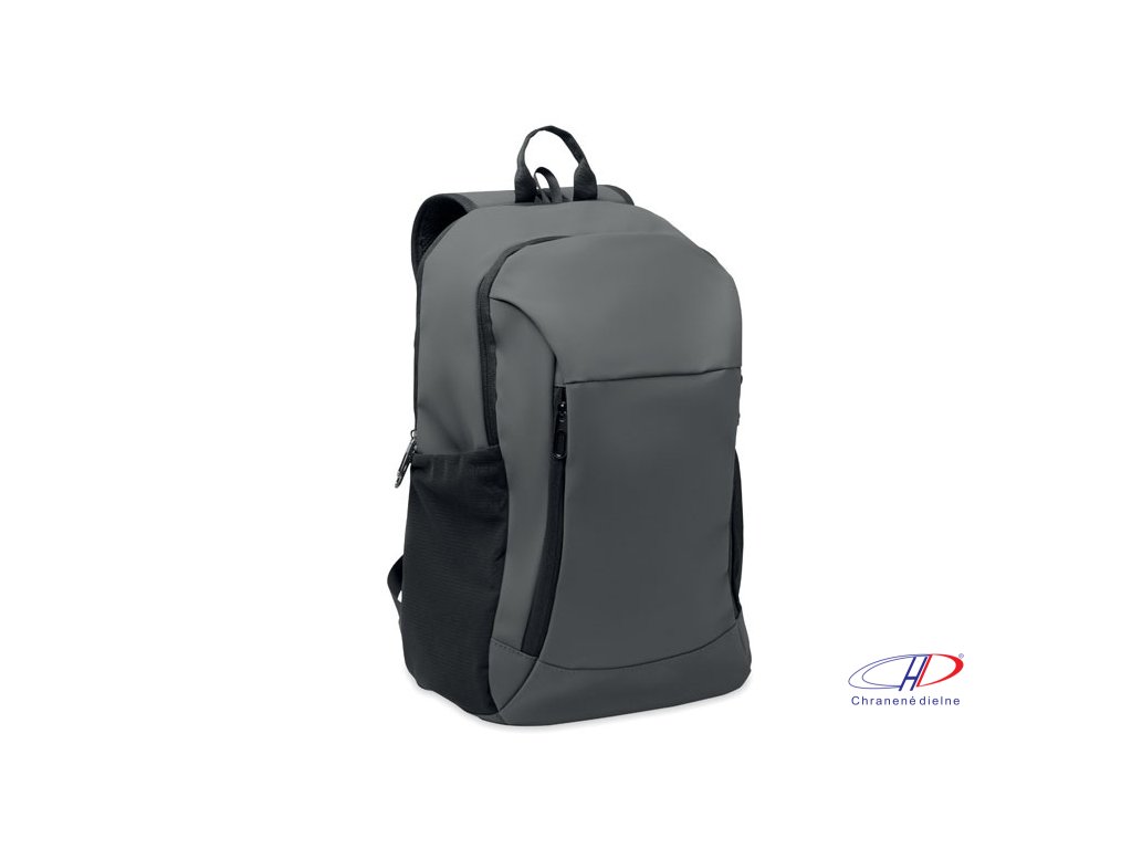 15-palcový batoh na notebook z mäkkej PU tkaniny s polstrovaným chrbtom a skrytým hlavným priestorom na zips. 1 predné vrecko na zips, 2 bočné vrecká na zips vpredu a 2 bočné vrecká z elastickej sieťoviny. S podšívkou z 210D RPET.Dodatočné parametre