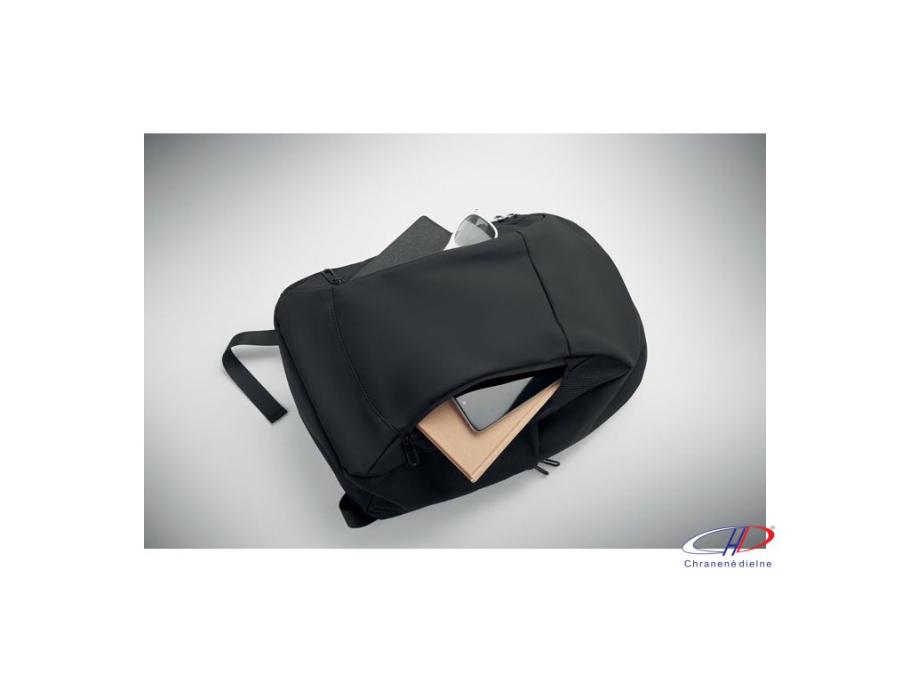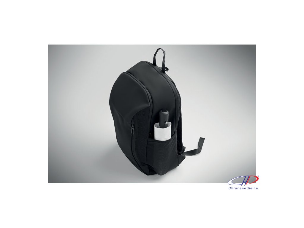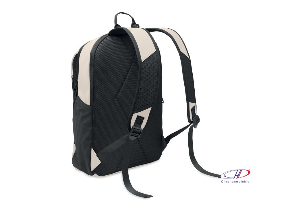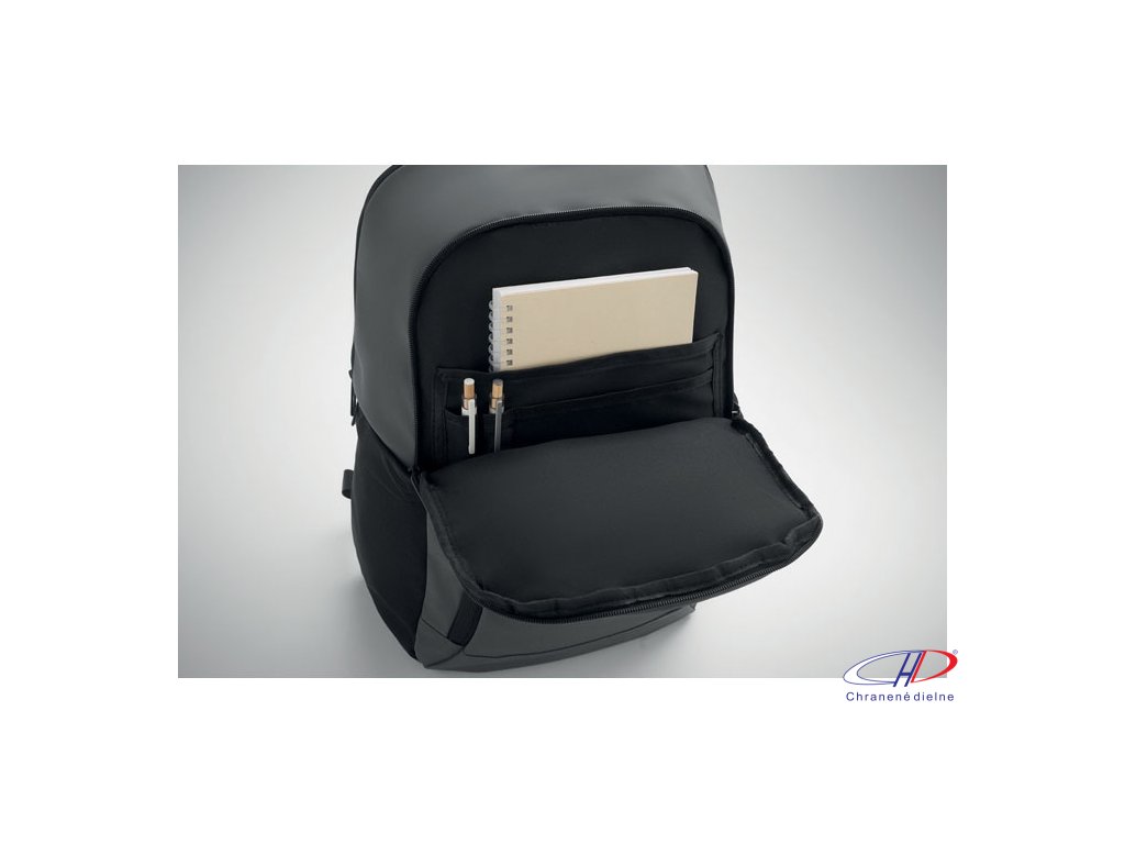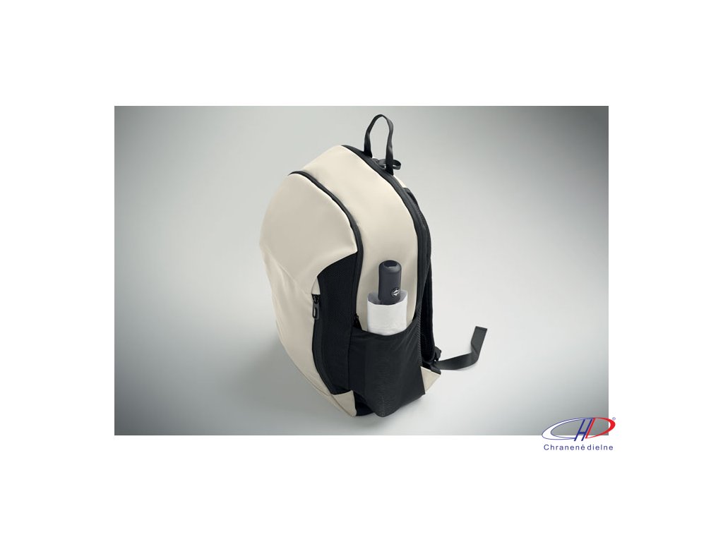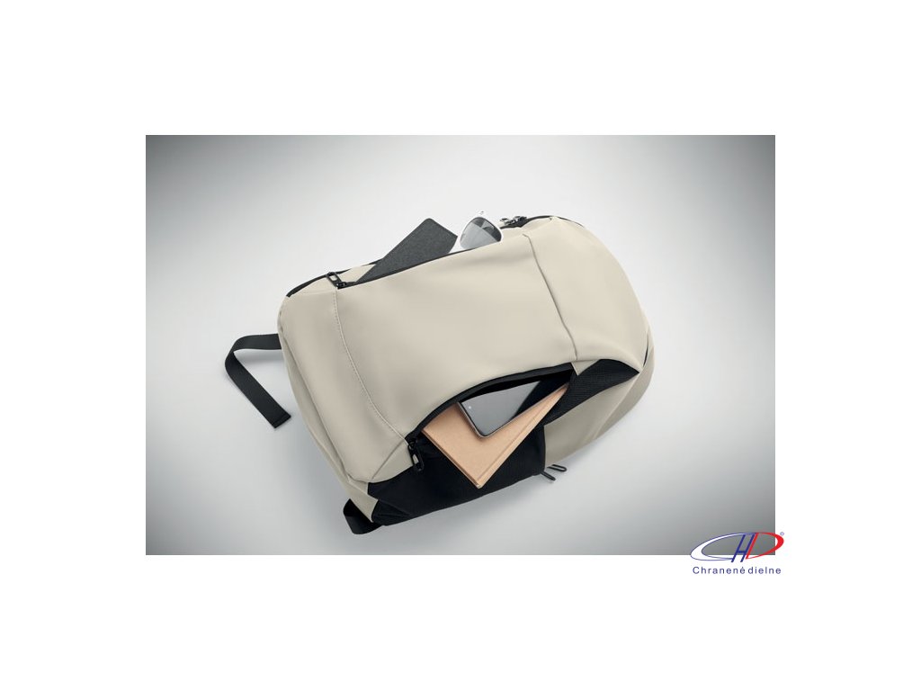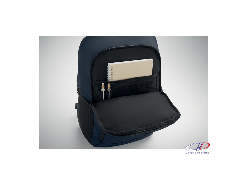 15-palcový batoh na notebook z mäkkej PU tkaniny s polstrovaným chrbtom a skrytým hlavným priestorom na zips. 1 predné vrecko na zips, 2 bočné vrecká na zips vpredu a 2 bočné vrecká z elastickej sieťoviny. S podšívkou z 210D RPET.Dodatočné parametre