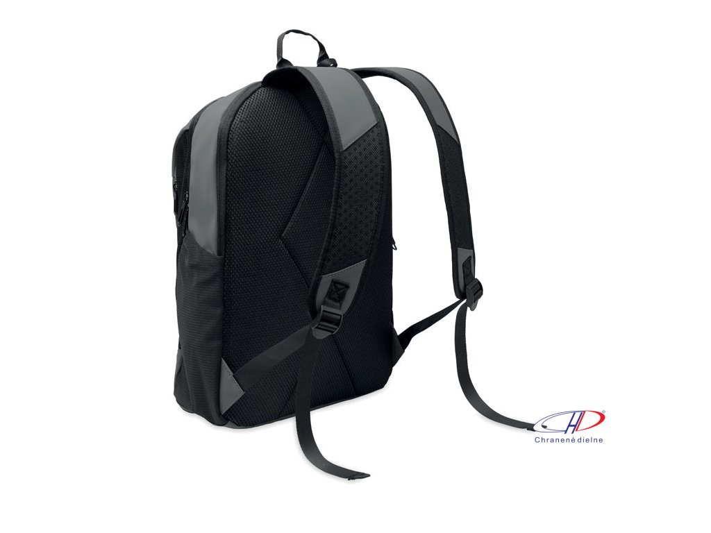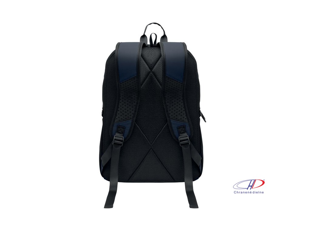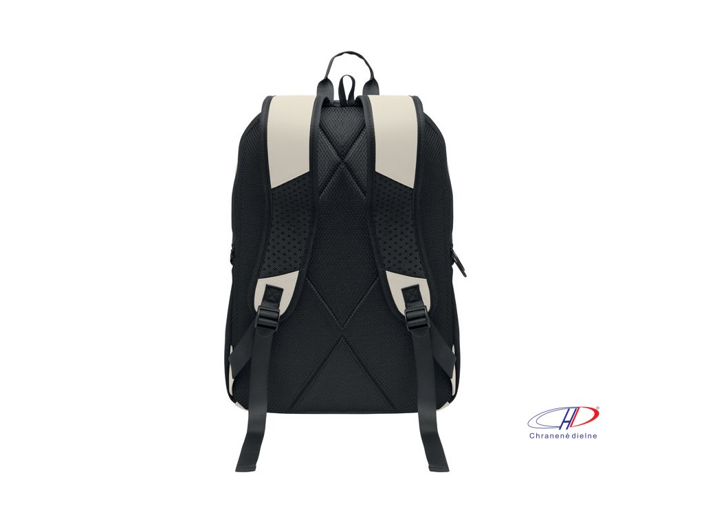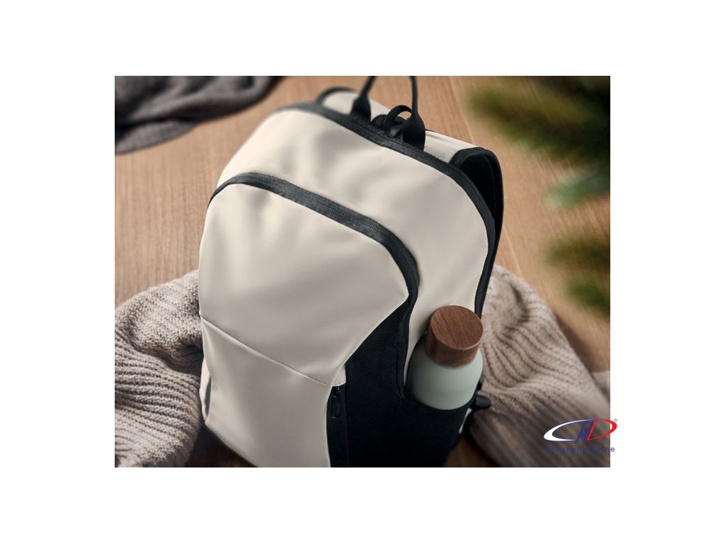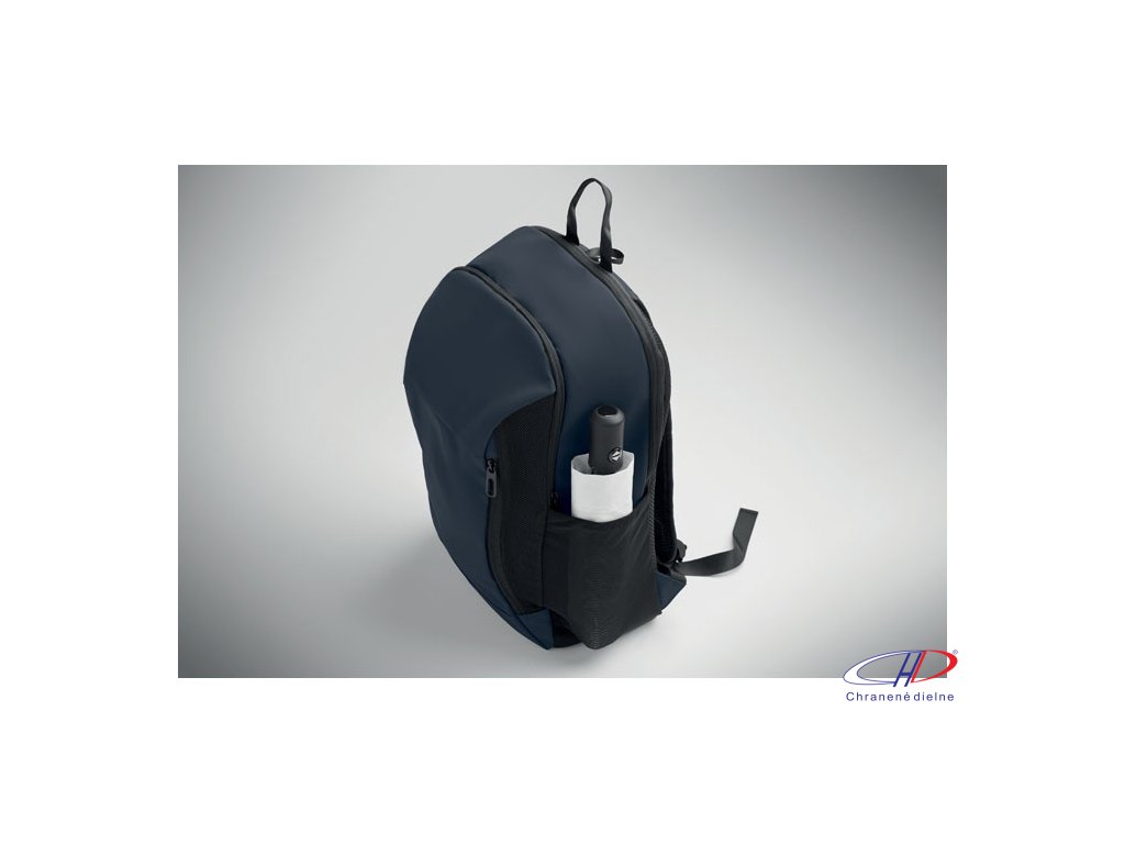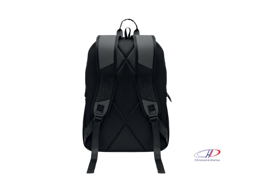 15-palcový batoh na notebook z mäkkej PU tkaniny s polstrovaným chrbtom a skrytým hlavným priestorom na zips. 1 predné vrecko na zips, 2 bočné vrecká na zips vpredu a 2 bočné vrecká z elastickej sieťoviny. S podšívkou z 210D RPET.Dodatočné parametre