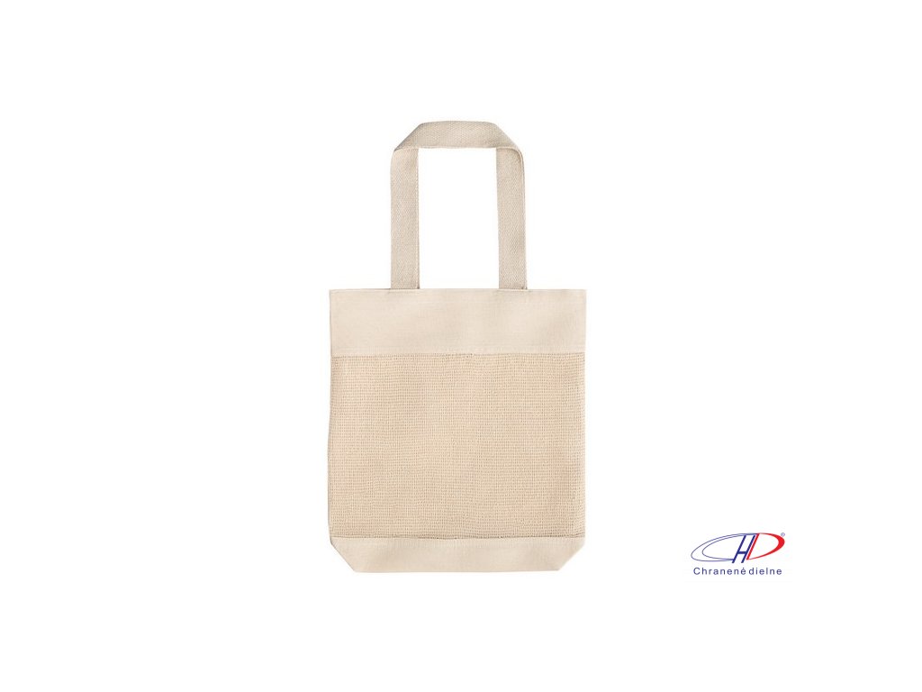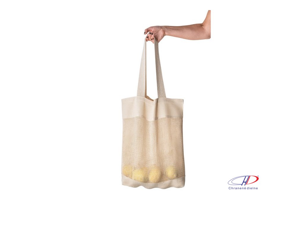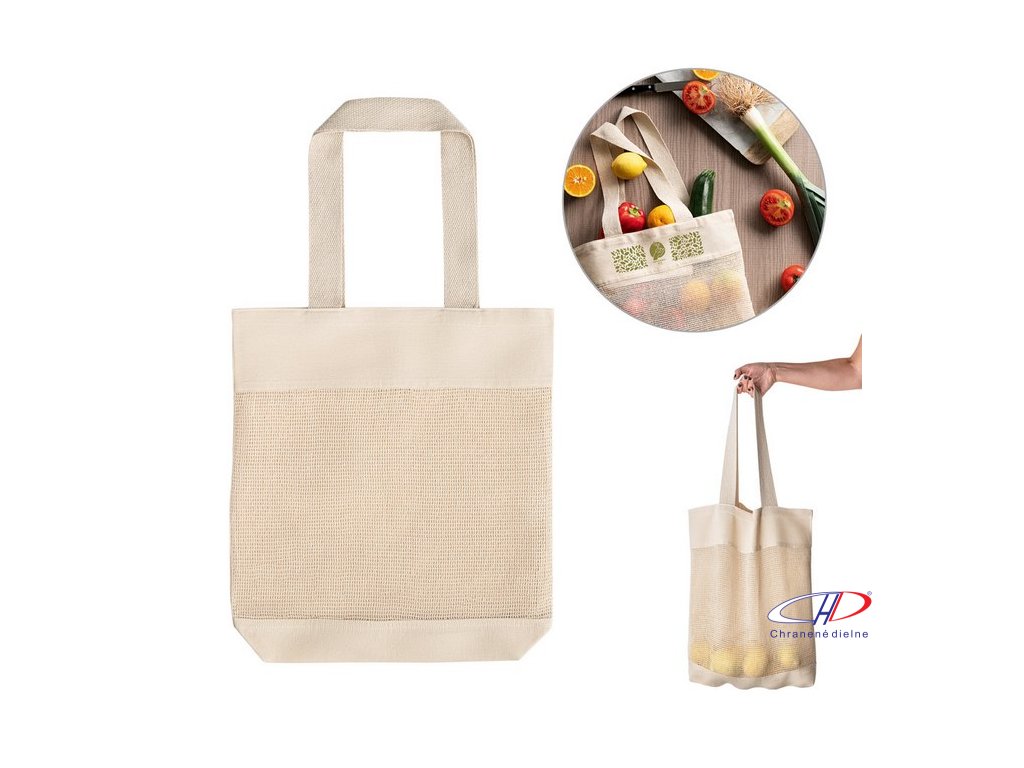 Taška zo 100% bavlny (180 g/m?) so sieťovinou zo 100% bavlny na prednej strane. Popruh s dĺžkou 65 cm. Ideálna taška na nákup. The additional information presented is indicative and may vary