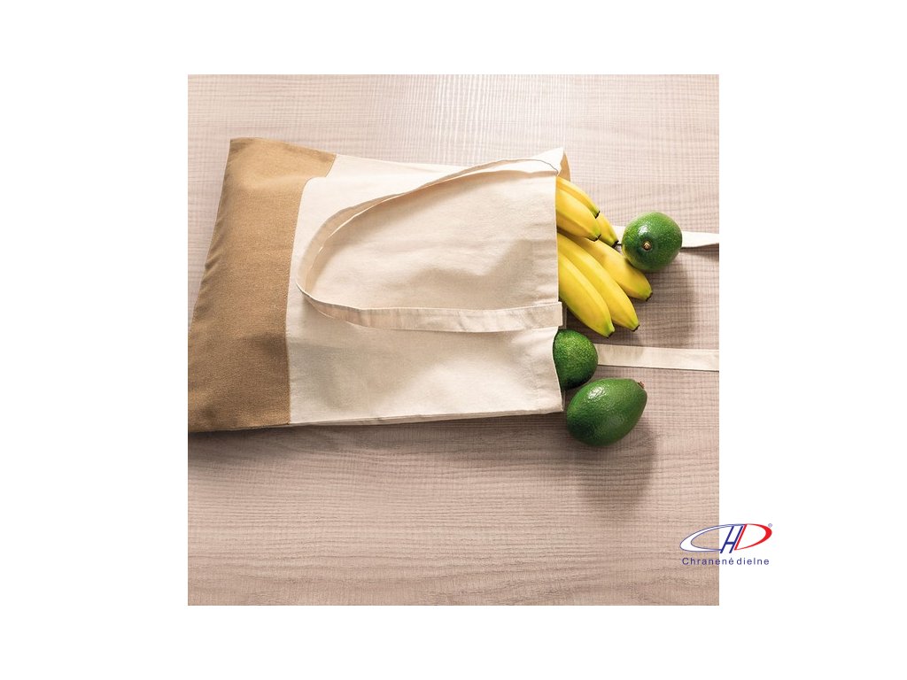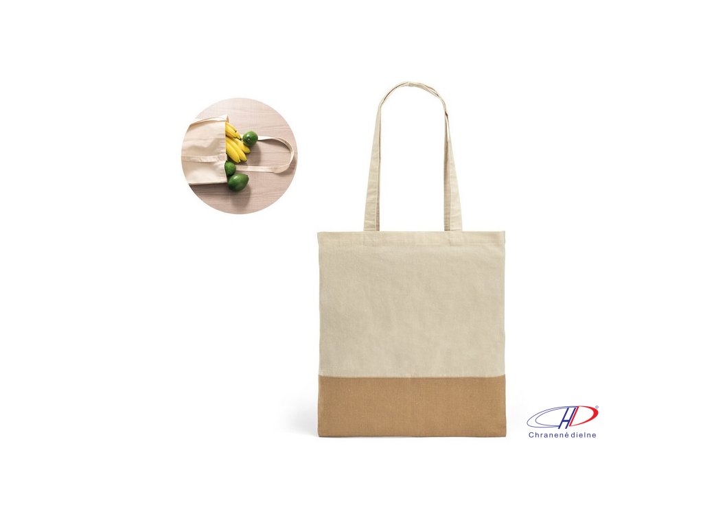 100% Bavlnená taška (160 g/m2) s detailmi z imitácie juty a 65cm dlhým uchom. 37,5 x 41,5 cm