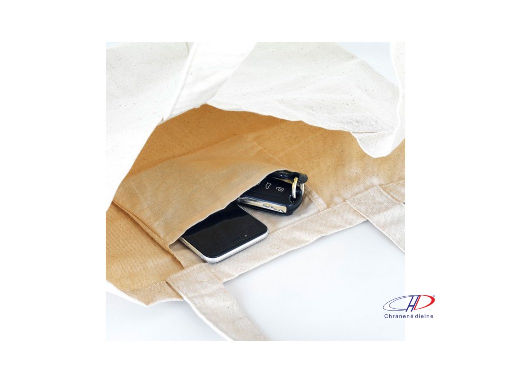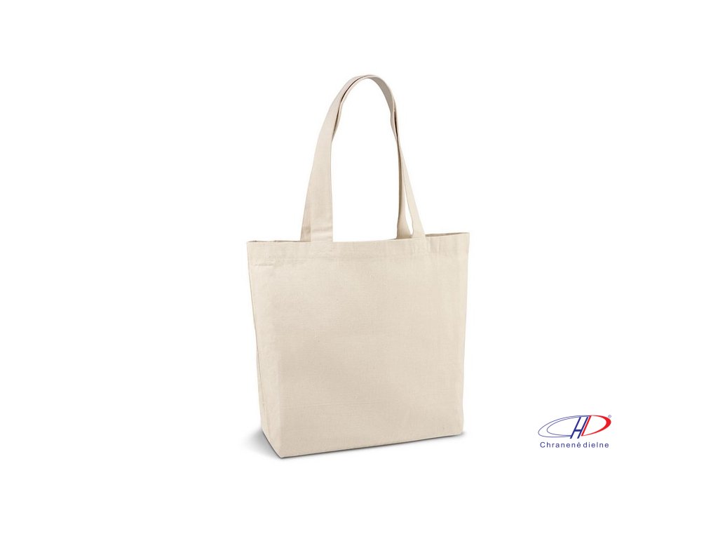 100 % bavlnená plátnová taška (280 g/m2) s vnútornou priehradkou a popruhom 65 cm. 45 x 38 x 10,5 cm