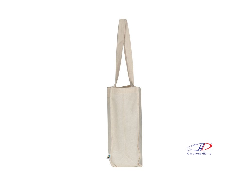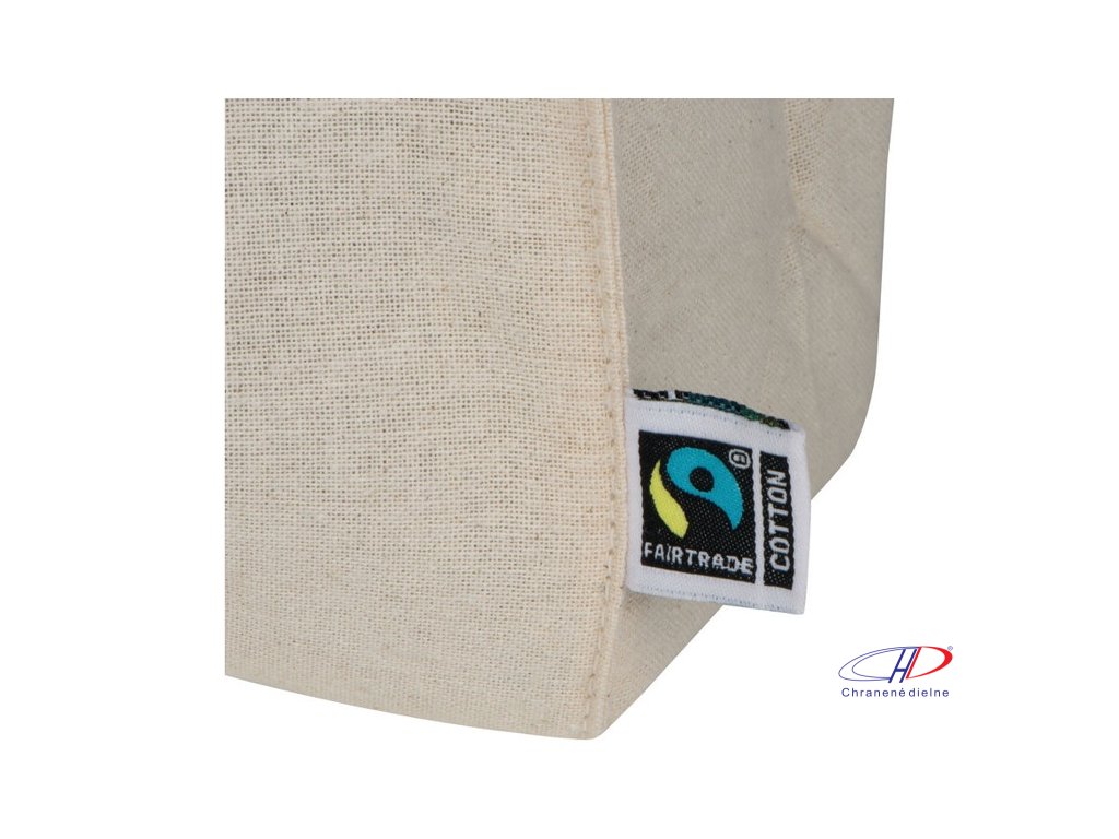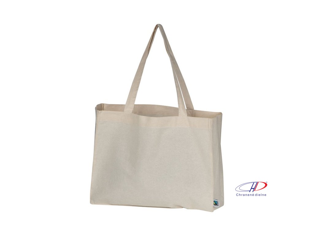 Veľká bavlnená nákupná taška Fairtrade (180 g/m2) s veľkým spodným klinom a štítkom Fairtrade.