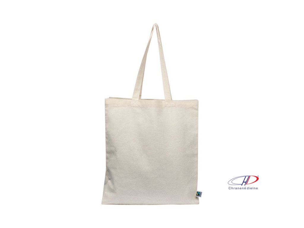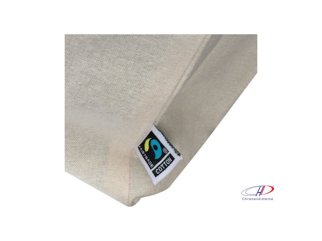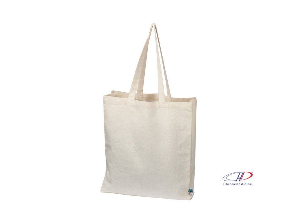 Bavlnená nákupná taška Faitrade (180 g/m2) s veľkým spodným klinom a štítkom Fairtrade.