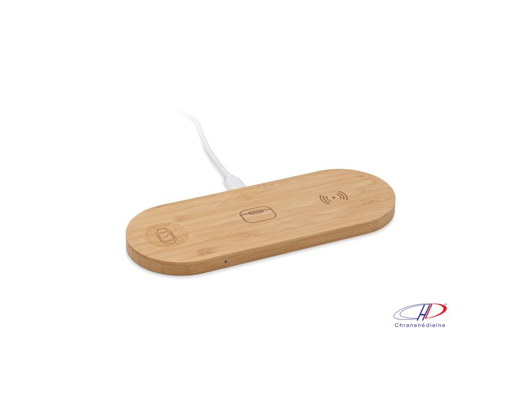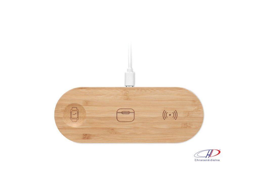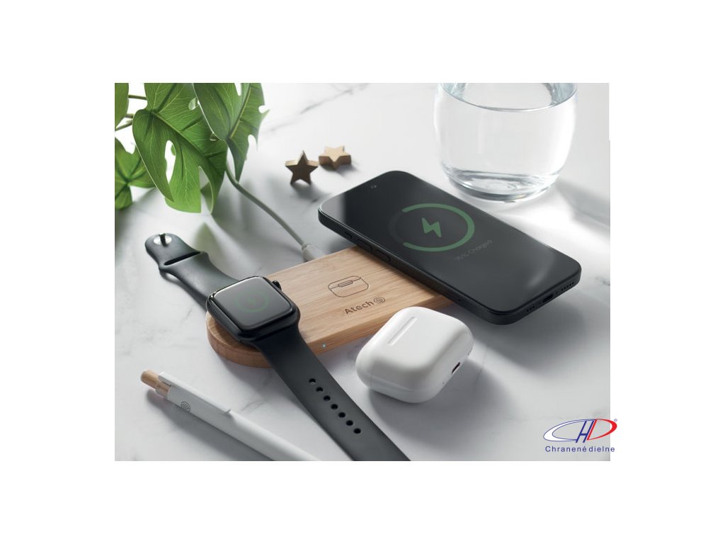 Nabíjacia stanica 3 v 1 v bambusovom puzdre. Obsahuje bezdrôtovú nabíjačku 15 W, nabíjačku pre inteligentné hodinky (iba Apple®) a TWS nabíjačku.Dodatočné parametre