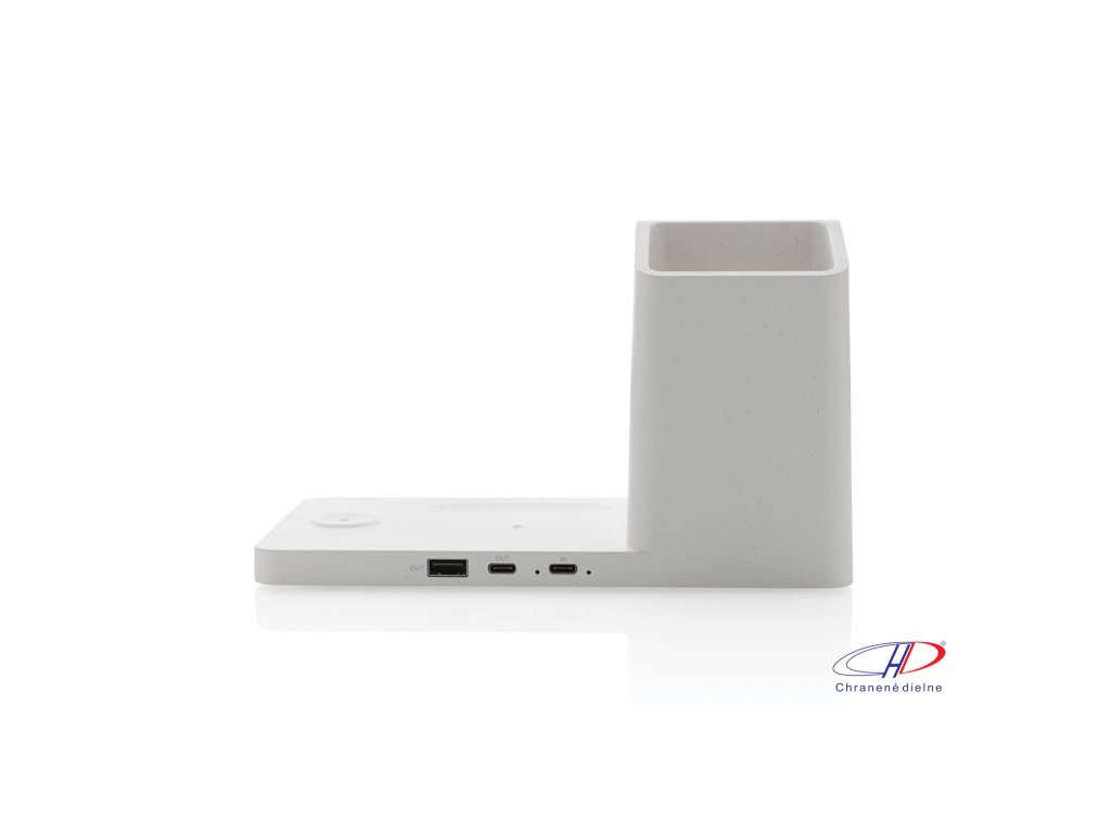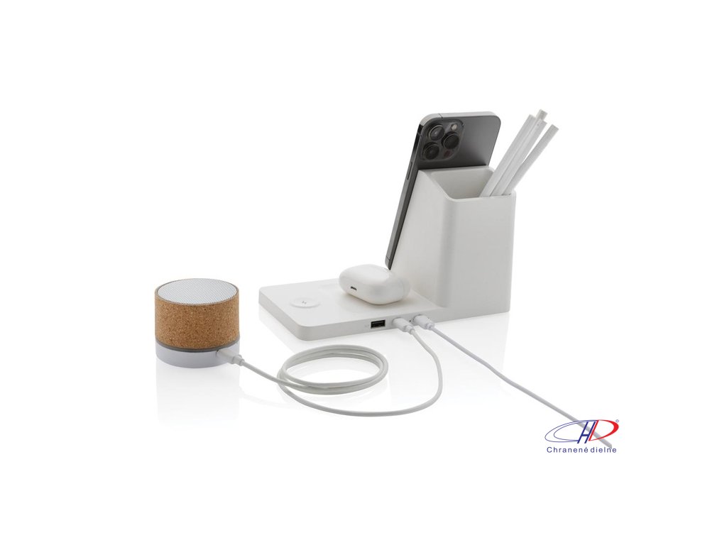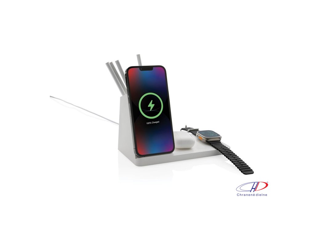 Univerzálna bezdrôtová nabíjacia stanica s výkonom 2,5W 5W a 15W pre 3 zariadenia so stojanom na perá. Port USB A a USB C na zadnej strane pre nabíjanie cez kábel. Celkový podiel recyklátu: 75%. Vrátane 120cm USB C nabíjacieho kábla. Produkt bez PVC.Dodatočné parametre