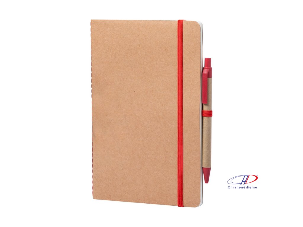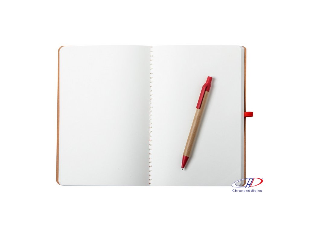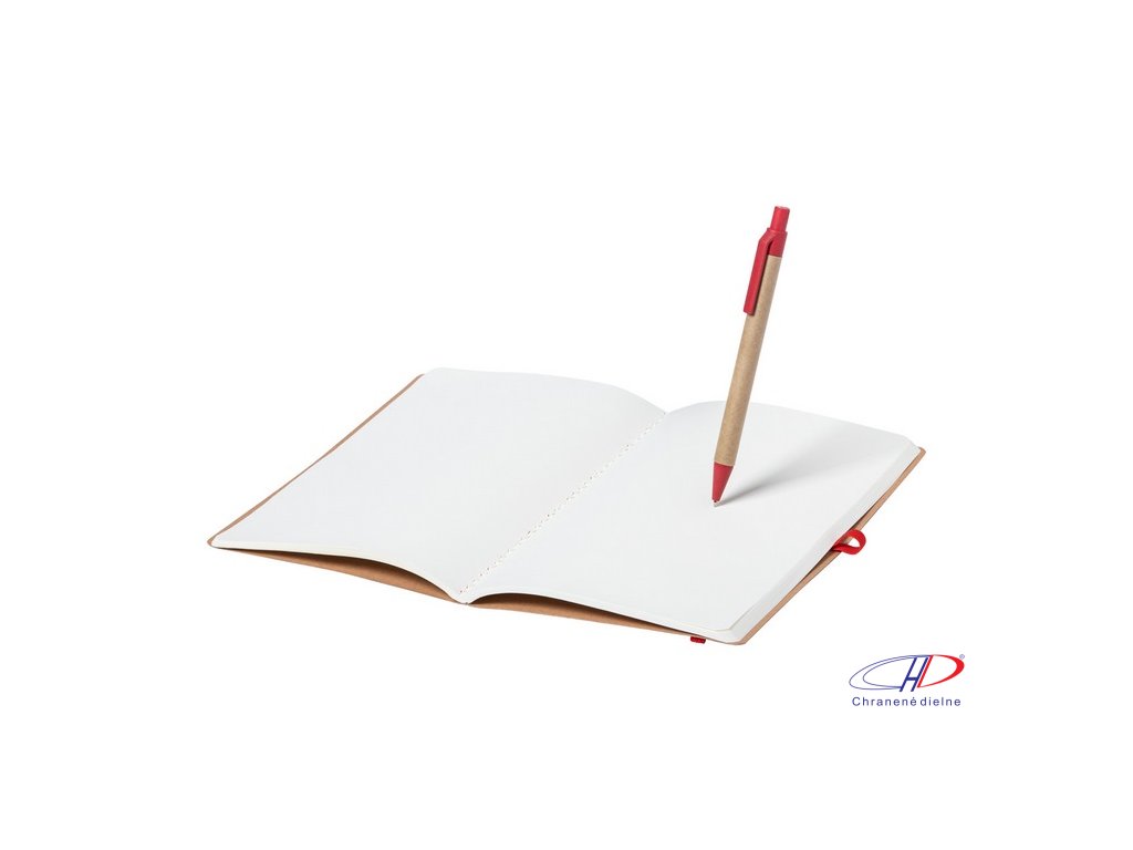 Blok A5 z recyklovaného kartónu s 60 čistými listami a farebnou gumičkou. Vrátane plastového guľôčkového pera z pšeničnej slamy s modrou náplňou.