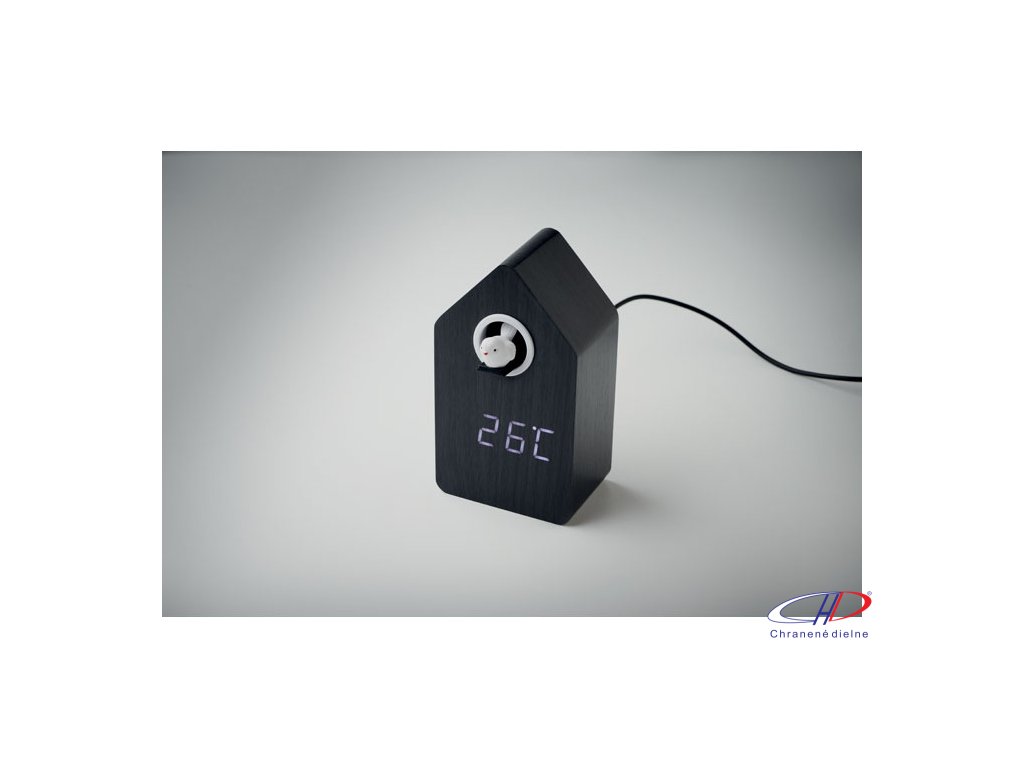 Kukučkové hodiny z MDF vrátane vstavaného budíka/ukazovateľa teploty. Vtáčik vyletí každú celú hodinu a počas budenia a má hlas vtáčej kukučky. Biely LED displej. Zvuk sa automaticky stlmí medzi 22:00 a 6:00. 5-minútové intervaly odloženia budenia.Dodatočné parametre