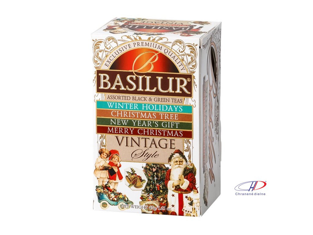 Kolekcia 25 čajov Basilur. Príchute: WINTER HOLIDAYS - čierny čaj (vanilka, jahoda, smetana), NEW YEAR´S GIFT - čierny čaj (čerešňa, mandle), CHRISTMAS TREE - zelený čaj (mango, mučenka, limeta), MERRY CHRISTMAS - čierny čaj (zázvor, med, vanilka).Dodatočné parametre