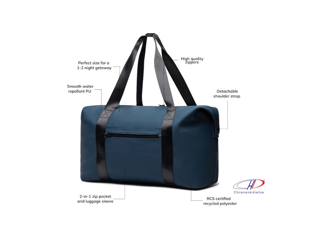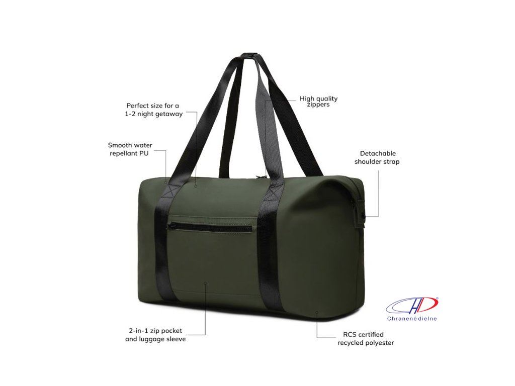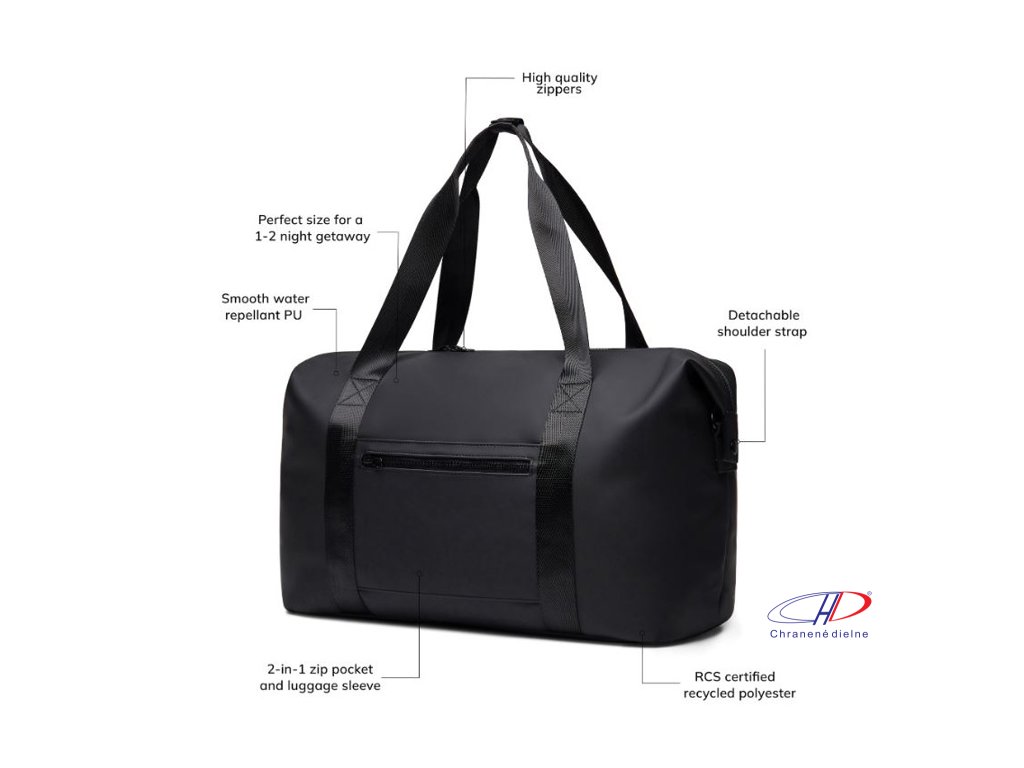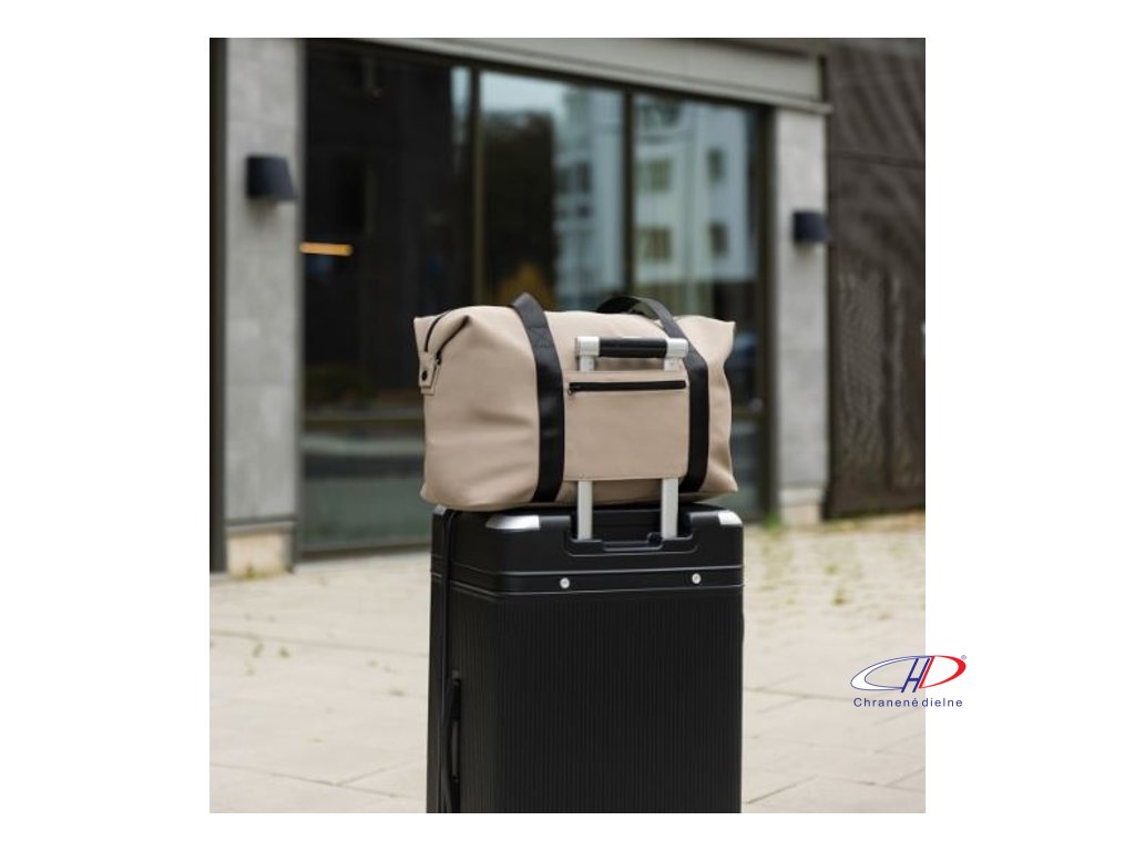 Víkendová taška z čiastočne recyklovaného polyesteru RCS s PU povlakom. Jednoducho pripevnite tašku na kufor pomocou vrecka na zips 2 v 1. Pohodlné popruhy, odnímateľný nastaviteľný ramenný popruh. Vo vnútri je menšie vrecko na zips. Podiel recyklátu: 20 %Dodatočné parametre