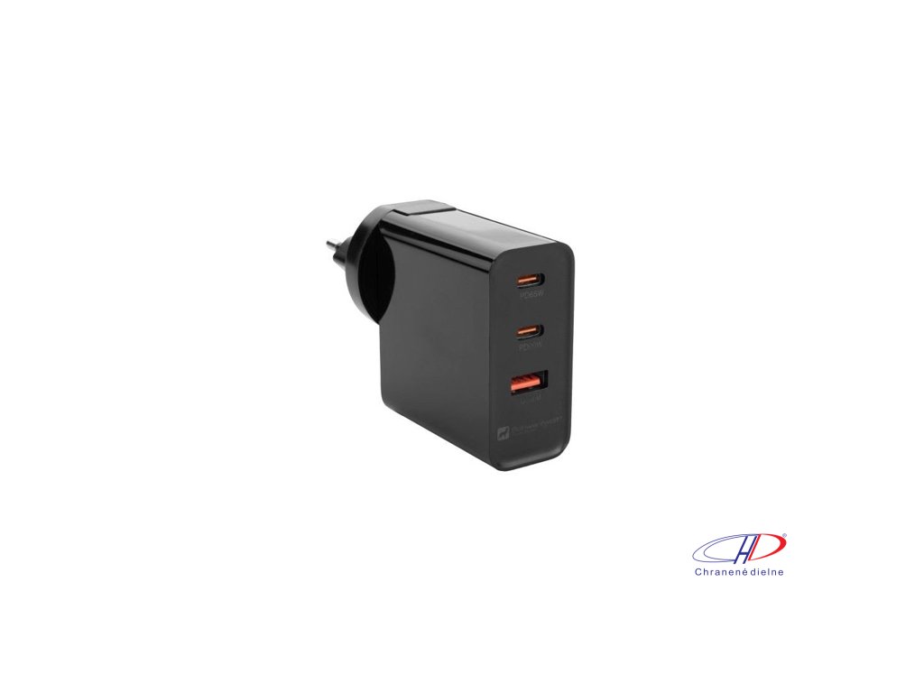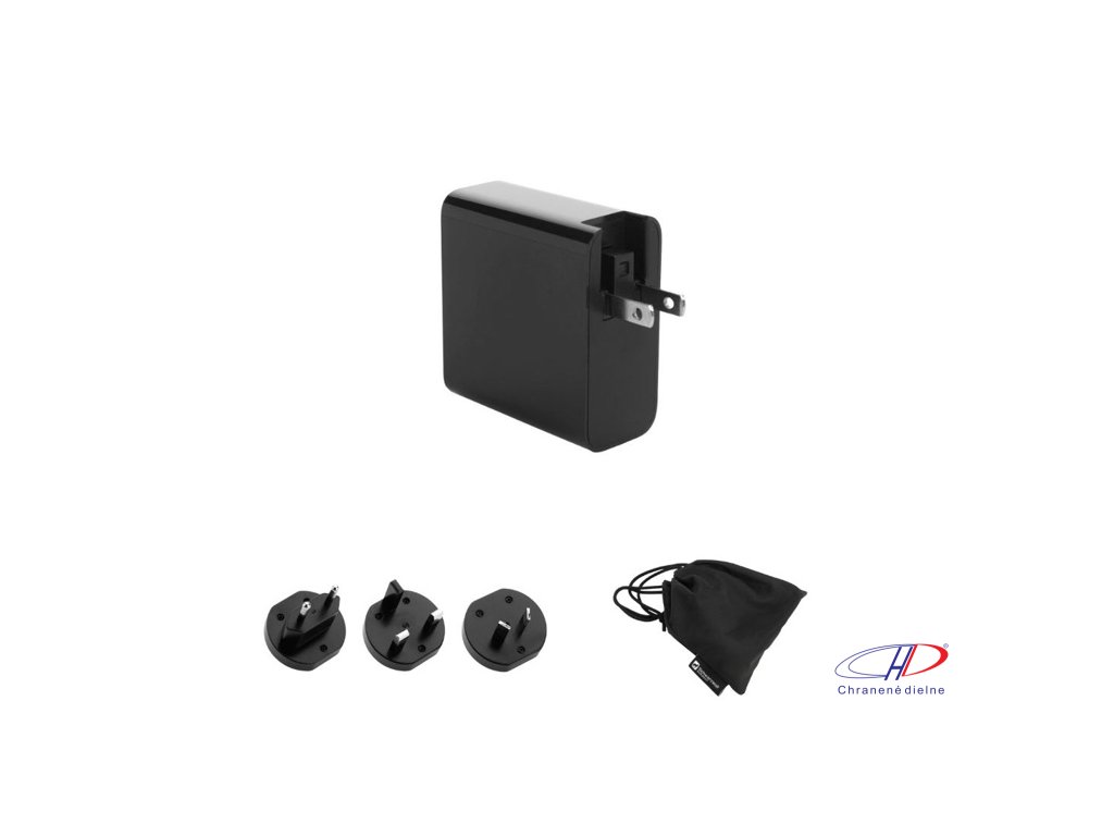 Cestovný adaptér 65W so 4 rôznymi zástrčkami (EÚ, Veľká Británia, Austrália/Nový Zéland, USA/Kanada). 3 USB vstupy (USB + 2 × USB typu C). Vstup AC 100V – 240V 50/60Hz, výstup PD 65W + PD20W + Q3.0. Balené v čiernom sťahovacom vrecku a darčekovej krabičke.Dodatočné parametre