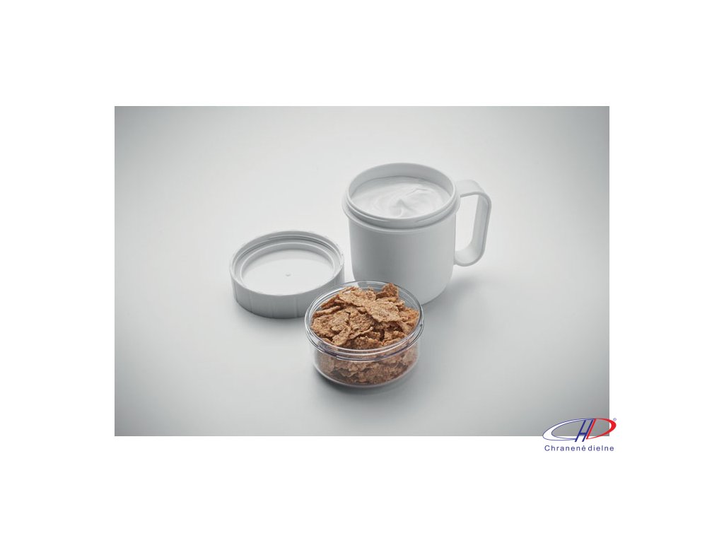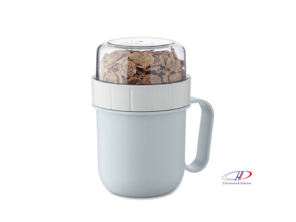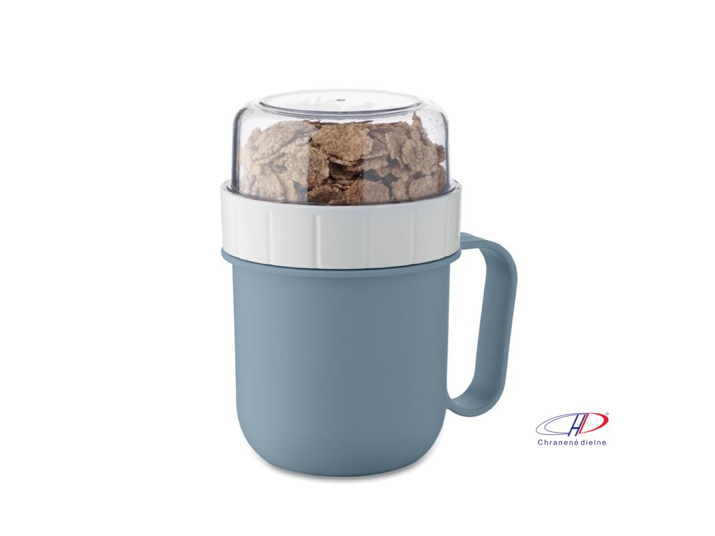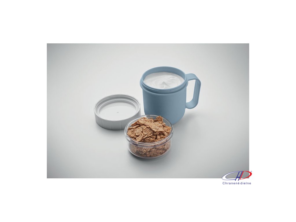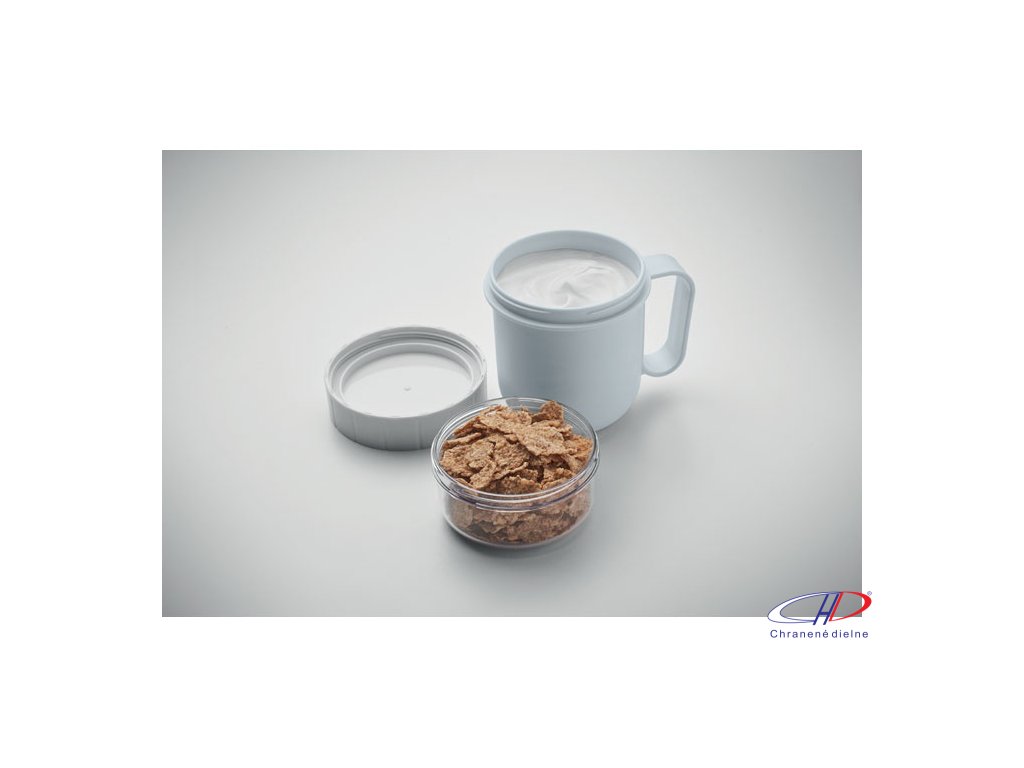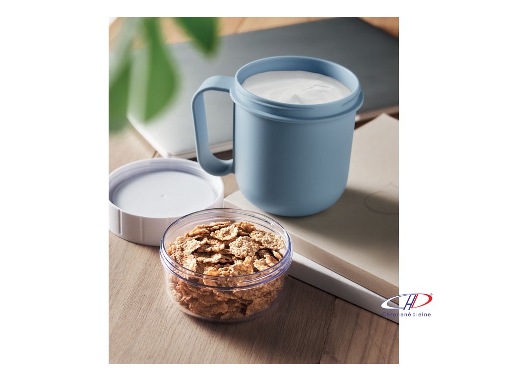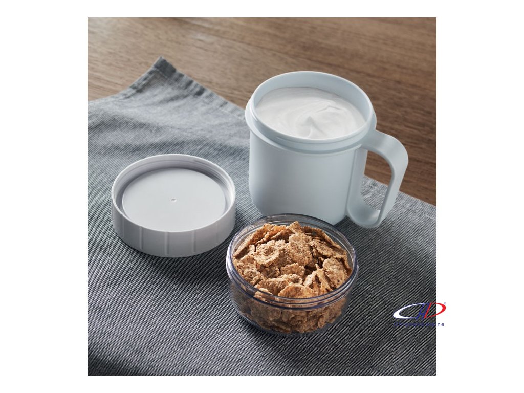 Raňajkový pohár na cesty v nádobe s viečkom z PP a PS. Skladá sa z 2 samostatných nádob na oddelenie ingrediencií. Objem: 450 ml a 160 ml.Dodatočné parametre