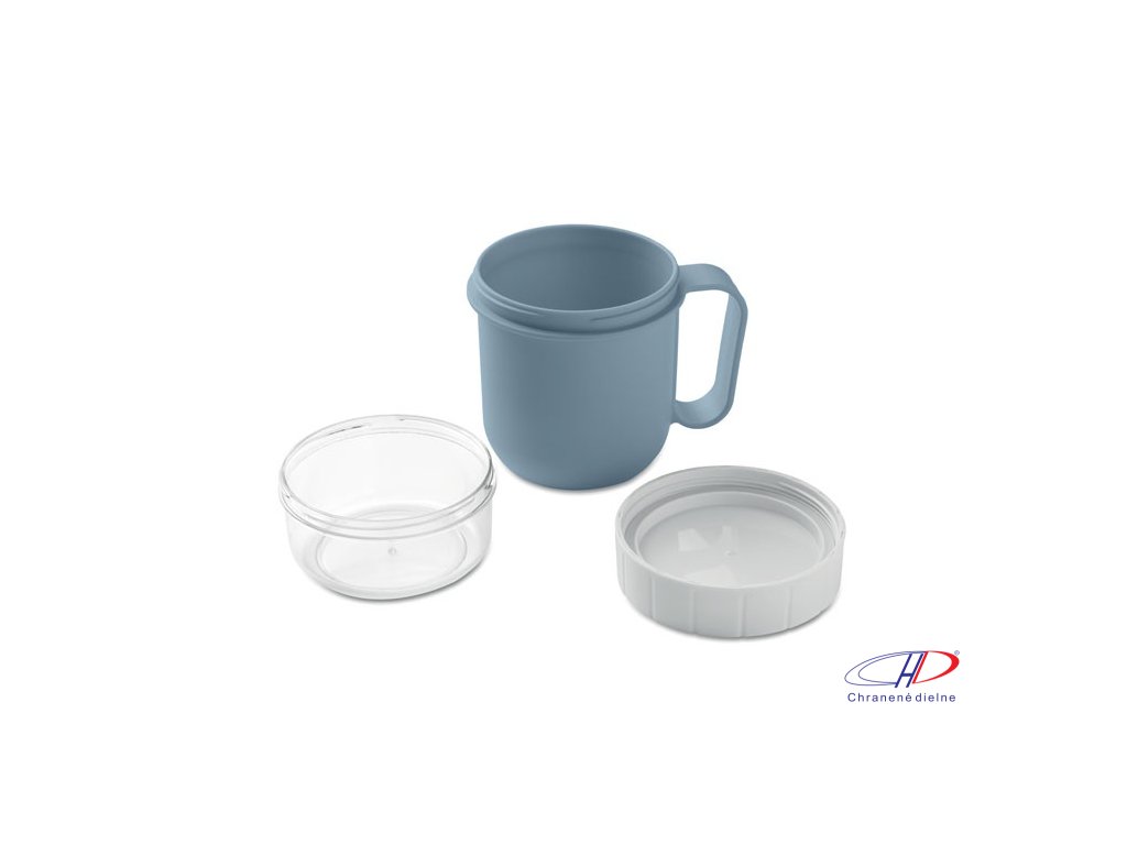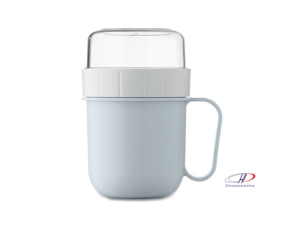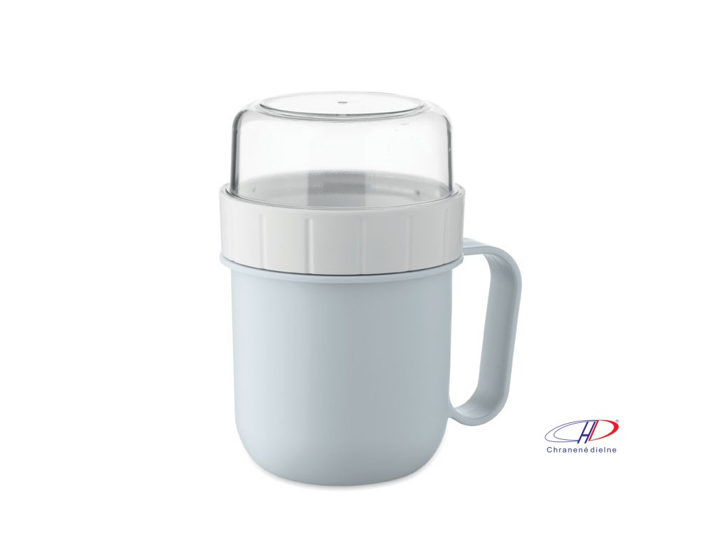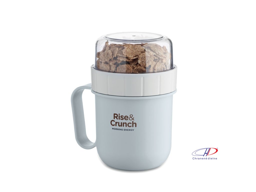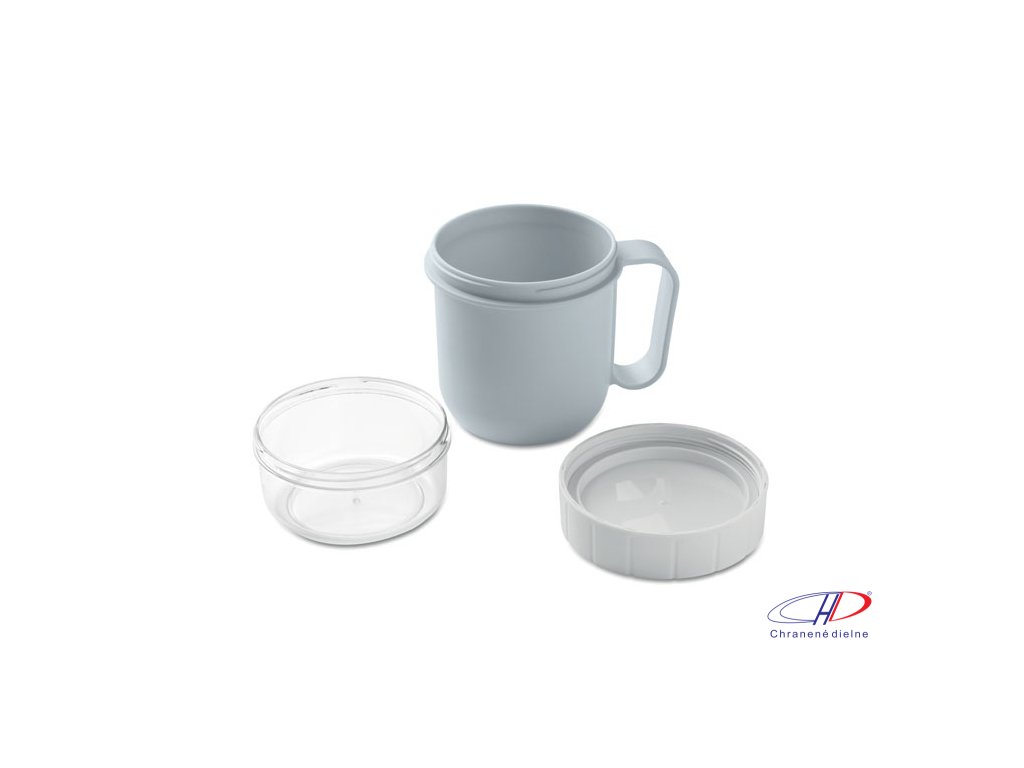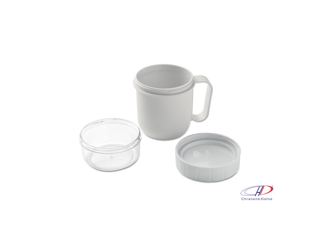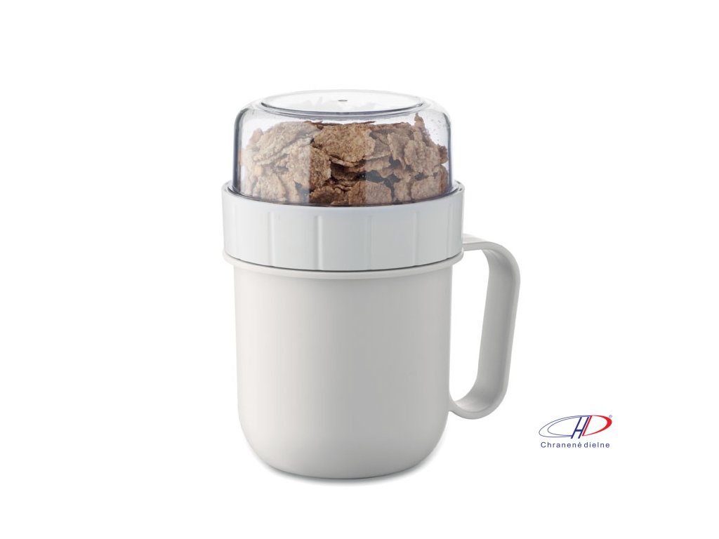 Raňajkový pohár na cesty v nádobe s viečkom z PP a PS. Skladá sa z 2 samostatných nádob na oddelenie ingrediencií. Objem: 450 ml a 160 ml.Dodatočné parametre