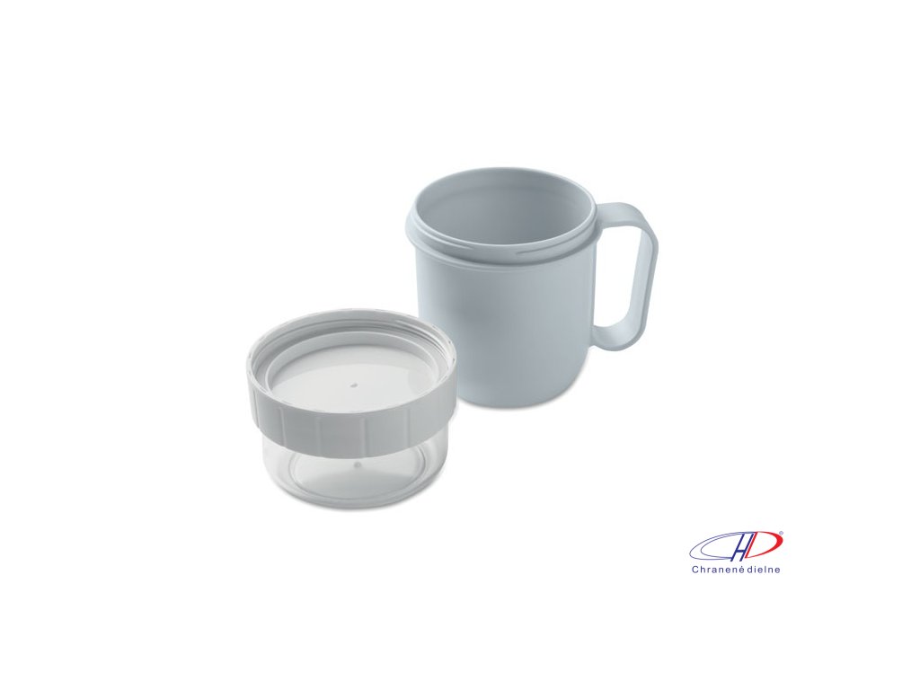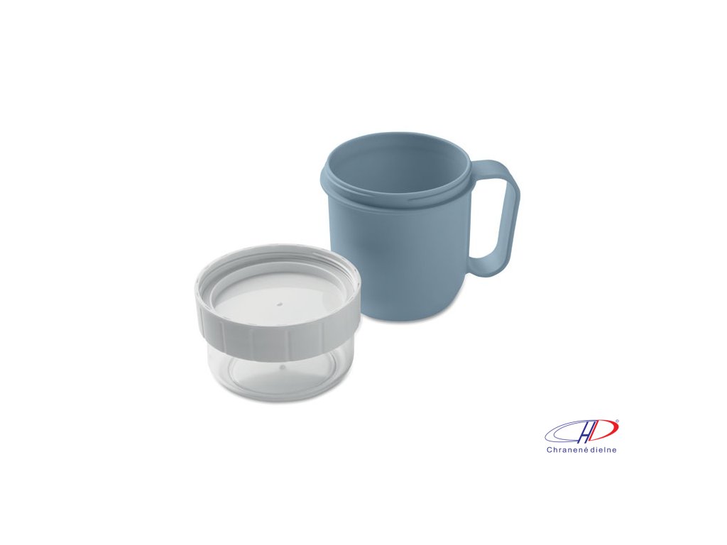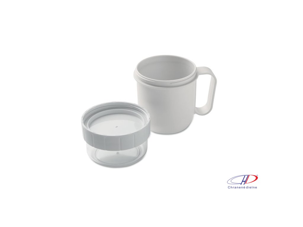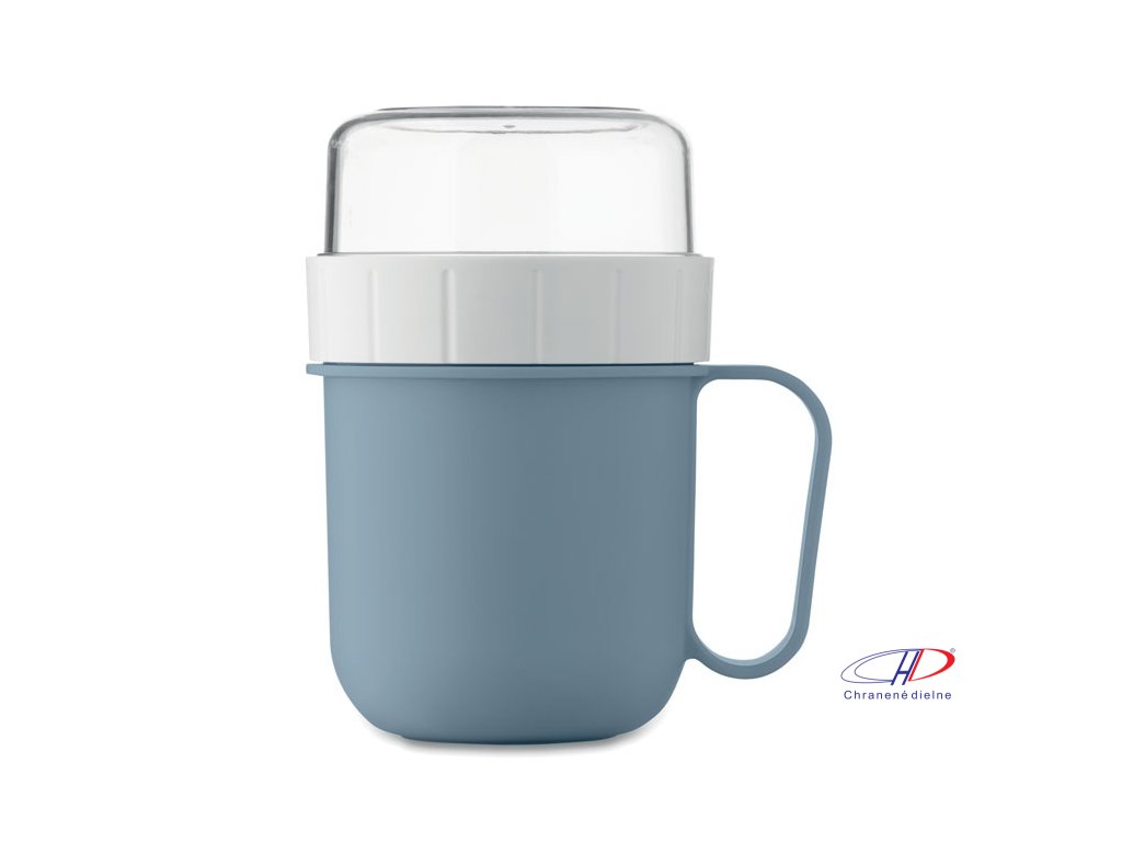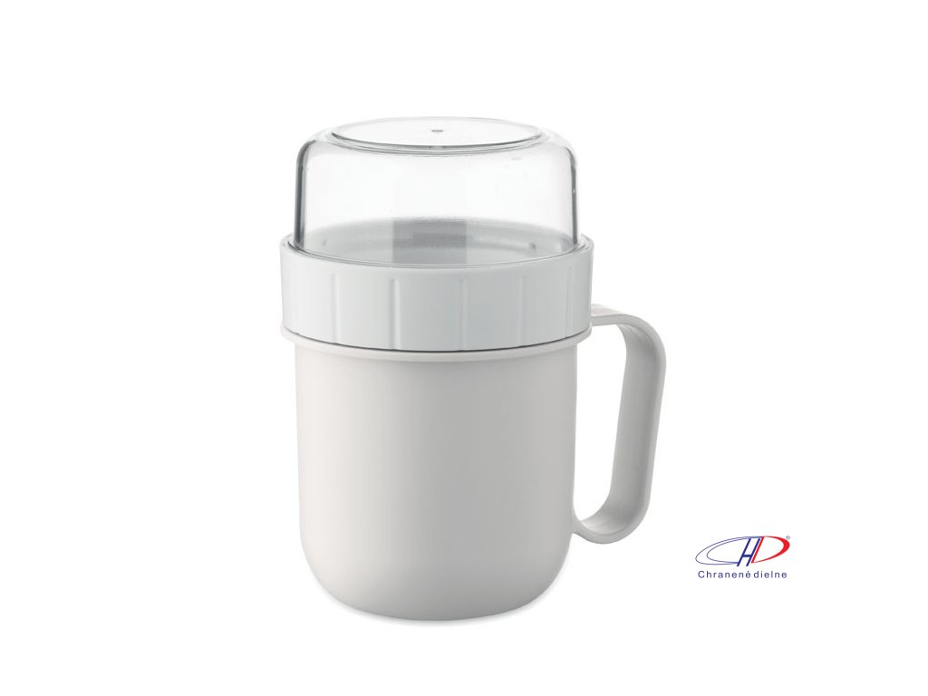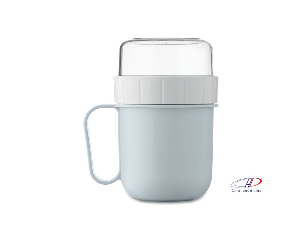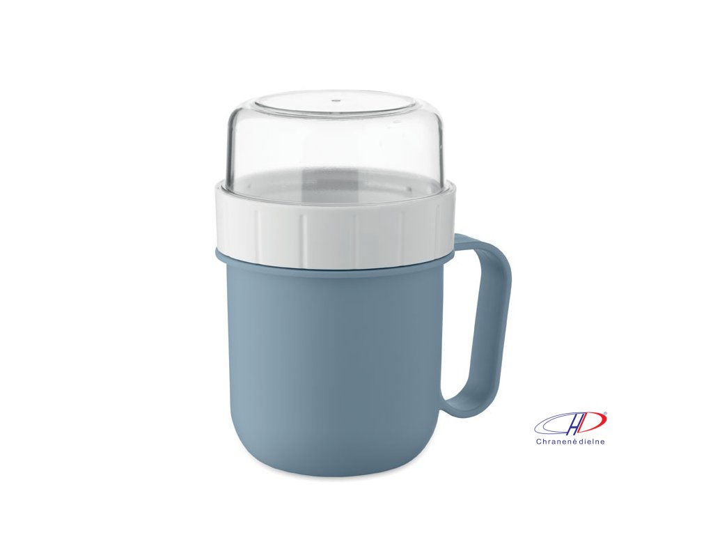 Raňajkový pohár na cesty v nádobe s viečkom z PP a PS. Skladá sa z 2 samostatných nádob na oddelenie ingrediencií. Objem: 450 ml a 160 ml.Dodatočné parametre
