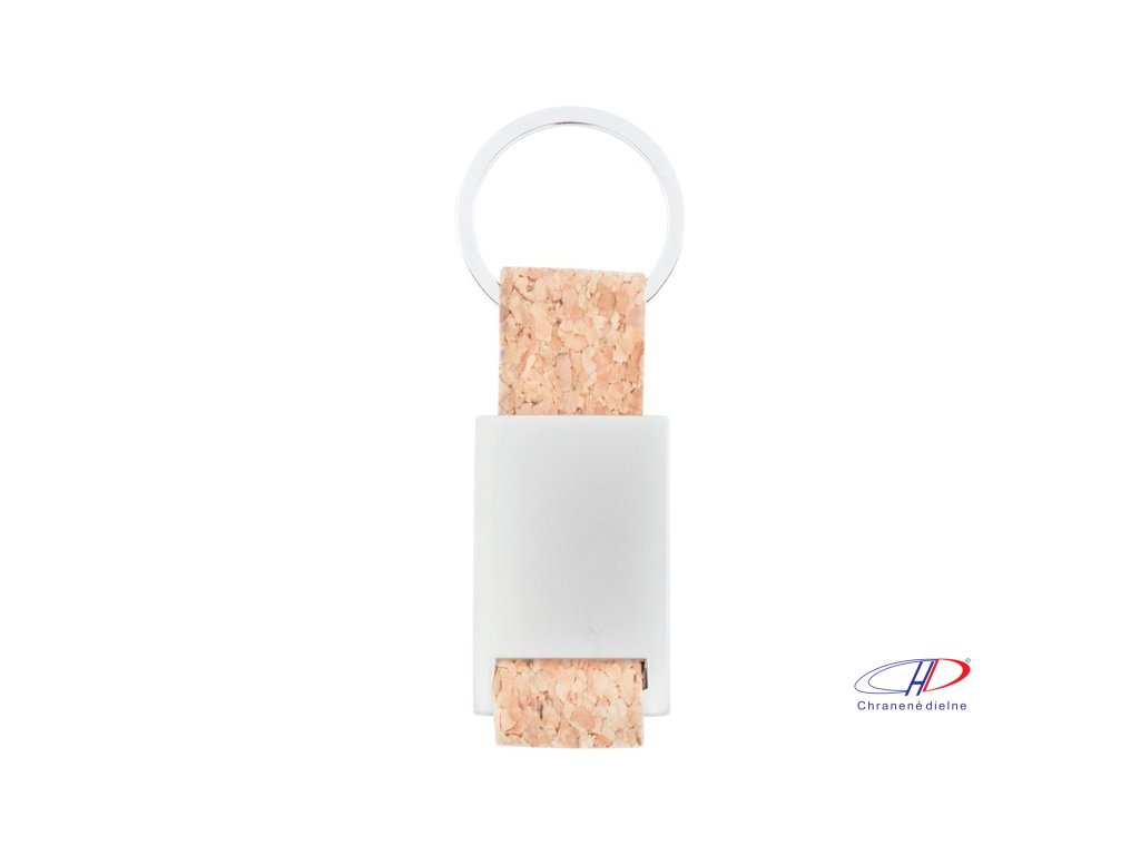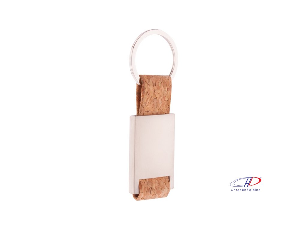 Obdĺžnikový kovový prívesok na kľúče s remienkom z prírodného korku a kovovým krúžkom.Doplňkové parametry