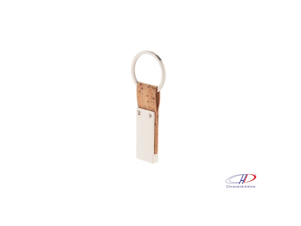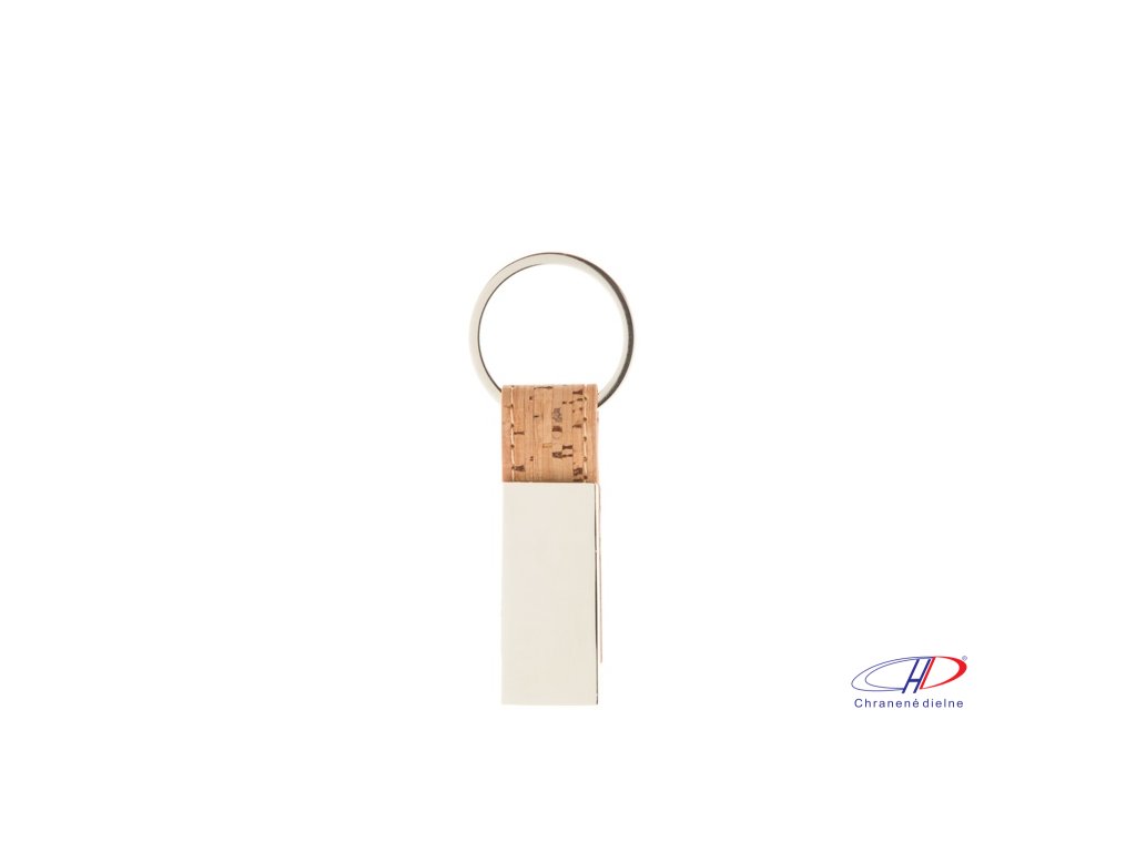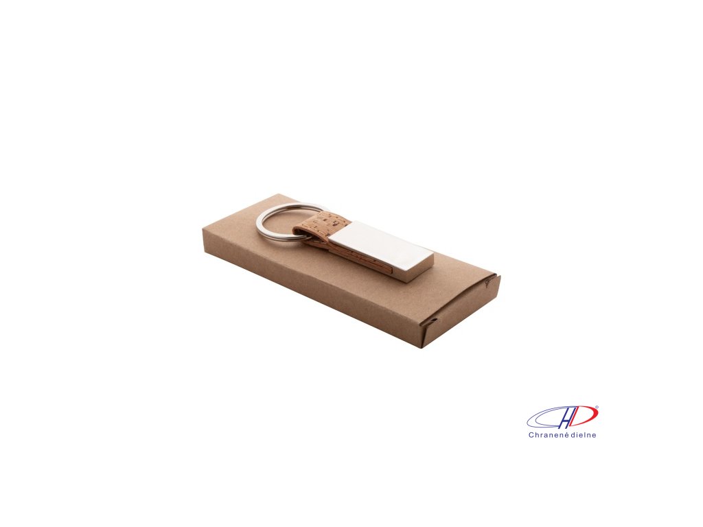 Obdĺžnikový kovový prívesok na kľúče s prírodným korkom a remienkom z PU kože. Dodávané v papierovej krabičke.Doplňkové parametry