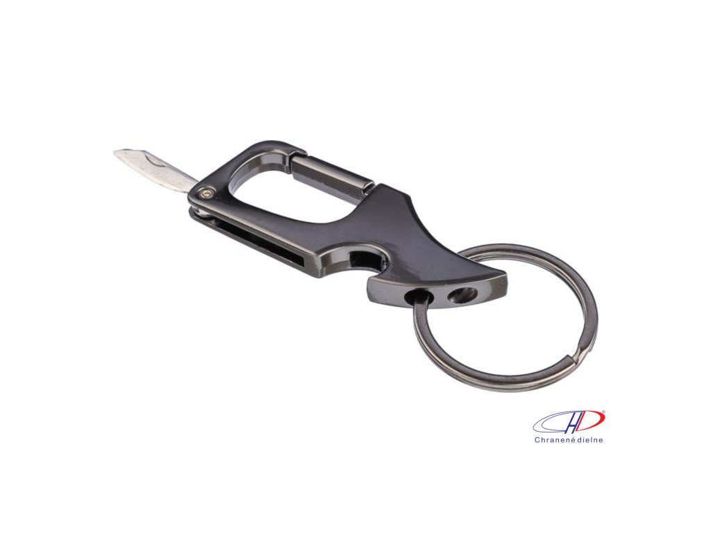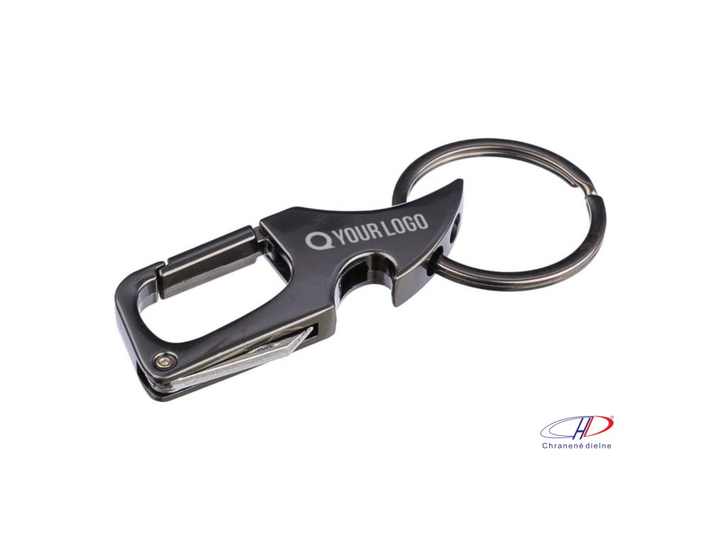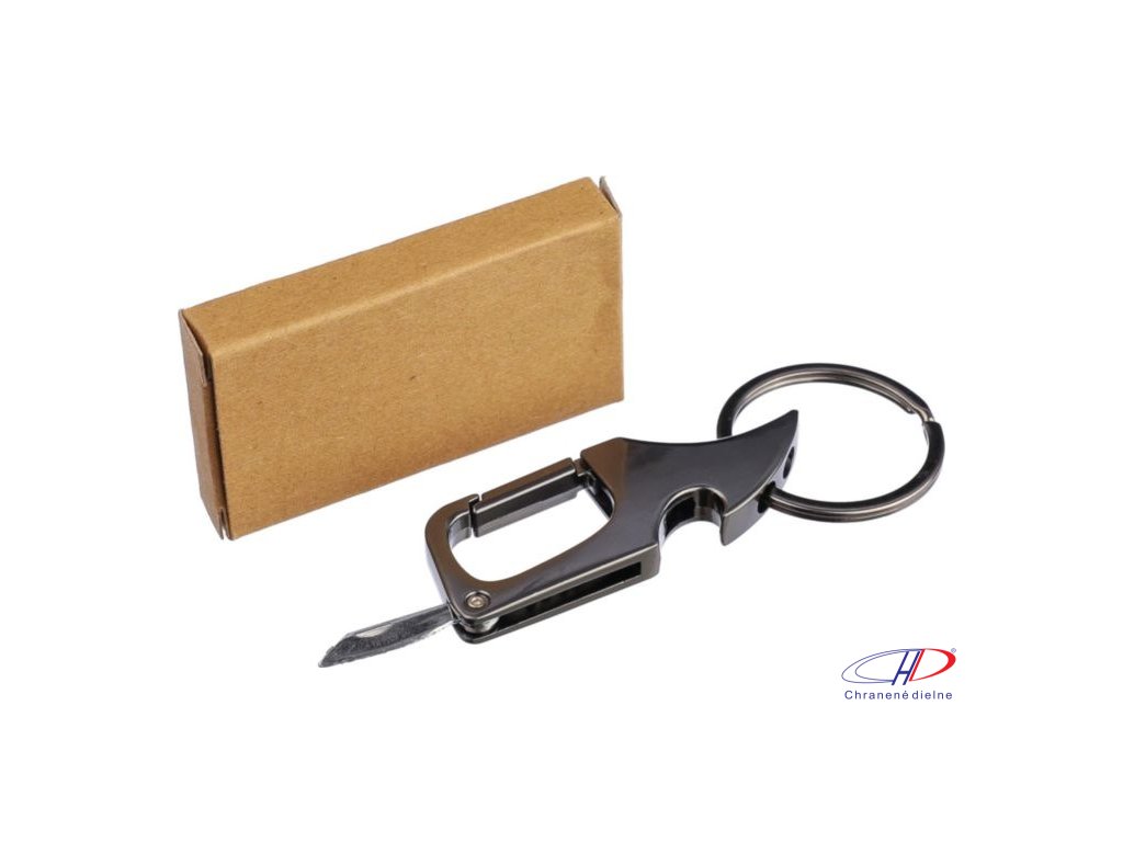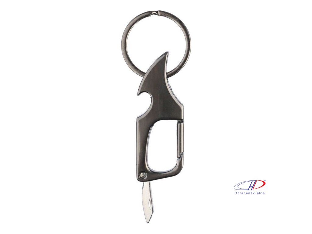 Kovová kľúčenka s karabínkou s otváračom na fľaše a malým nožíkom. Kov kľúčenky je elektrolyzovaný. Jednotlivo balené v hnedom papierovom vrecku.