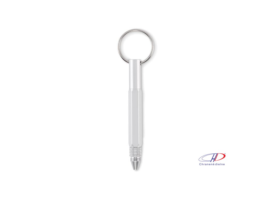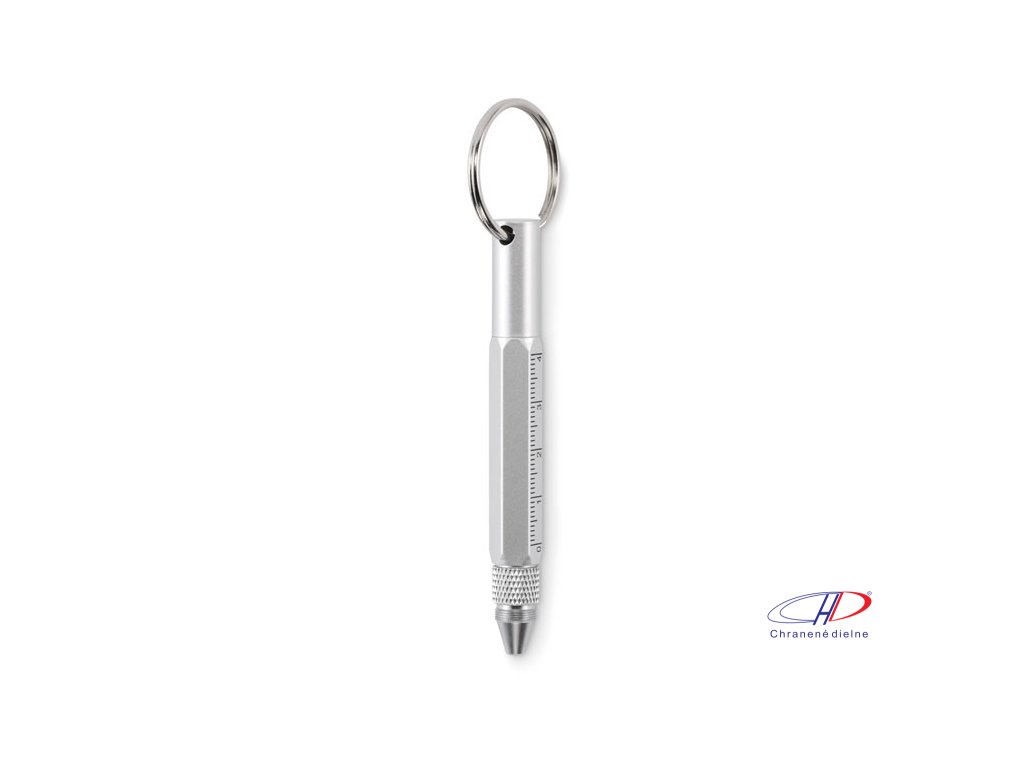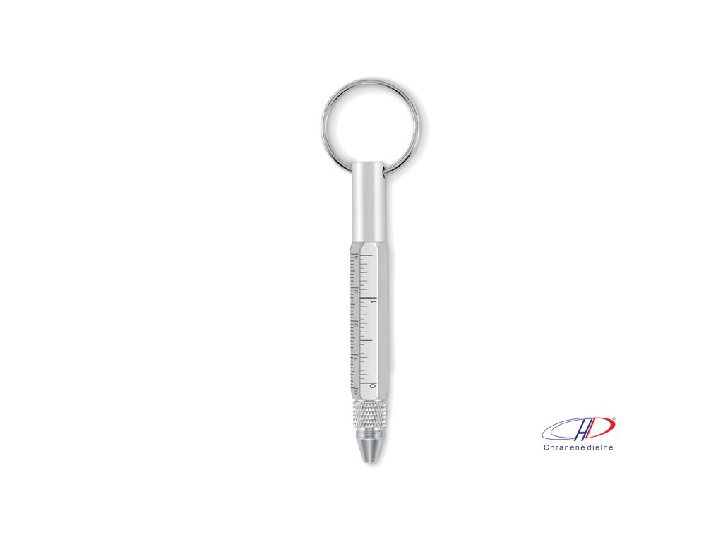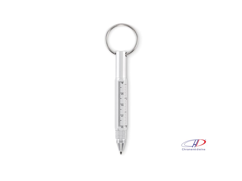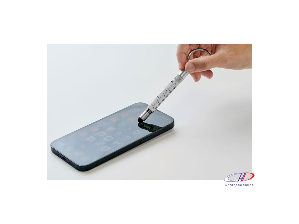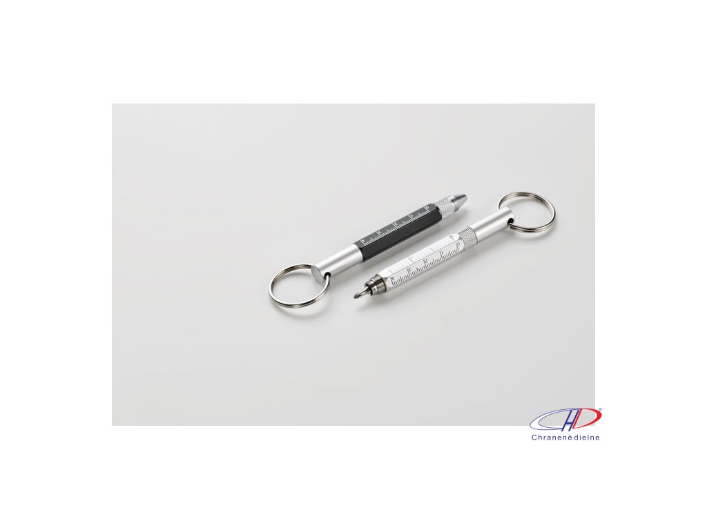 Kľúčenka s otočným perom z recyklovaného hliníka so 4 cm/1,5 palcovým pravítkom, dotykovým perom a krížovým skrutkovačom 2 v 1 a plochým skrutkovačom. Čierna nápň.