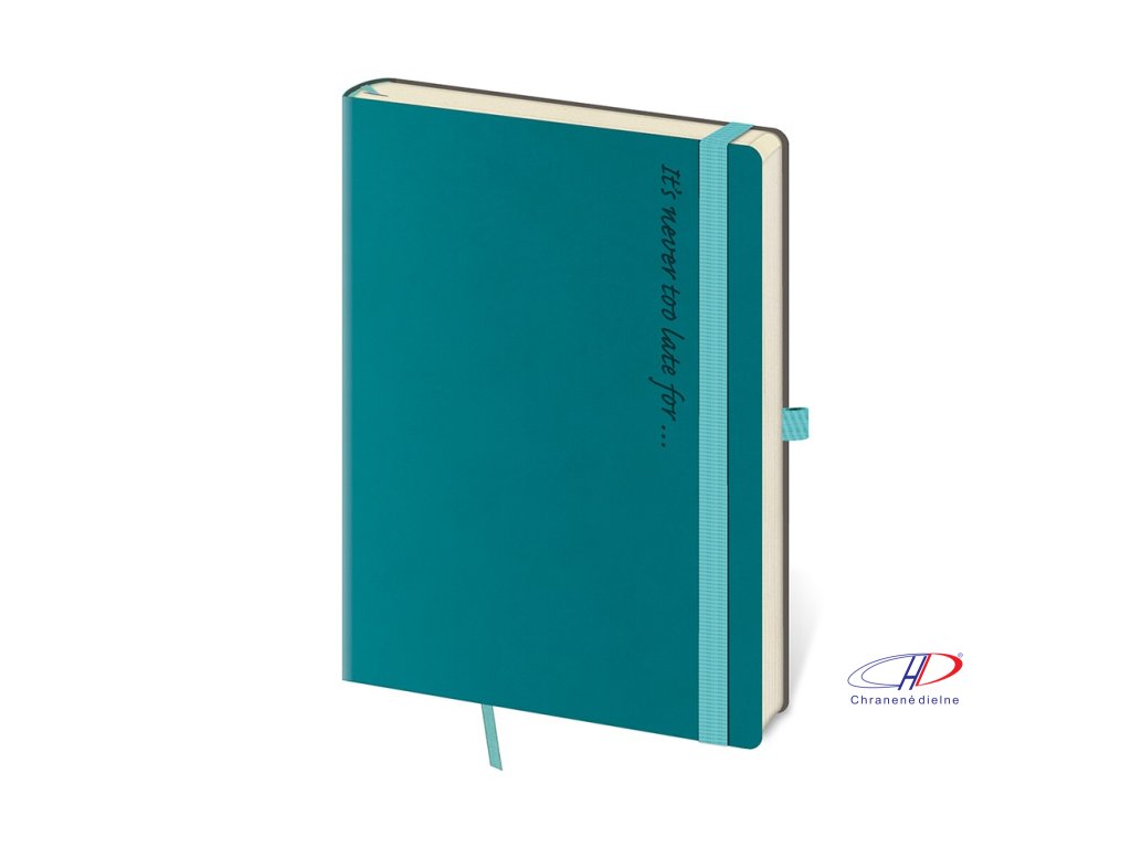 Linajkové strany (bodkované linajky). Pútko na pero a praktická papierová kapsička vzadu. 3 hárky samolepiek pre vlastné použitie.